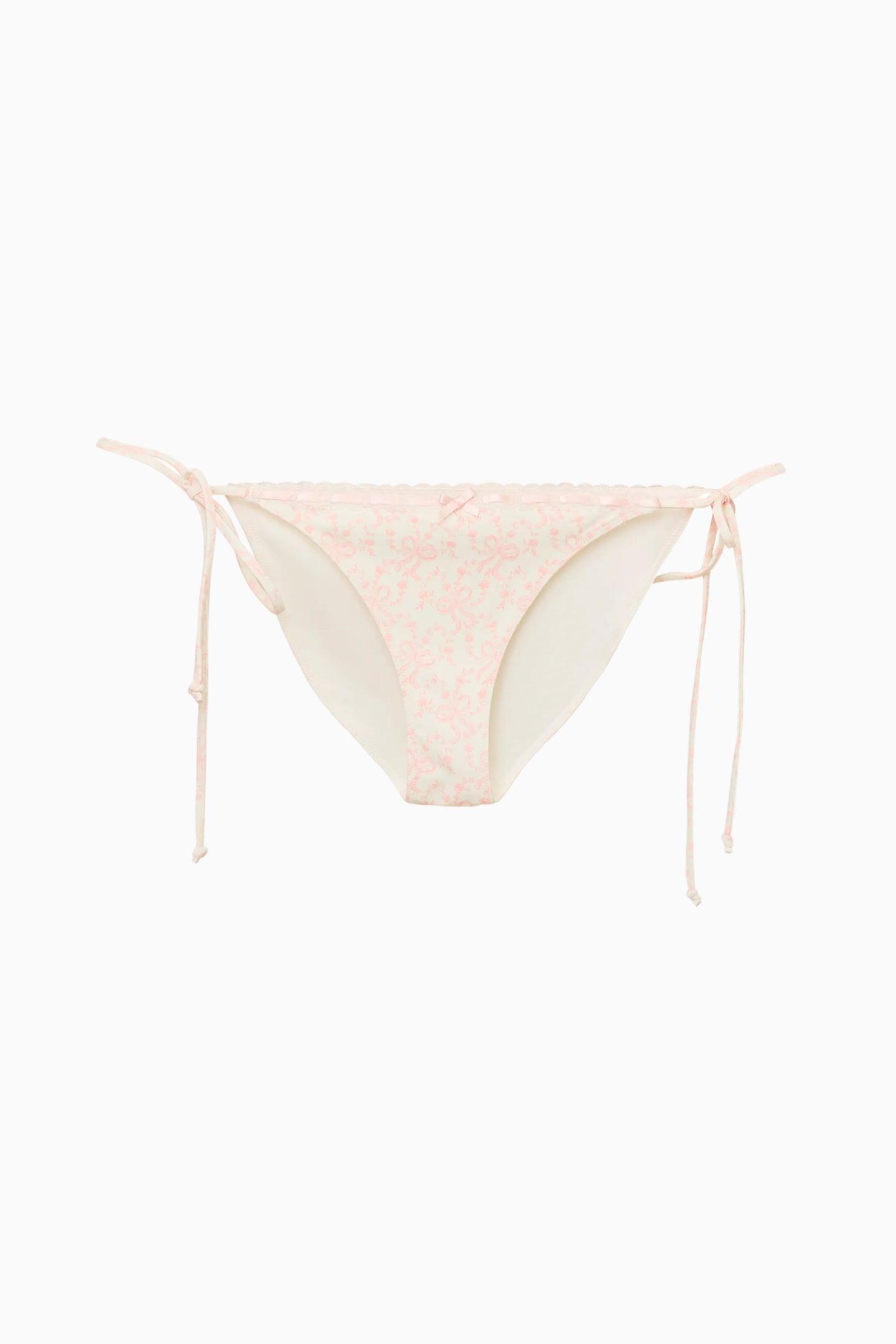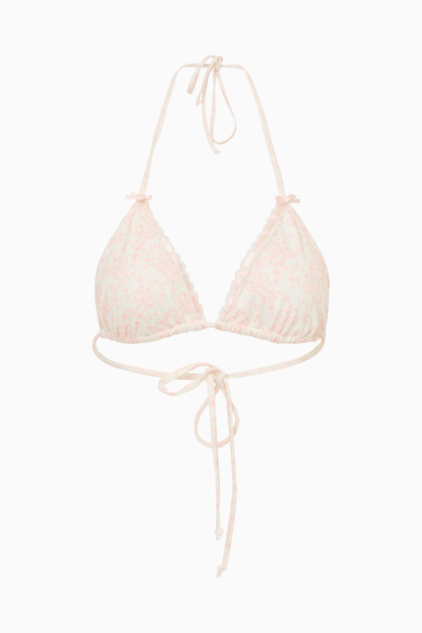 Our best-selling swimsuit returns. A sweet and feminine take on a classic bikini silhouette. The top is trimmed with delicate ribbon detailing along the front edge of the cups, finished with tiny bows at the top for a charming touch. The matching bottom features dainty lace trim with ribbon woven through and a little bow at center front. Details: Classic bikini fit Ribbon-trimmed cup edges with petite bows on the top of the bikini cups Matching bottom with lace trim and ribbon weaving Bow detail at center front of the bottom Stretch swim fabrication for comfort and ease