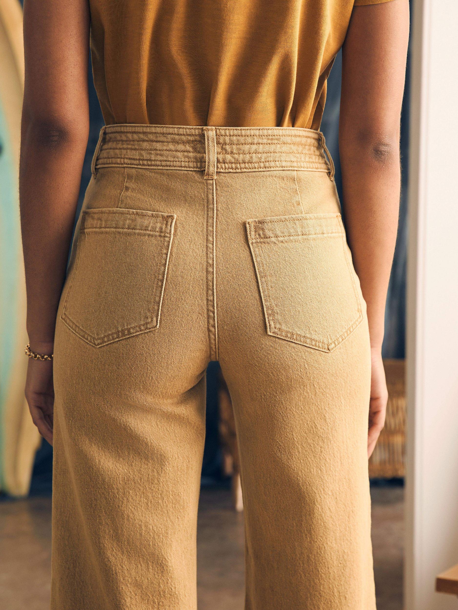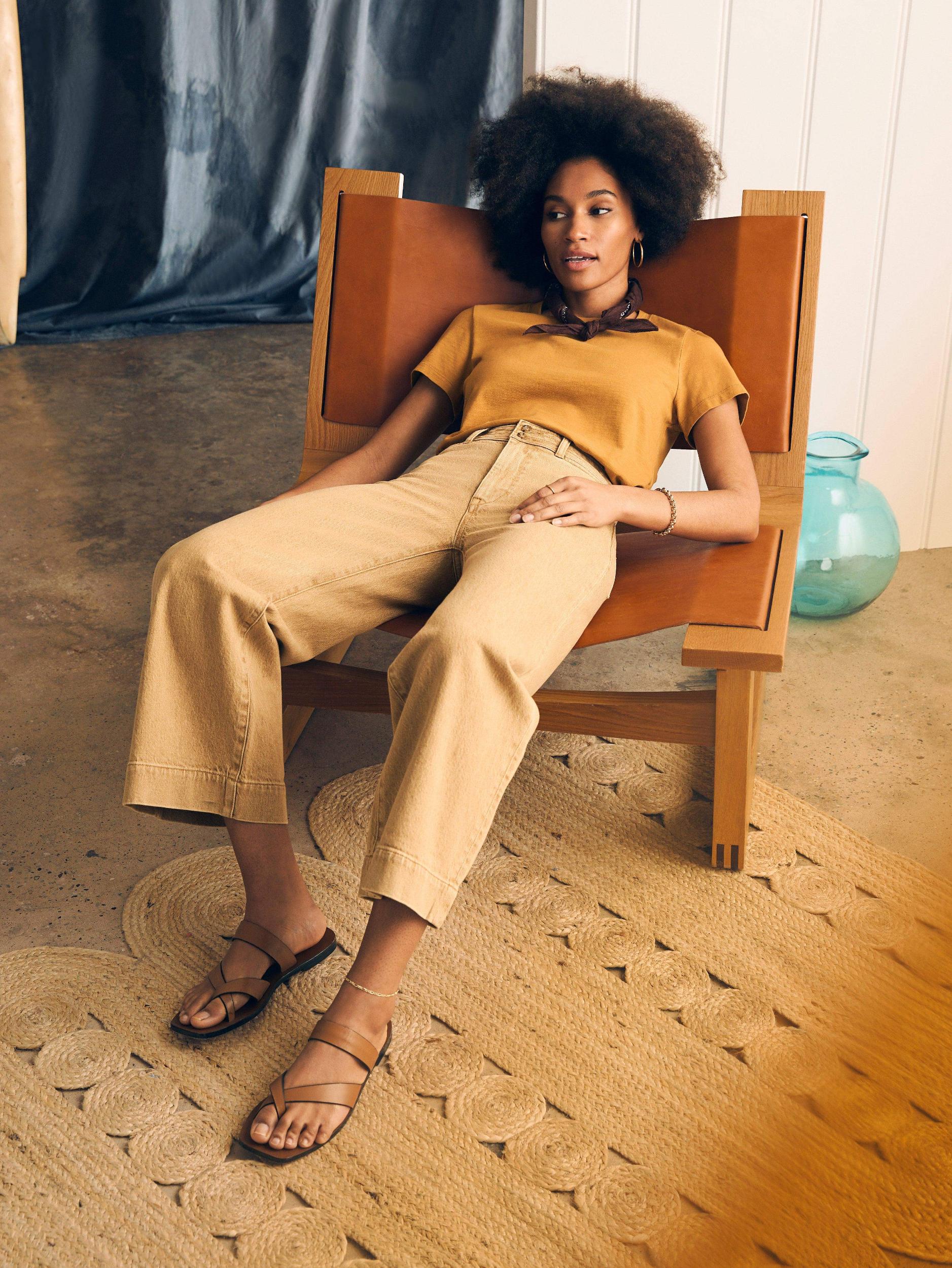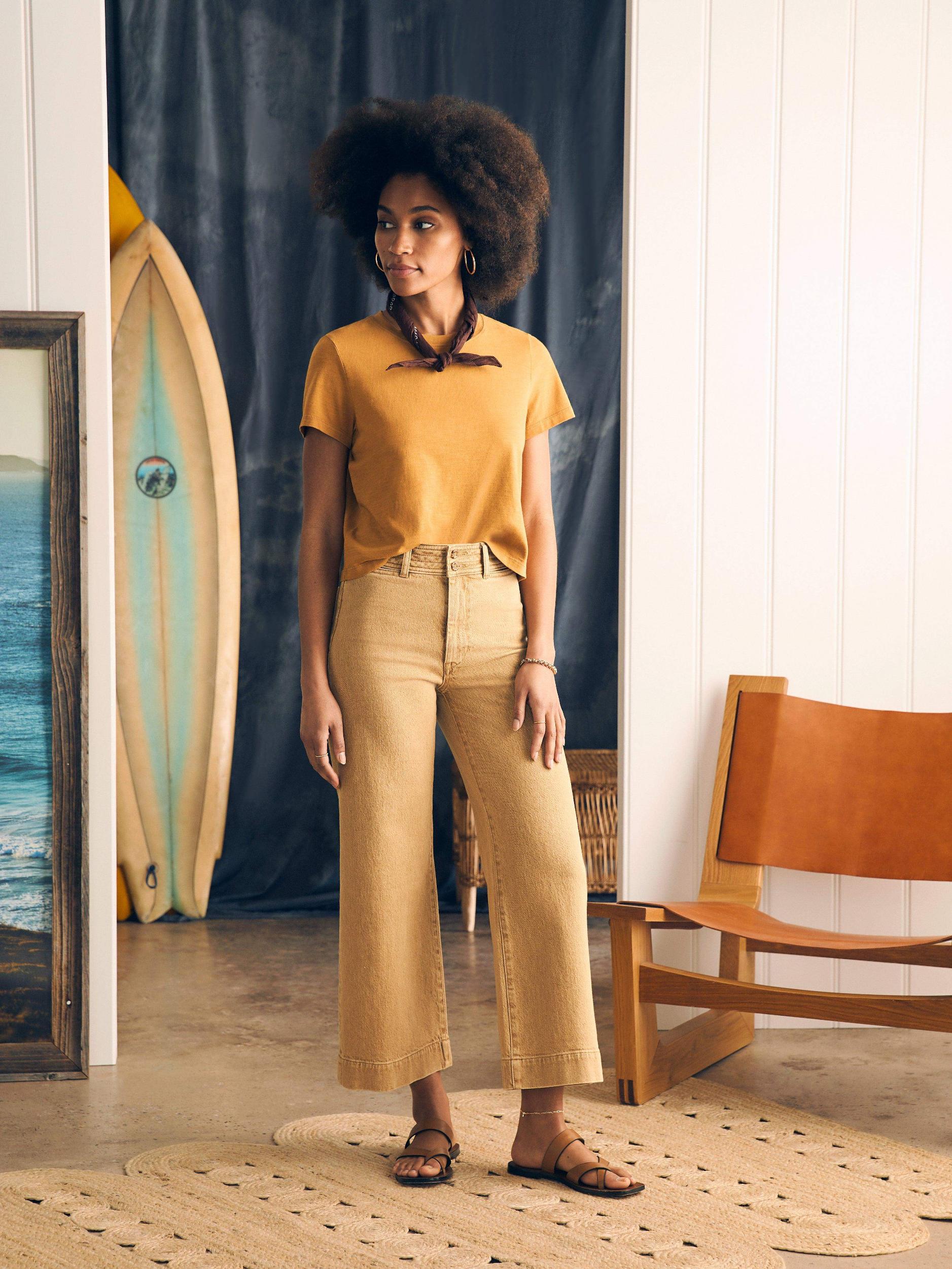 Our new Harbor Crop silhouette features a high rise and wide leg that hits at the ankle for a polished and playful look. The light wash of color – just in time for spring – is created using natural botanical dyes, so that each jean has its own one-of-a-kind character. Fit: High rise wide leg, ankle length. Inseam:27" Detail: Color yarn dyed Denim pant. Tall waistband with decorative stitching with button closure. On-seam pockets. Comfort stretch. Denim fabric is dyed using Natural based dye, derived from the non-edible waste of bitter orange leftover from agricultural and herbal industries. Each garment may have slight color variations and will continue to fade, adding to its character and uniqueness. Material: 88% Cotton, 11% Recycled Cotton, 1% Elastane, Poly Button, Metal zipper Model: Gabrielle is 5’9 wearing size 27" Care: Close all zippers before wash. Turn inside out. Machine Wash cold With like colors. Delicate cycle. Do not bleach. Tumble dry low. Remove promptly. Warm iron when needed. WBS2432-GSW