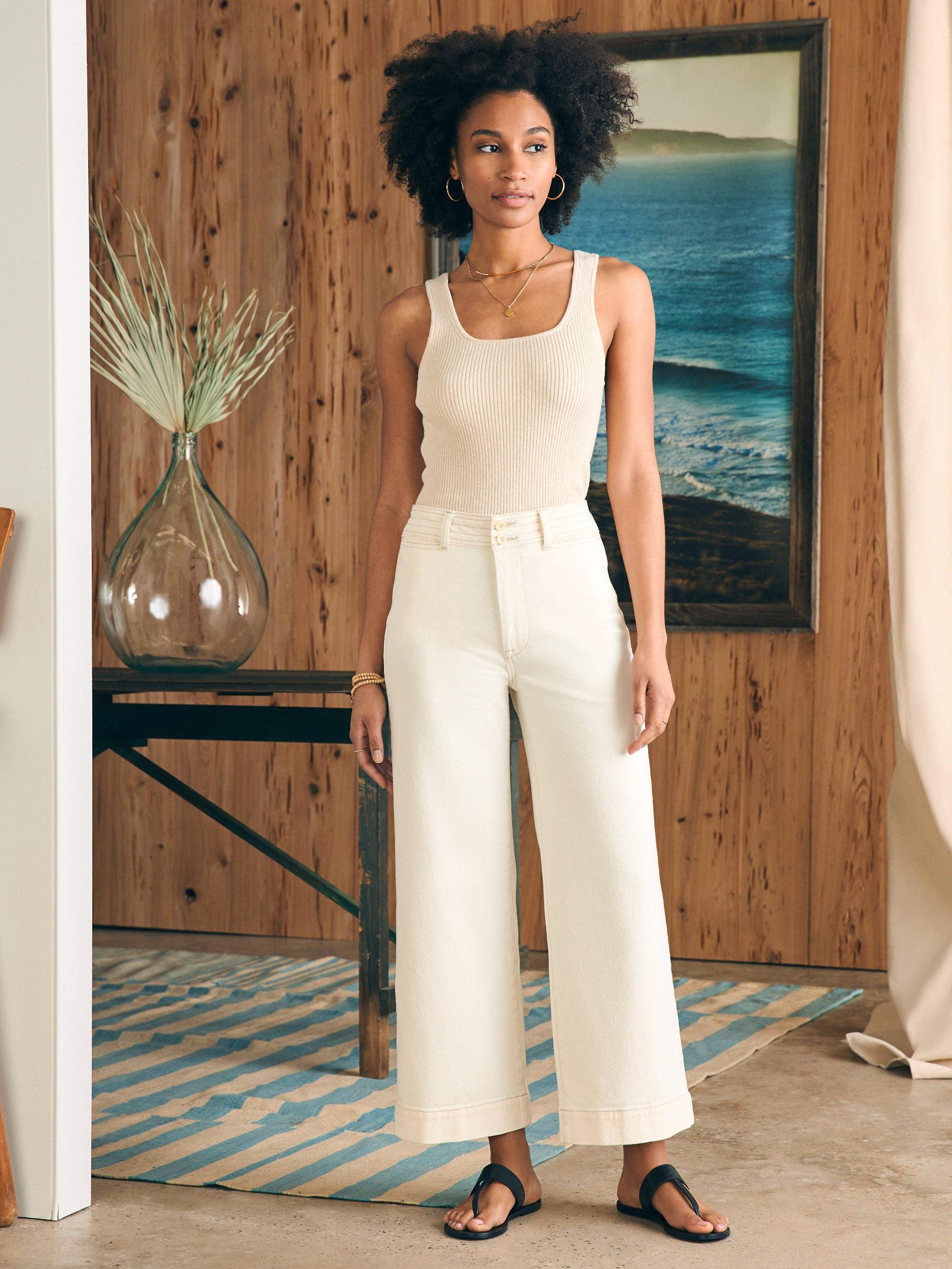We spent years developing the perfect denim fabric—organic cotton woven with a textured slub yarn that washes down and ages beautifully. Combined with the perfect amount of stretch and a just-right fit that's comfortable enough for all-day wear, yet elevated for a night out, they’re the most comfortable and lived-in jeans you’ve ever worn. They also feature an innovative, energy-efficient wash process that utilizes 80% less water than conventional denim wash methods. Our new Harbor Crop silhouette features a high rise and wide leg that hits at the ankle for a polished and playful look in a truly versatile, authentic wash of color. Fit: High-rise wide leg, ankle length. Inseam: 27". Based on customer reviews, we recommend sizing up Detail: Denim pant with Tall waistband with decorative stitching with button closure. On-seam pockets. Comfort stretch. Natural seeded denim with light tan contrast stitching. Material: 99% Organic Cotton, 1% Elastane, poly Button, Metal zipper Model: Gabrielle is 5’9 wearing size 27" Care: Close all zippers before wash. Turn inside out. Machine Wash cold With like colors. Delicate cycle. Do not bleach. Tumble dry low. Remove promptly. Warm iron when needed. WBS2437-WUW