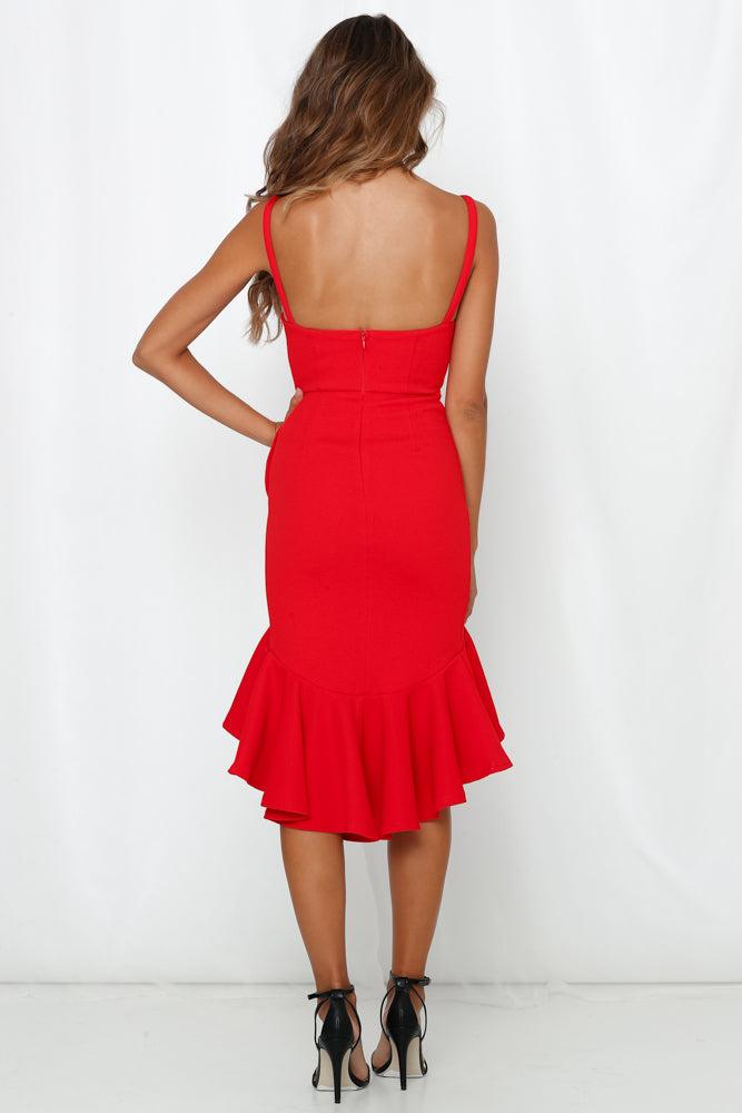Red midi dress. Partially lined. Cold hand wash only. Model is a standard XS and is wearing XS. True to size. Stretchy fabric. Invisible back zip. Print placement may vary. Polyester. Go mega glam girl in our Hard To Be Cool Midi Dress. This super cute style features a asymmetrical ruffle hemline, straight neckline, thin tubular should straps and a zipper through the back.