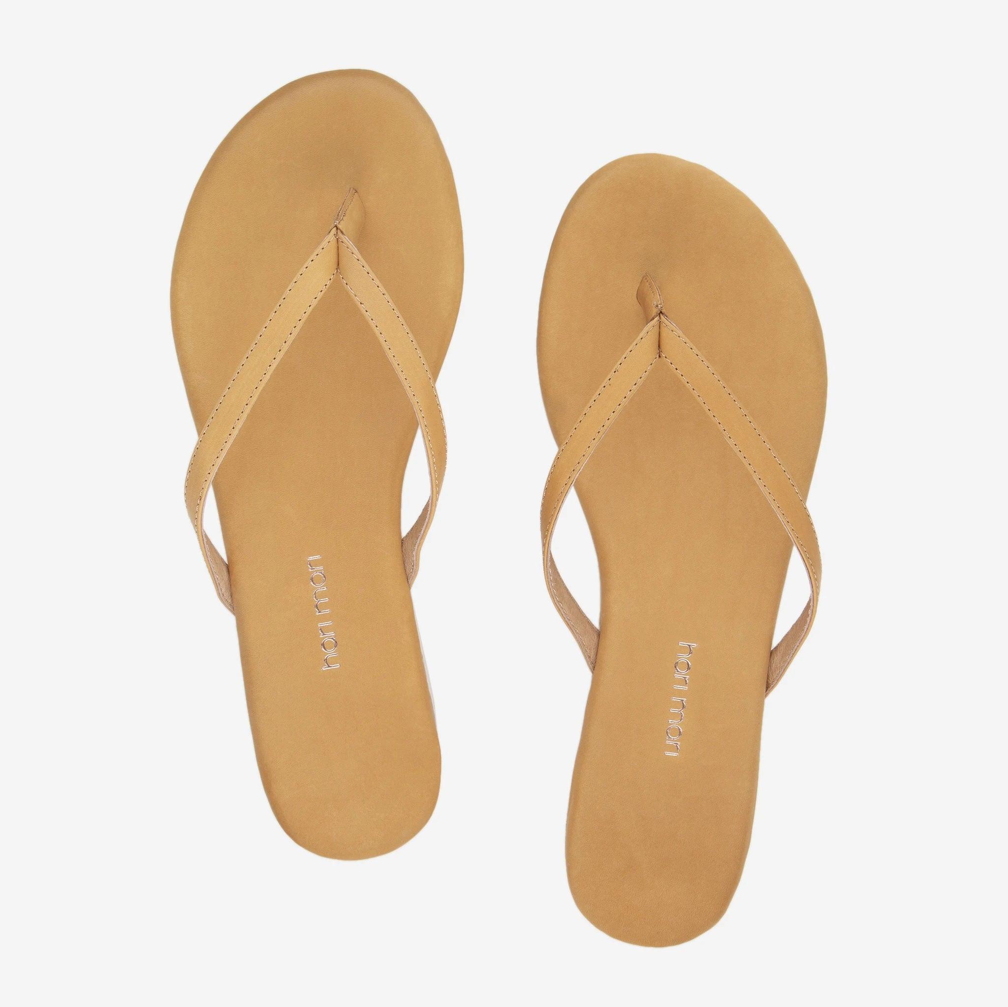 An elevated flip flop made and wrapped with soft, premium natural colored Aniline leather. Simple and chic for all your casual moments when flip flops just won't do. Leather-wrapped toe post filled with memory foam to eliminate break-ins Memory foam-filled foot beds mold to your foot’s unique shape Firm arch support for all-day wear Non-marking, molded ‘Rise Up’ Hari Mari rubber outsoles to reduce slipping Imported