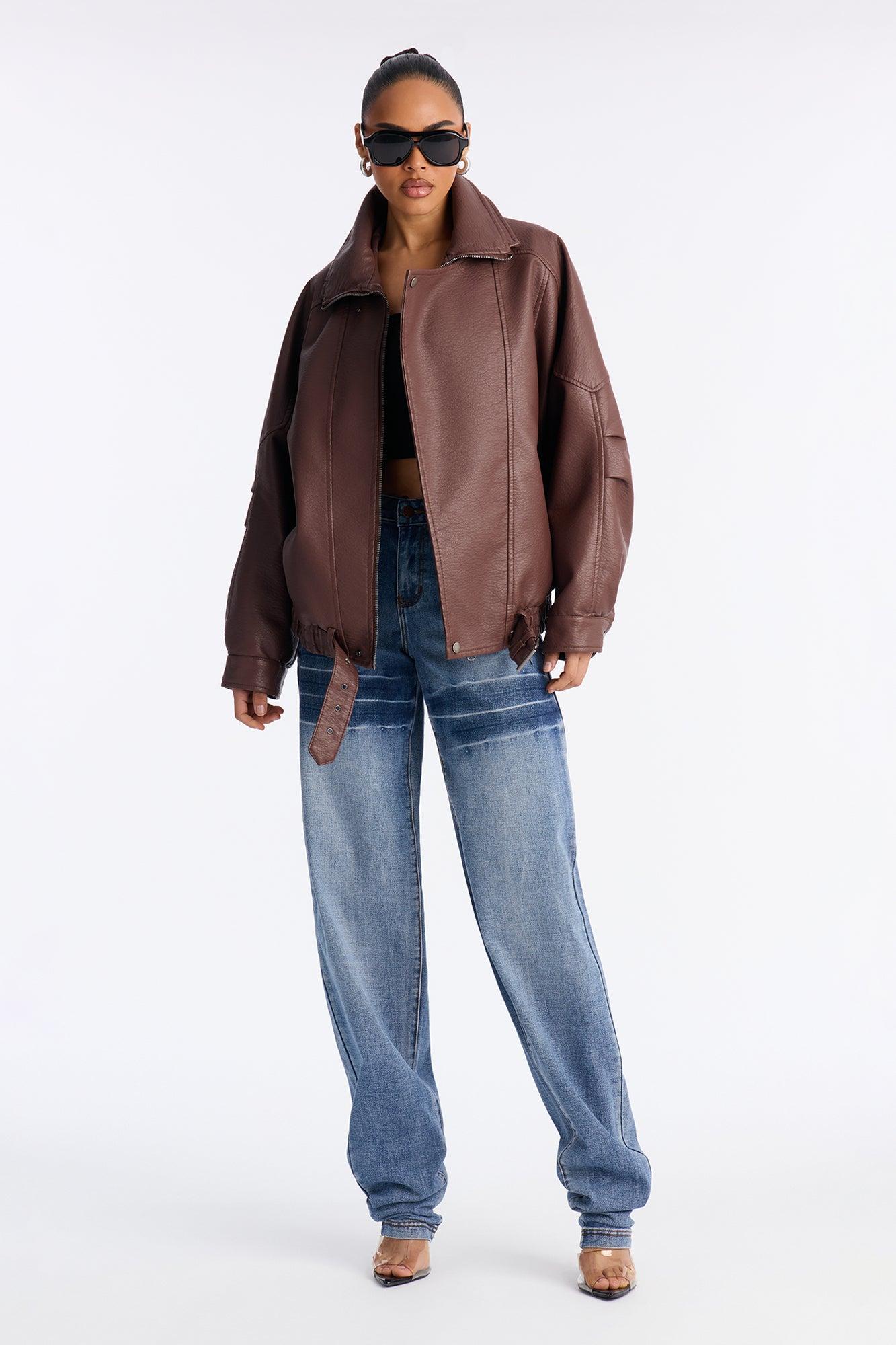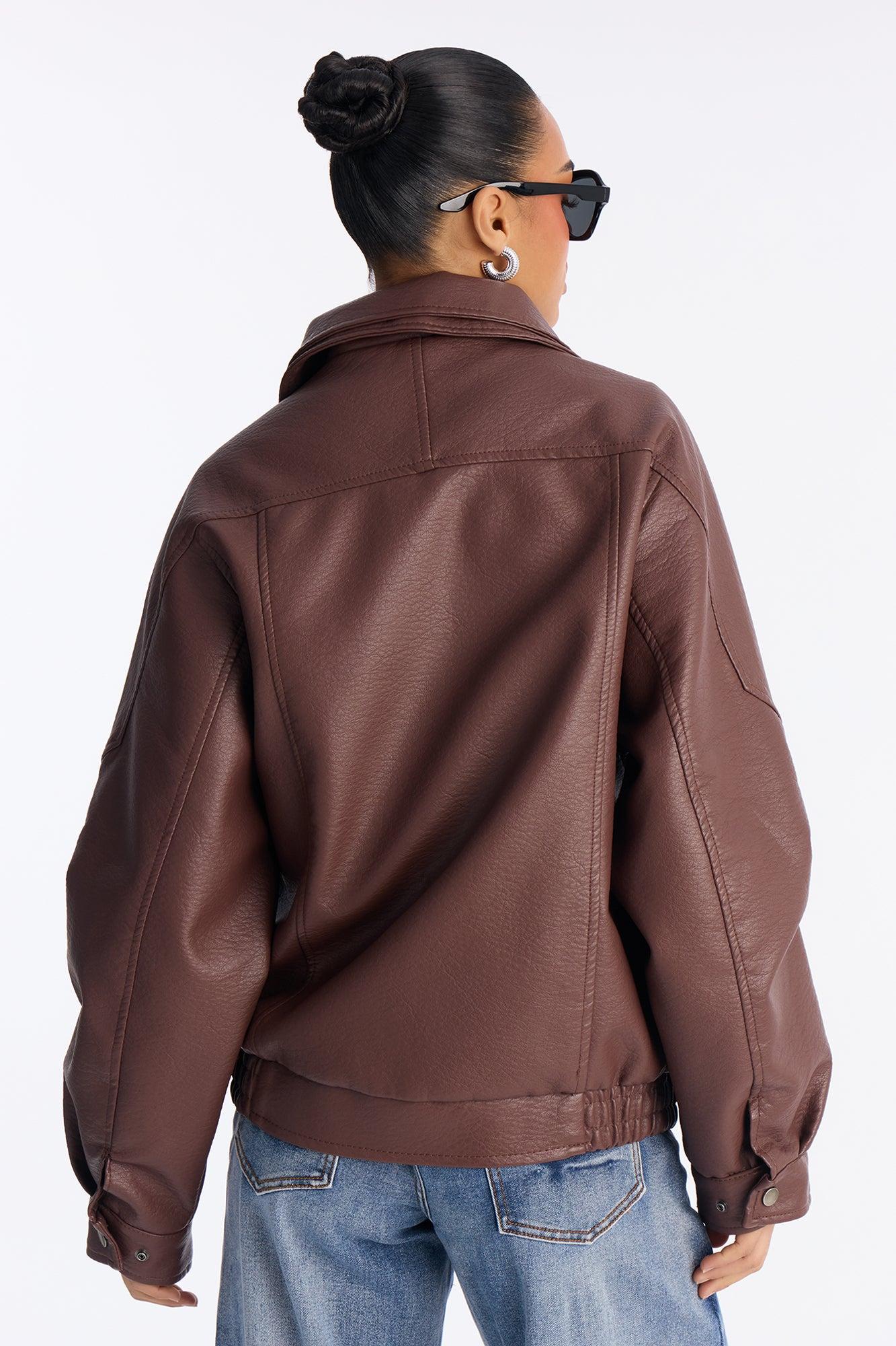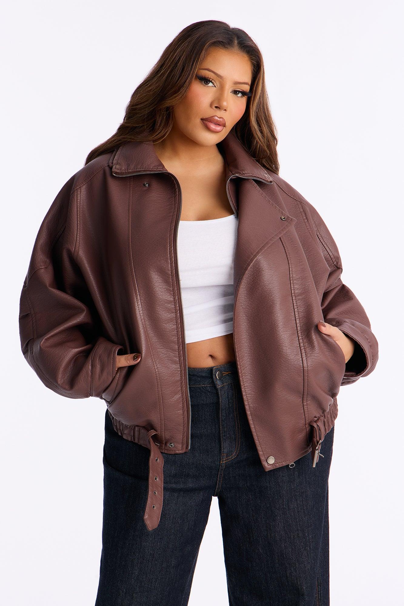 Available In Brown And Stone. Moto Jacket Collar Ruched Long Sleeves Faux Leather Belted Detail Zipper & Button Closure Elastic Hem Pockets Lined Shell : 65% Polyurethane 35% Cotton Lining : 100% Polyester Imported California Proposition 65WARNING: Cancer and Reproductive Harm - www.P65Warnings.ca.gov.