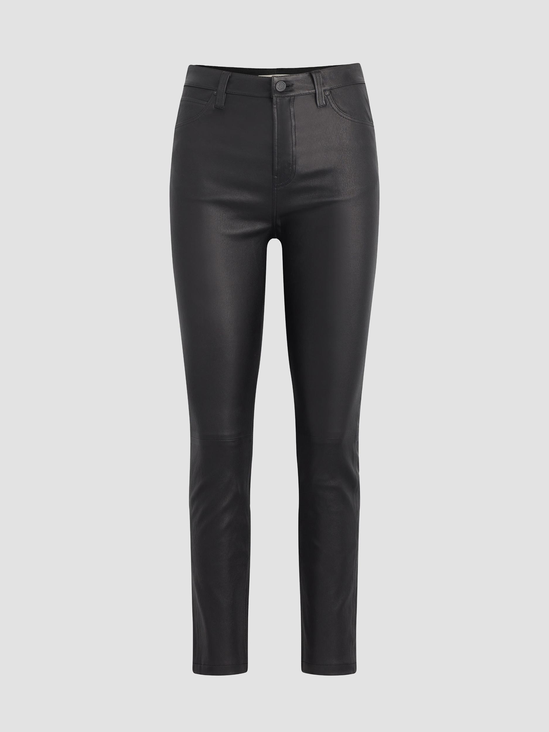 Description Our Harlow Ultra High-Rise Cigarette Leather Ankle Pant in Black is cut with a slim, cropped silhouette from 100% leather. Product Details Front Rise: 12", Leg Opening: 13", Inseam: 27.5"Model Height 5’9"Model wearing size 25Measurements based on size 27 Fit & Care Content: 100% Lamb Leather Leather PantCare of Leather Specialist Only