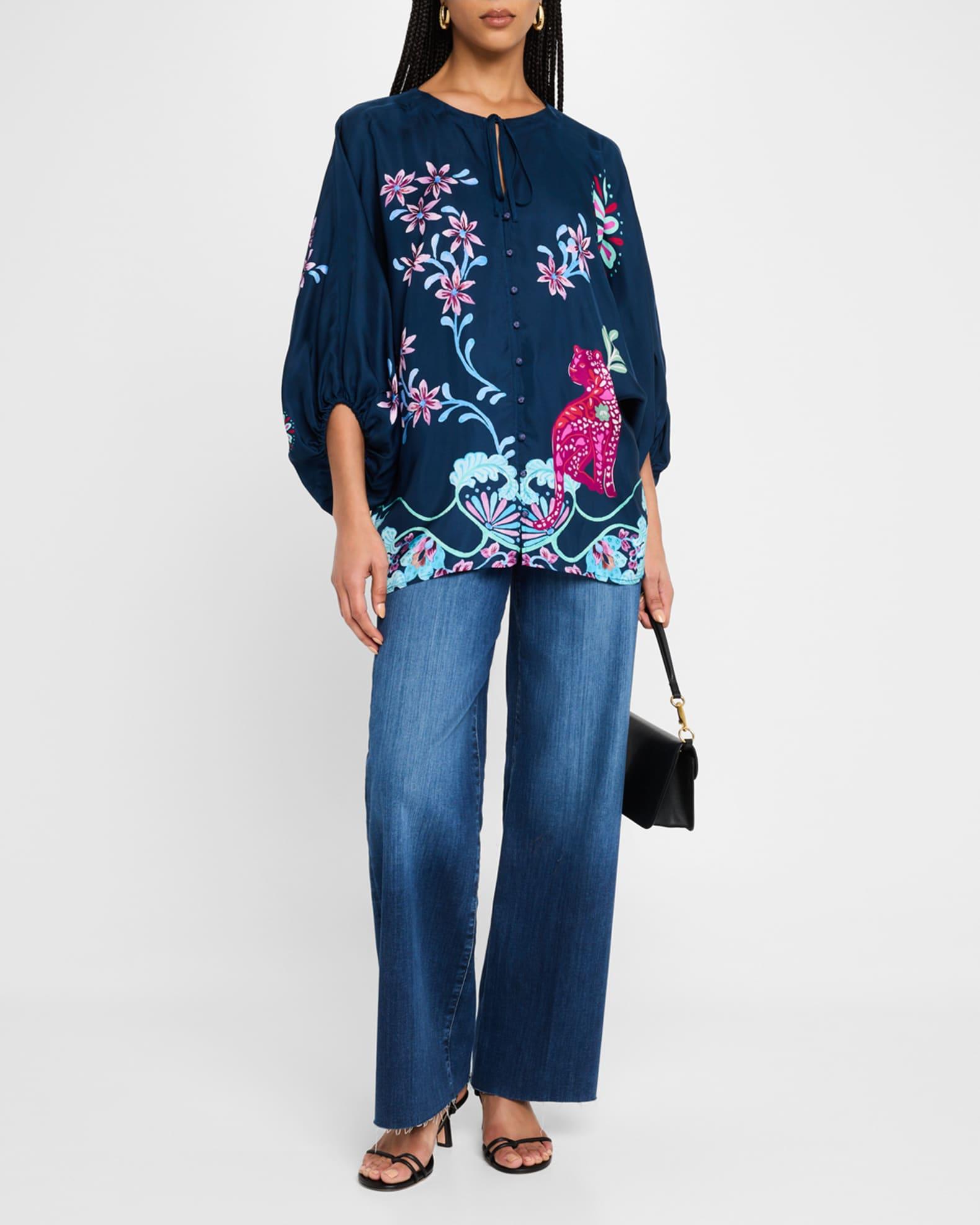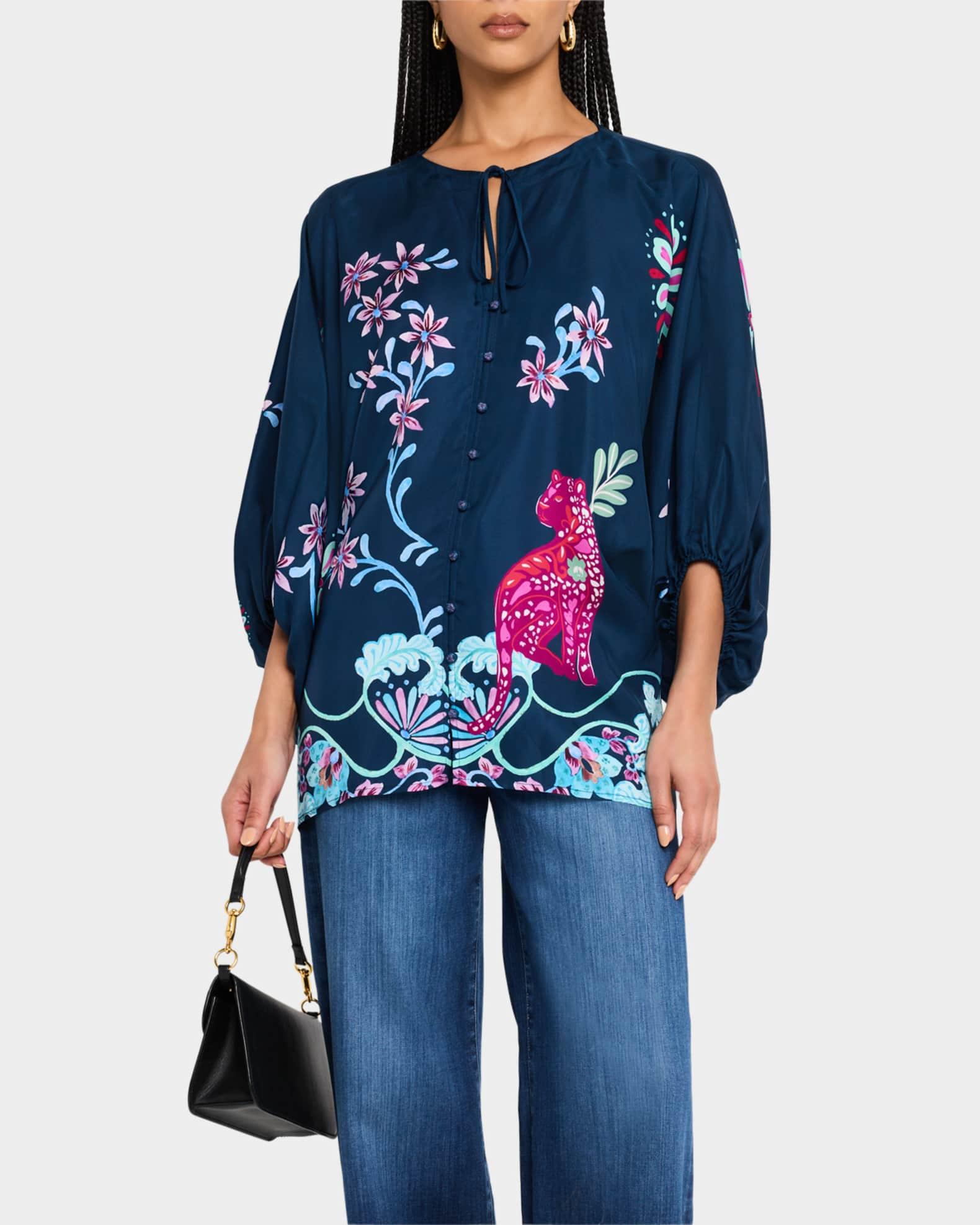 Johnny Was "Harlyn" blouse in Leilana floral and animal print Crew neckline; keyhole front self-tie Button front closure 3/4 blouson sleeves Elasticized cuffs Relaxed fit Rayon/cellulose acetate/silk Imported Please note: This merchandise may have a distressed effect. It is a unique feature that enhances the product and is not considered a defect.