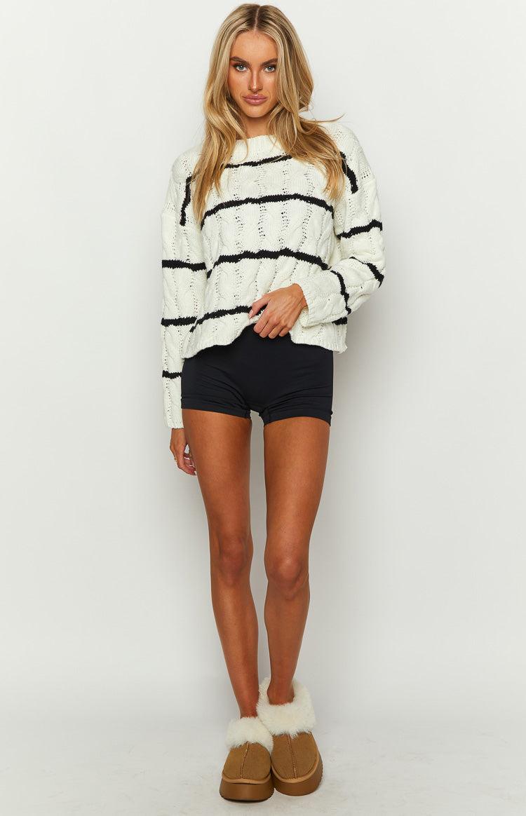 White and Black Stripe Sweater HOW TO STYLE: A basic sweater is perfect for the cooler weather and easy to throw on! This cable knit jumper is perfect and goes with any denim or plain bottoms. We love the delicate stripe print mixed with the cable design. Style by tucking it in for a cropped look with jeans and sneakers or leave untucked with basic black bike shorts. Wear this for running errands or a lunch with friends! FEATURES: Pull on style Heavy weight knit material Unlined Long sleeves Cable knit design with black stripes Slightly cropped High scoop neckline Stretch material