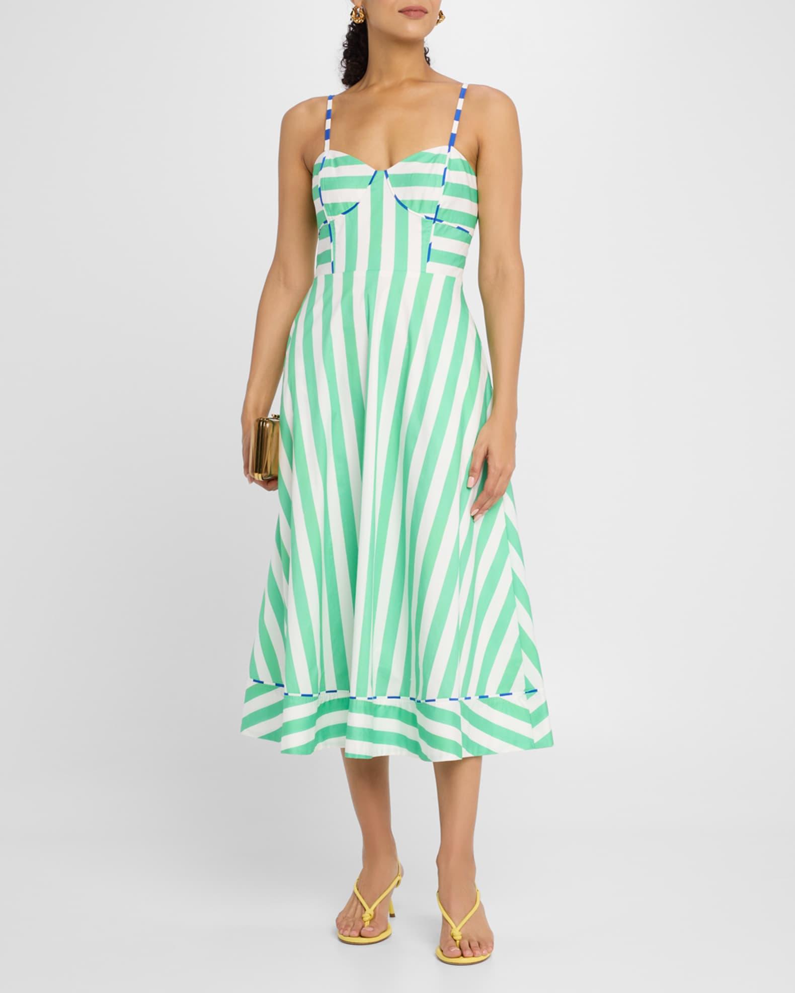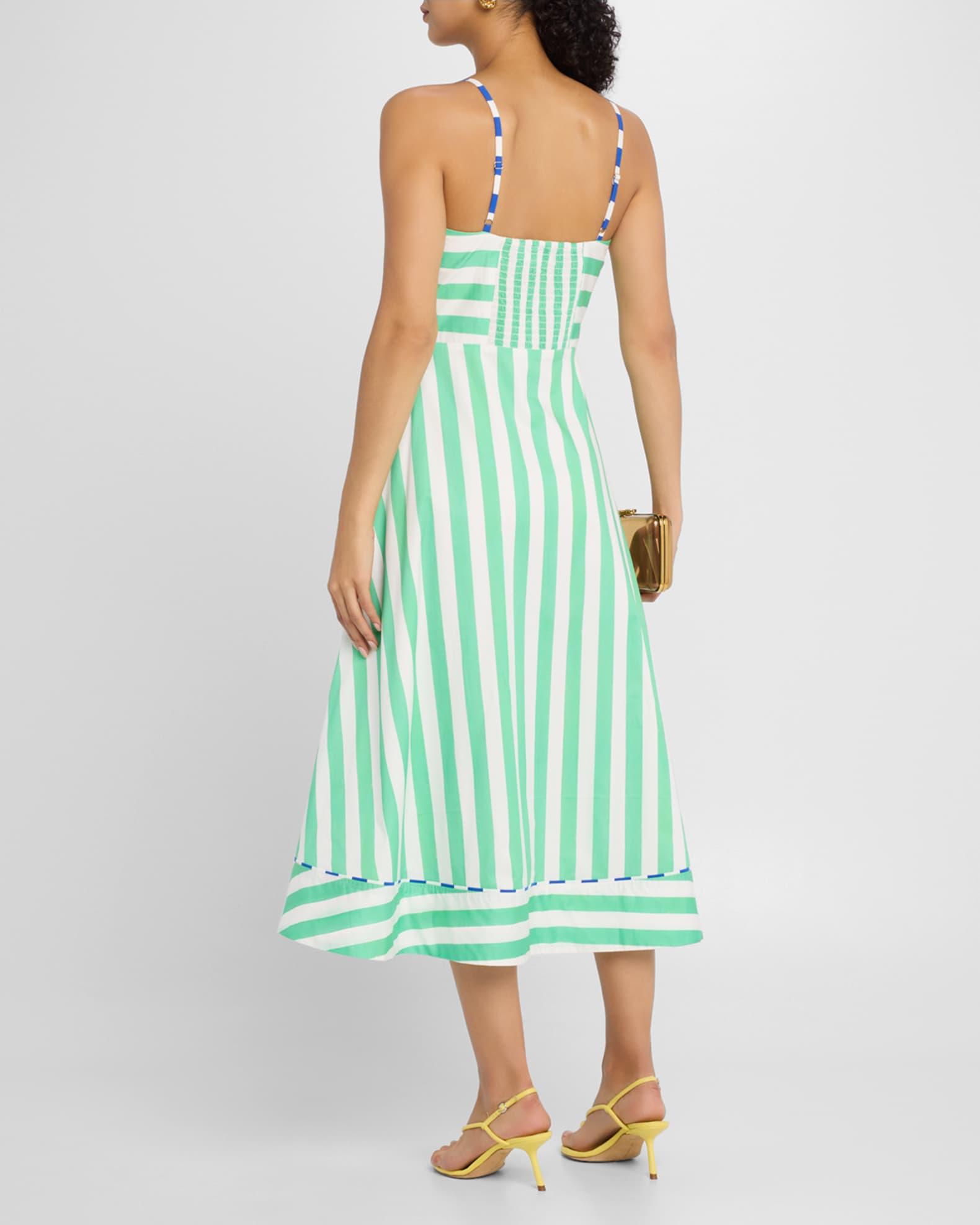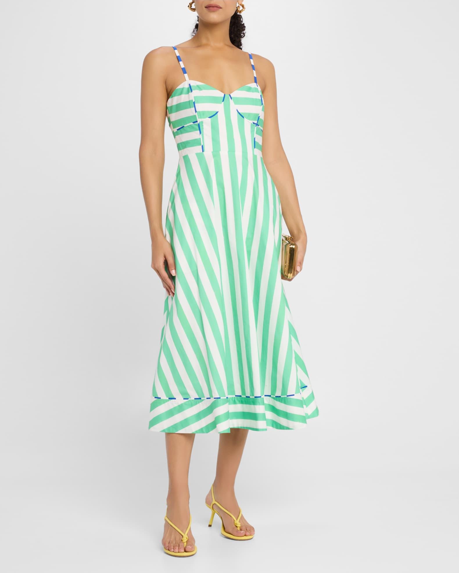 Beach umbrellas, Zebra gum, Hamburglars: all the chicest entities know stripes are in! The Harper dress humbly offers stripes three ways: swathes of kelly green cotton sateen are strategically placed both vertically and horizontally, and sea-blue contrast piping compliments the structured bodice and full skirt’s hemline. Rachel Antonoff "Harper" cotton sateen midi dress Features original 'Painted Over' print by artist Hazel Lee Santino Sweetheart neckline Adjustable spaghetti straps Smocked back panel Side seam pockets A-line silhouette Hem falls below the knee Side zip Cotton Lining: Cotton Dry clean Imported