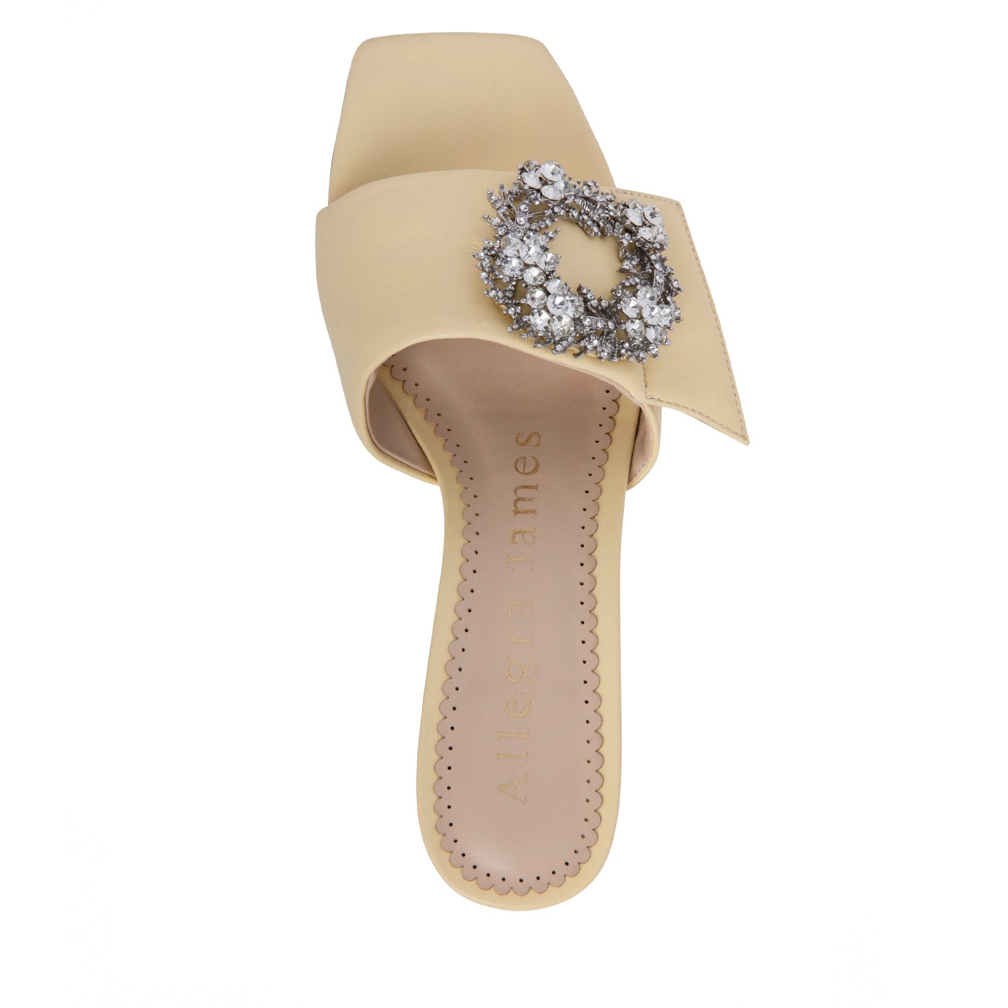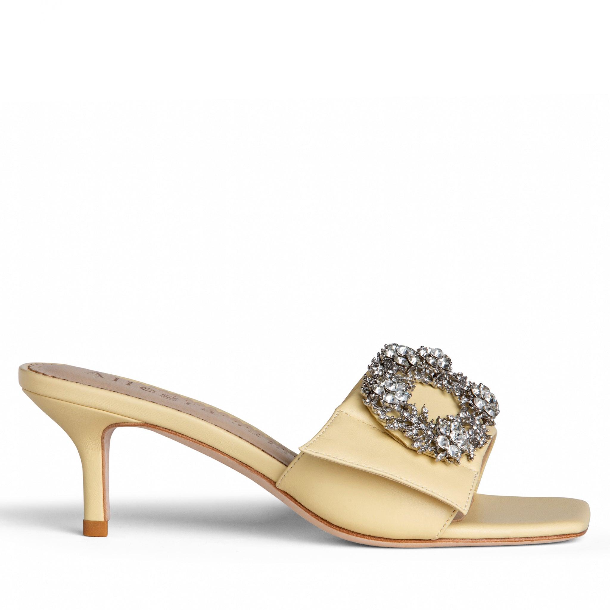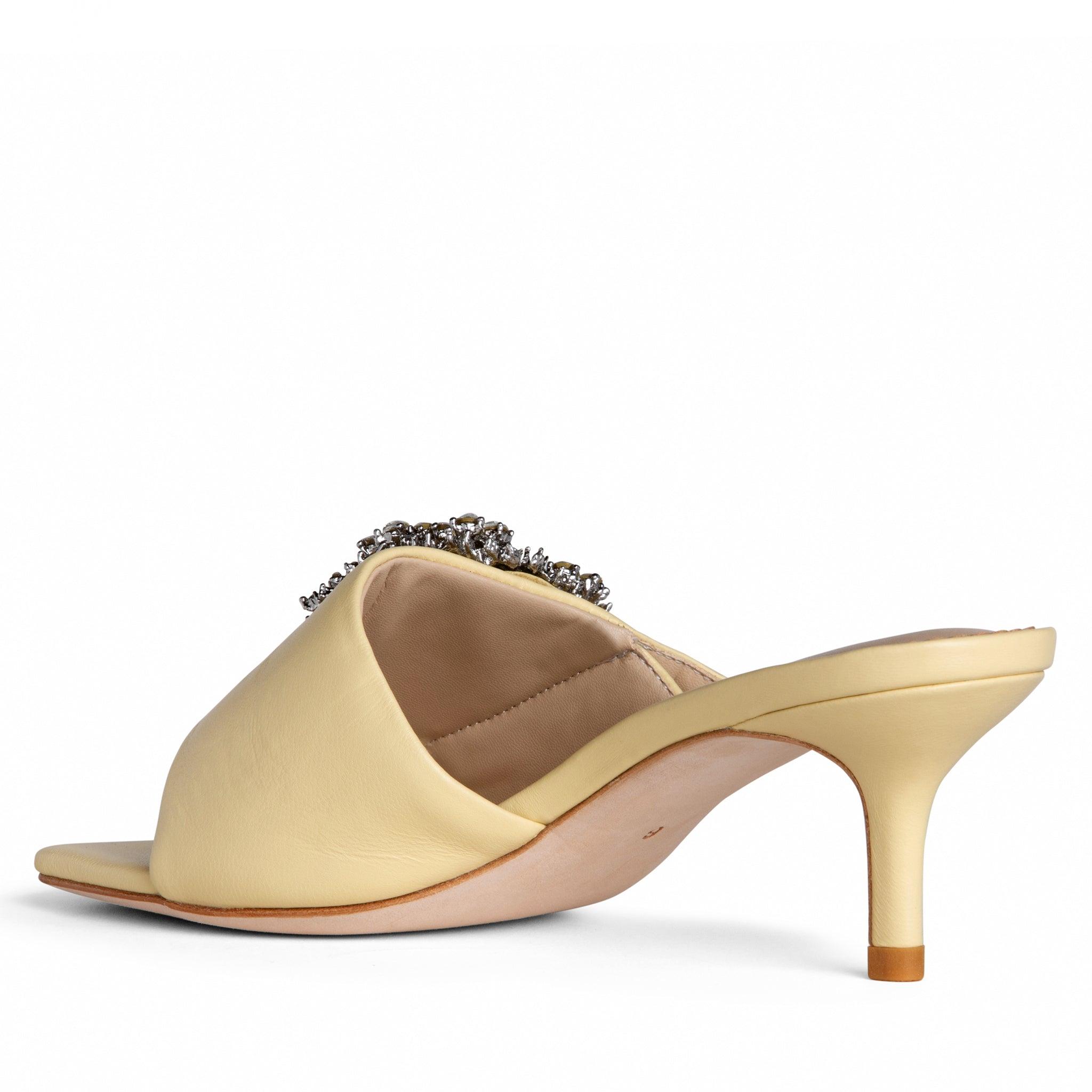 Comfortable pale yellow mules crafted is soft matte leather. The sandals feature a medium kitten heel and a squared toe. A large, decorative buckle, studded with numerous rhinestones embellishments, placed on the upper strap. Leather upper.2" heel height.Cushioned insole.
