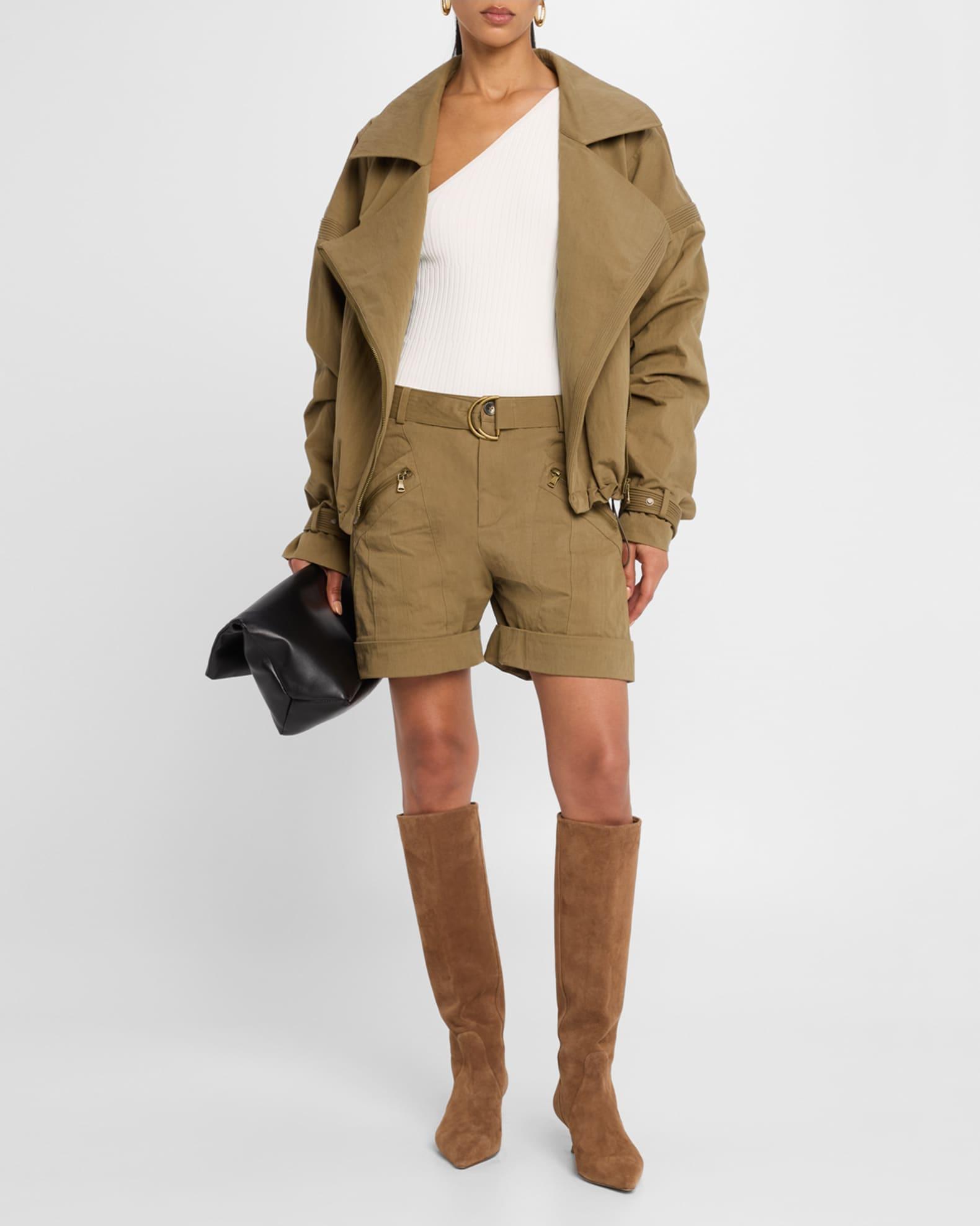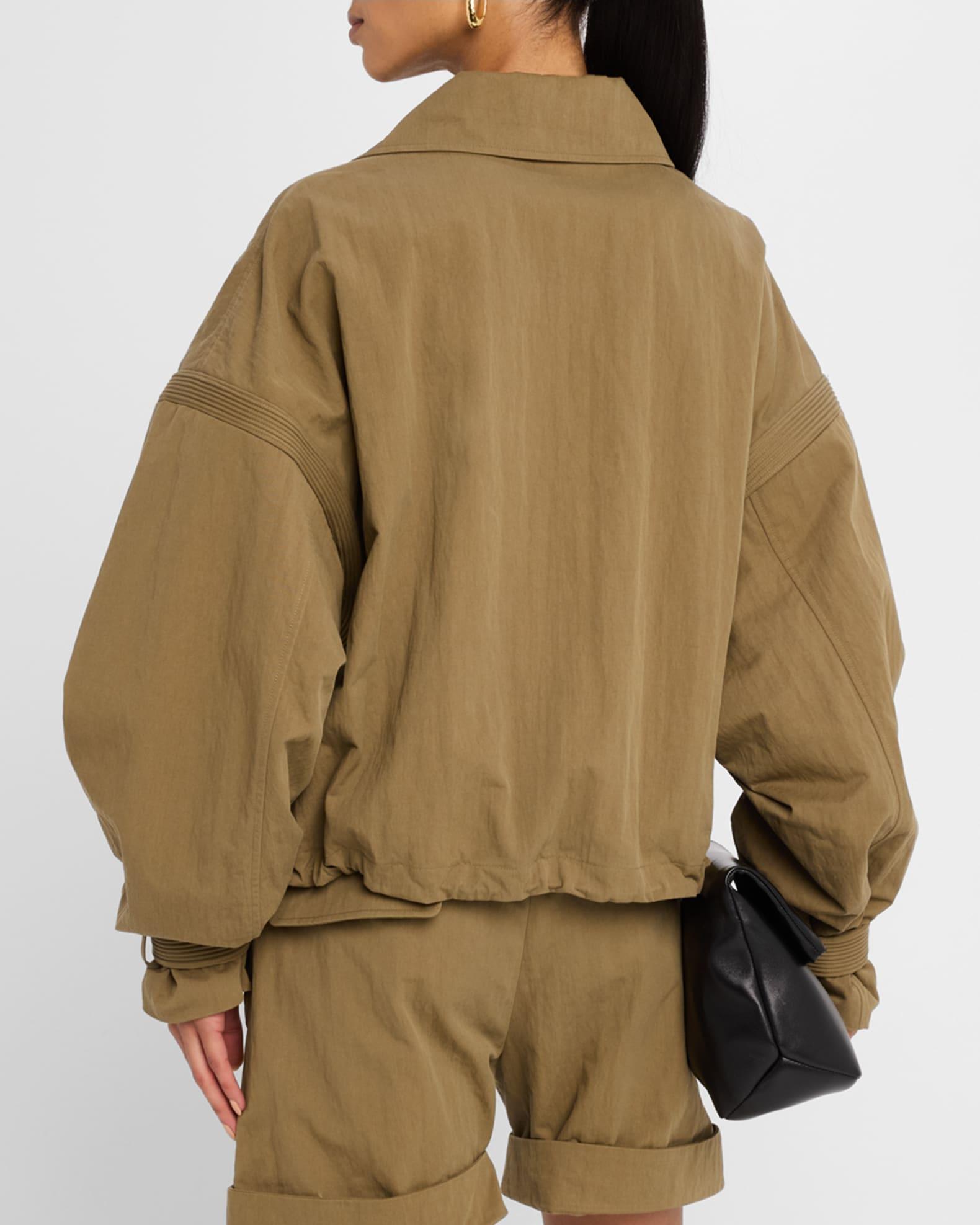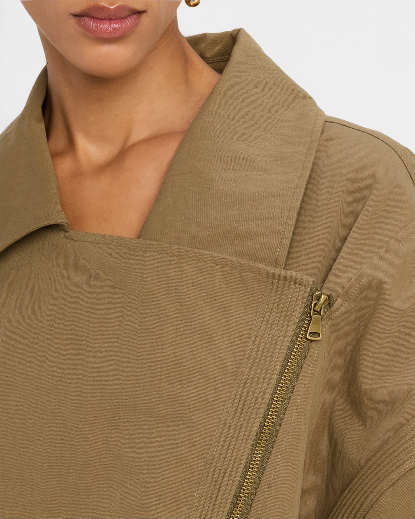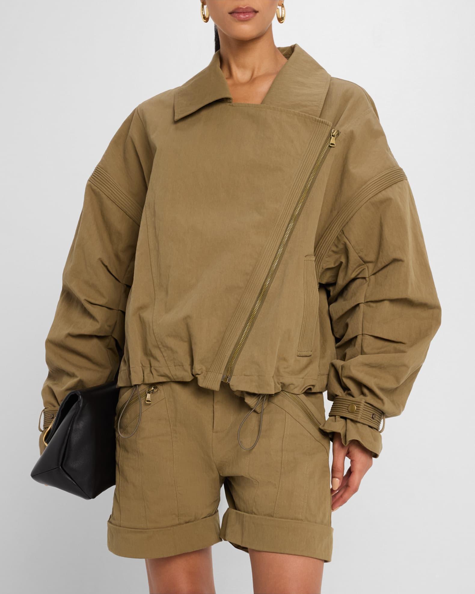 Iro "Harper" moto jacket enhanced with ruched sleeves Point collar; asymmetric zip-front Dropped shoulders Long sleeves with belted cuffs Oversized fit Adjustable drawstring hem Nylon/polyamide/cotton Dry clean or hand wash Imported