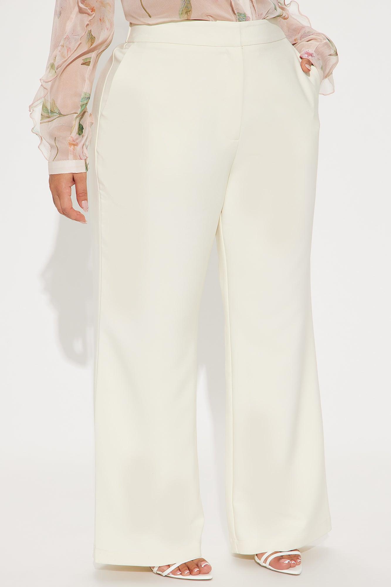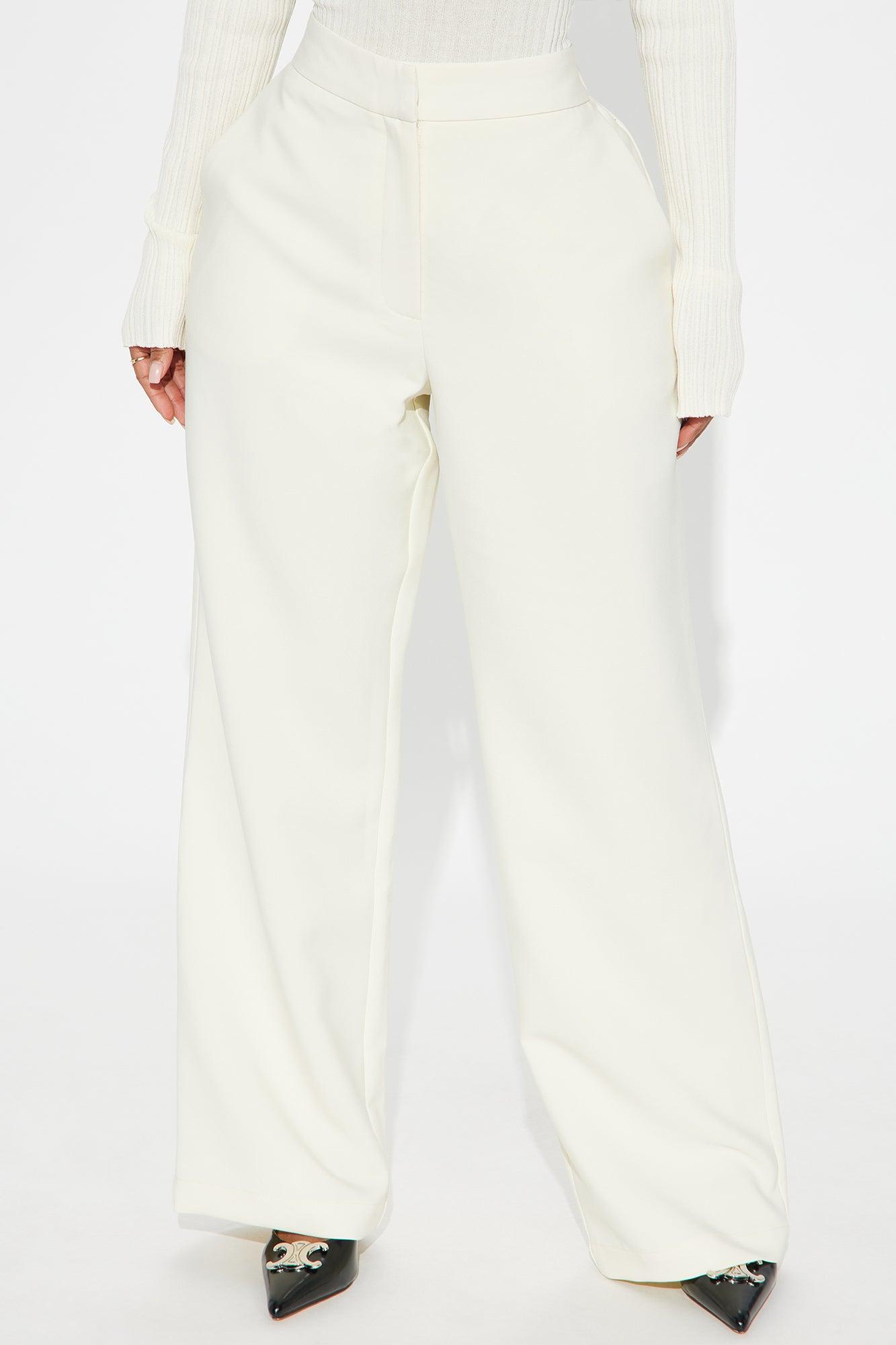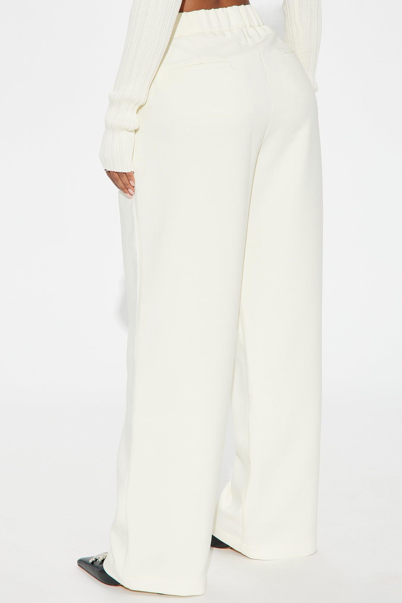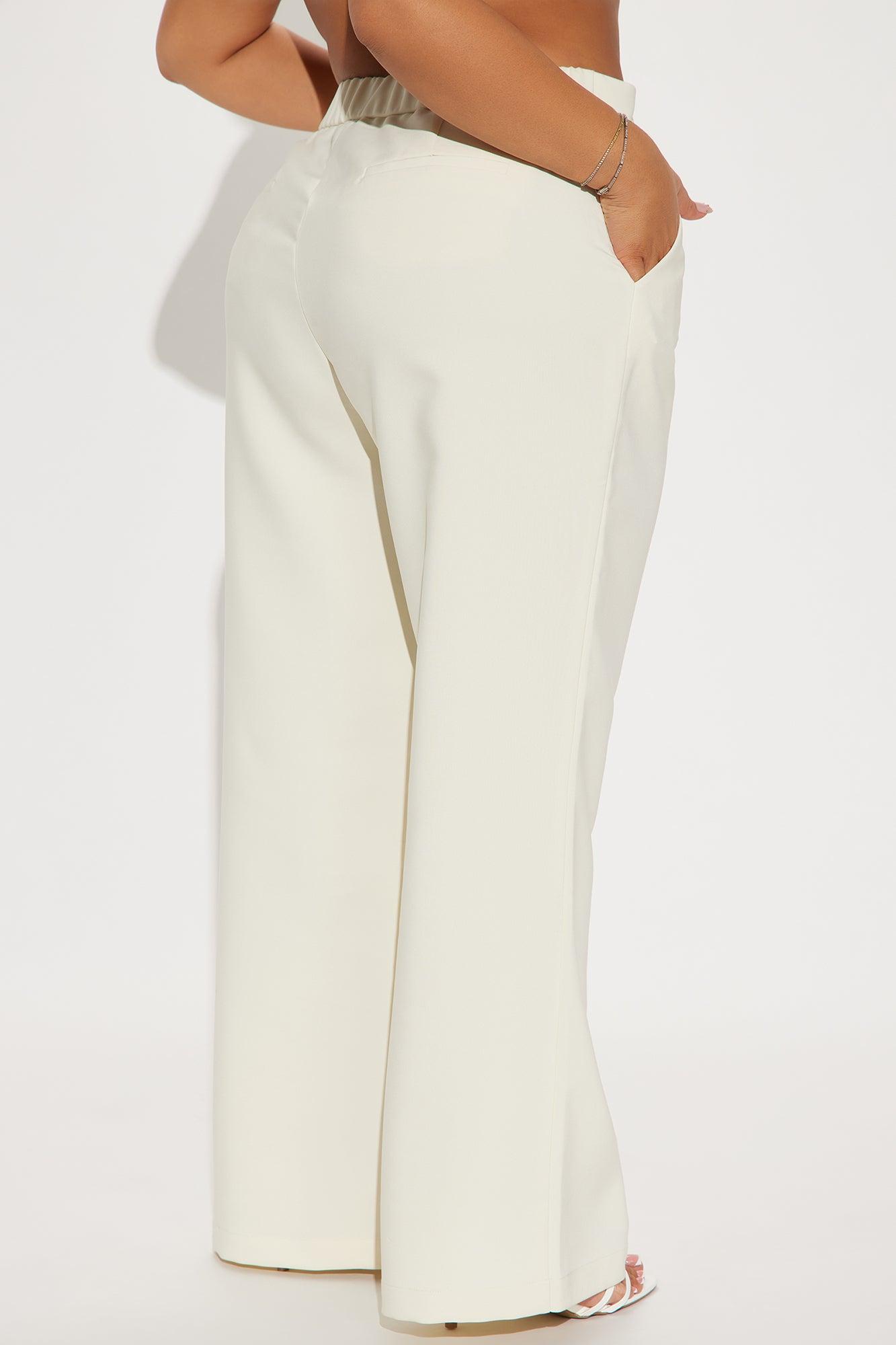 Available In Black, Cream And SkyBlue. Trouser Pant Mid Rise Hook & Eye Closure Zip Fly Elastic Back Waistband Hand Pockets Faux Back Welt Pockets Wide Leg Non Stretch 31" Inseam Shell: 92% Polyester 8% Spandex Lining: 100% Polyester Imported