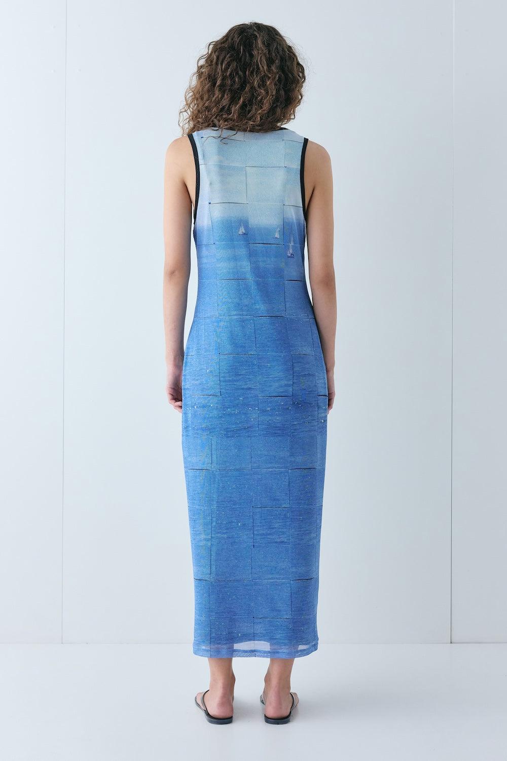 Cut from stretch mesh and fully lined, this sleeveless midi dress features our new sailboat print - hand-woven, scanned, and placed with intention. Contrast binding at the neckline and armholes gives it a clean, graphic edge. Designed to skim without clinging, it’s a piece that speaks through detail, not volume.