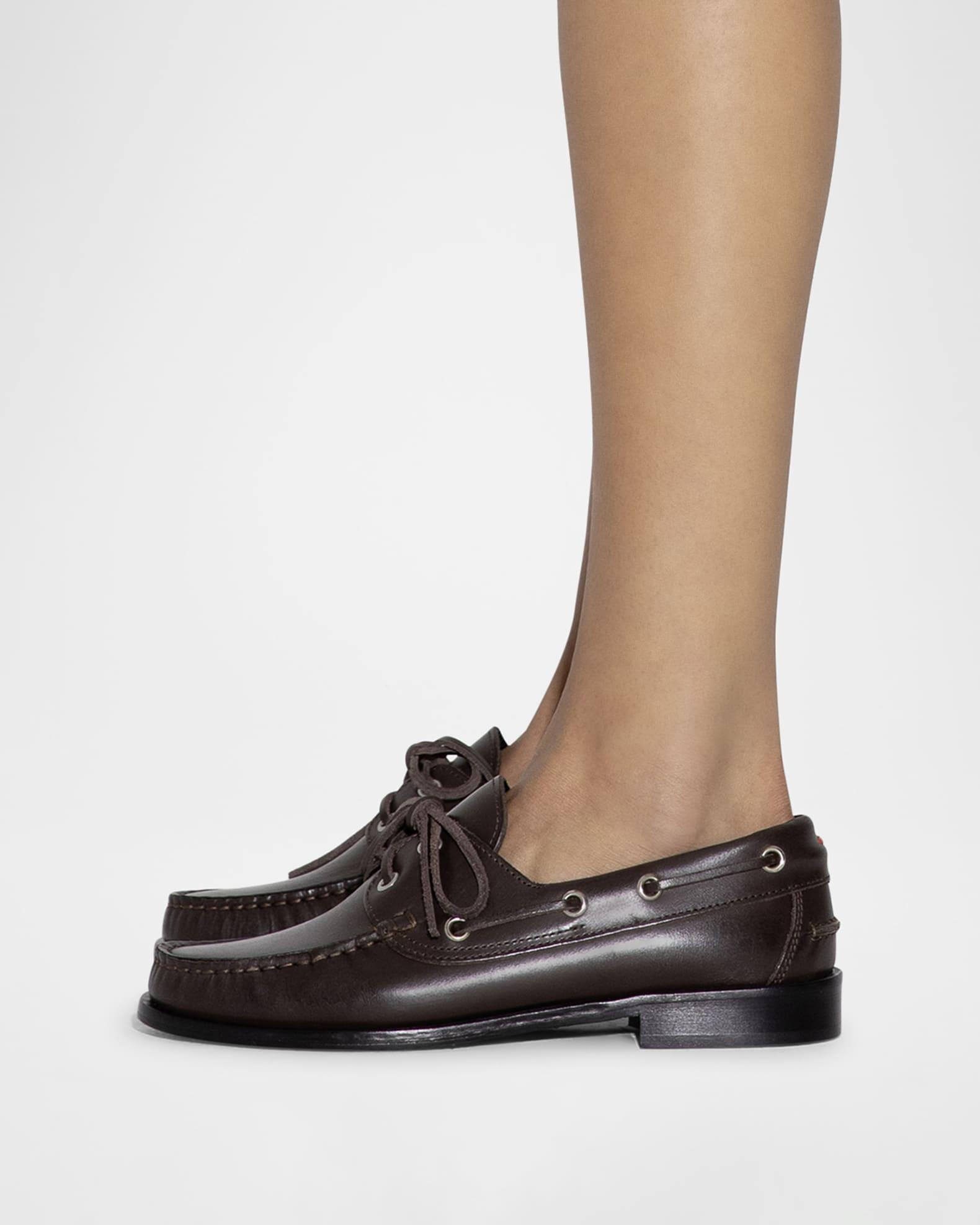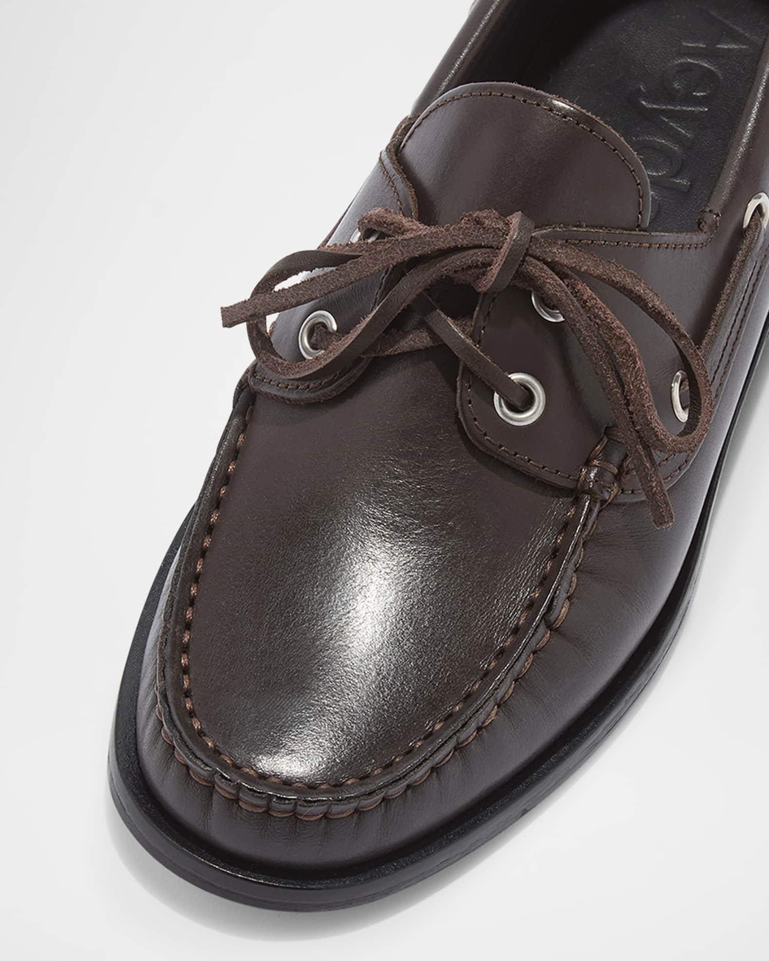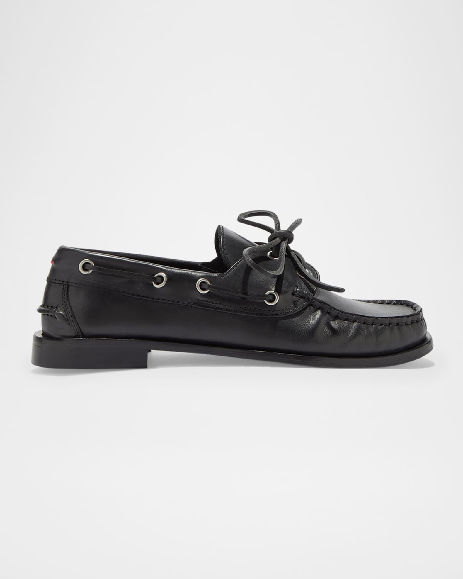 Aeyde "Harris" soft calf leather loafers 0.50 in / 15 mm flat heel Round moc toe 360 lace detaining Lace-up vamp Slip-on style Leather/Rubber outsole Lining: Leather Made in Italy