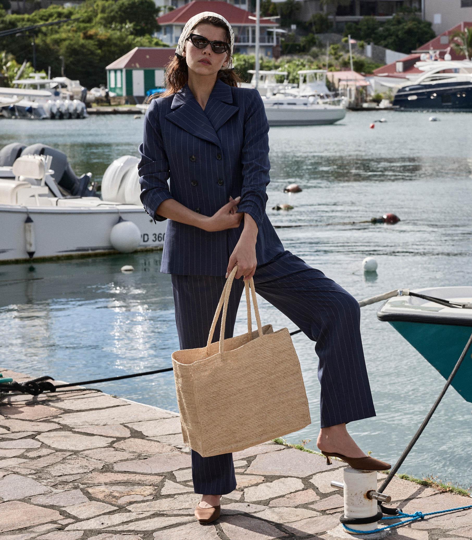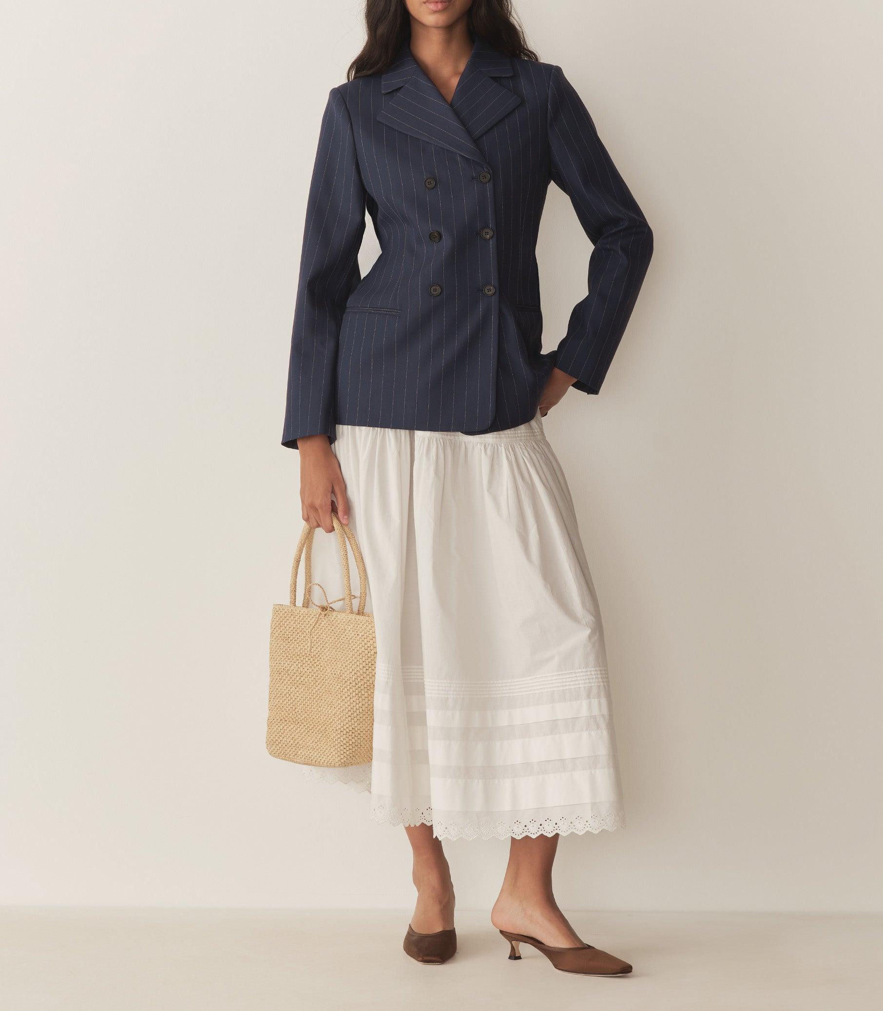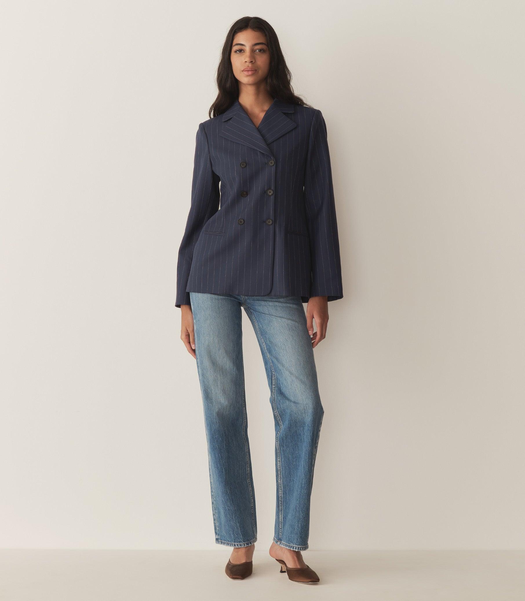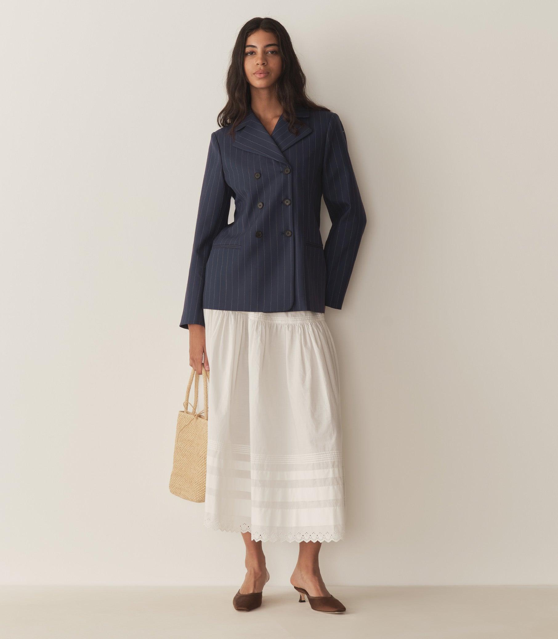 Inspired by ‘20s traditional tailoring, the double-breasted DÔEN Heirloom Harrison Jacket—in a rich cream pinstripe—features shoulder padding, under collar felt, and four buttons at each sleeve cuff. Double welt pockets adorn the front, while an interior pocket lends practicality.