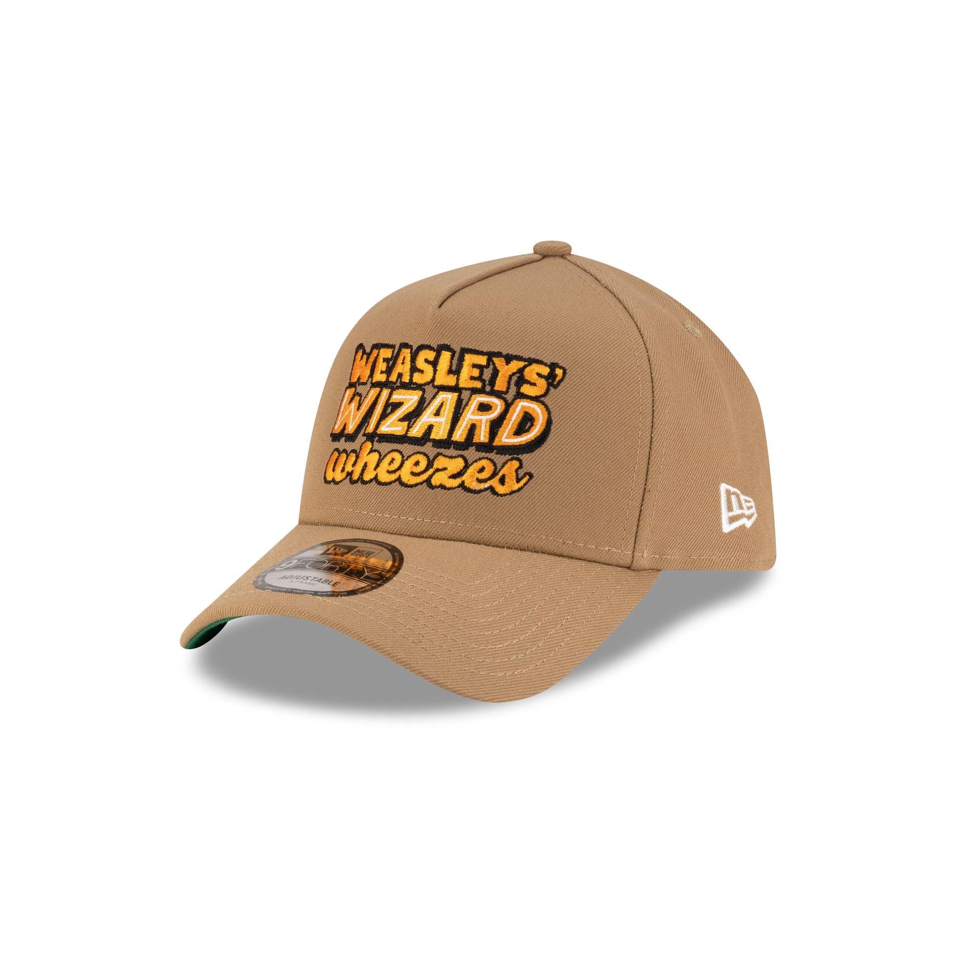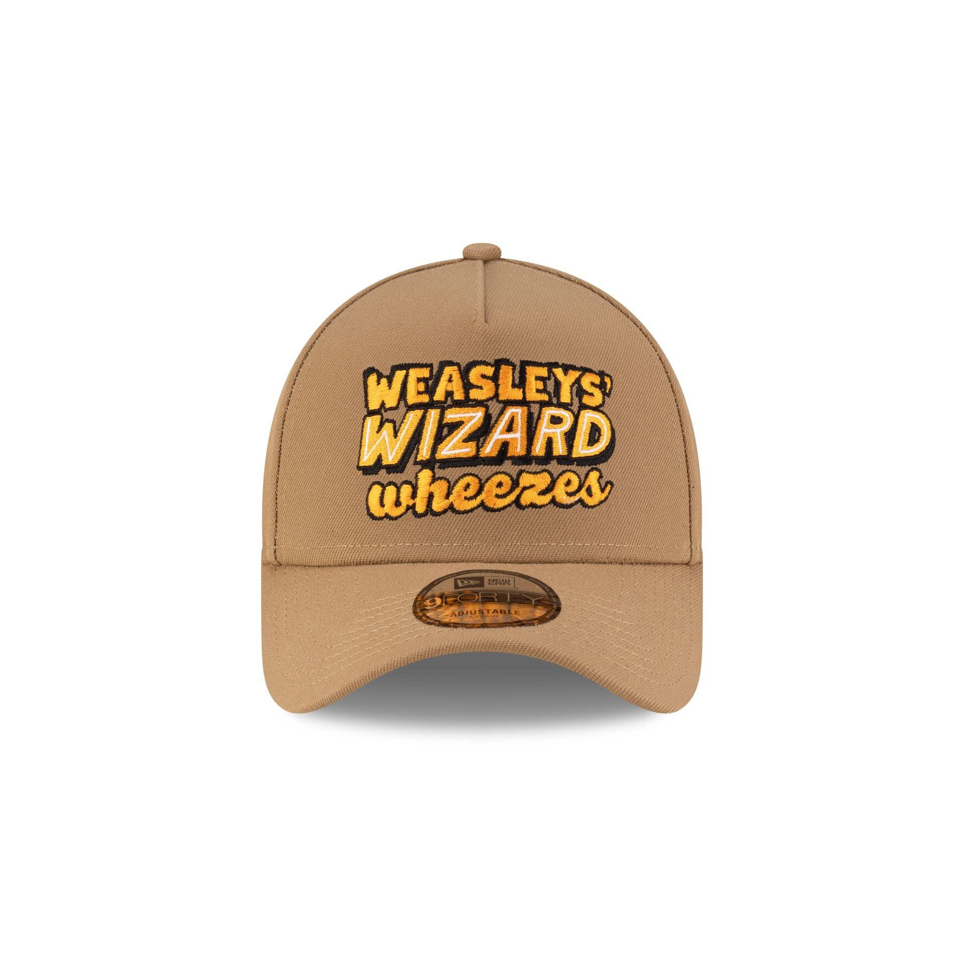 The Harry Potter Weasley's Wizard Wheezes 9FORTY A-Frame Snapback features an embroidered Harry Potter Weasley's Wizard Wheezes word mark at the front panels with a matching 93 Diagon Alley patch at the right-wear side. Additional details include a Harry Potter logo above a snapback closure at the rear and a green undervisor.