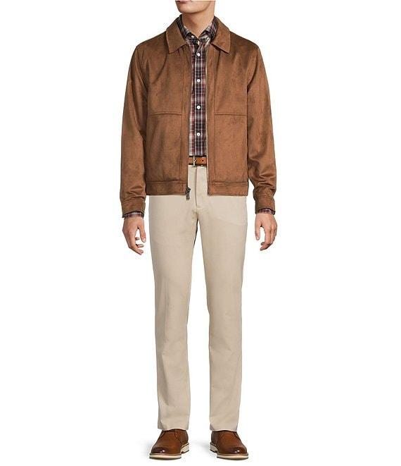 From Hart Schaffner Marx, this jacket features: Collared neckline Long sleeve adjustable cuffs Zip-front closure Soft stretch, water-resistant, faux suede shell Herringbone and swirl-pattern linings Multiple interior patch pockets Front pockets with snap closures Approx. 26" length Polyester/spandex suede with laminated backing Dry clean Imported.