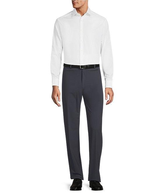 From Hart Schaffner Marx, these pants feature: Solid color New York modern fit Flat front Straight leg Front button/zip closure Belt loops Lined to the knee 2 hand pockets 2 back besom pockets 1 coin pocket on the right leg Unhemmed Polyamide/elastane Dry clean Imported.
