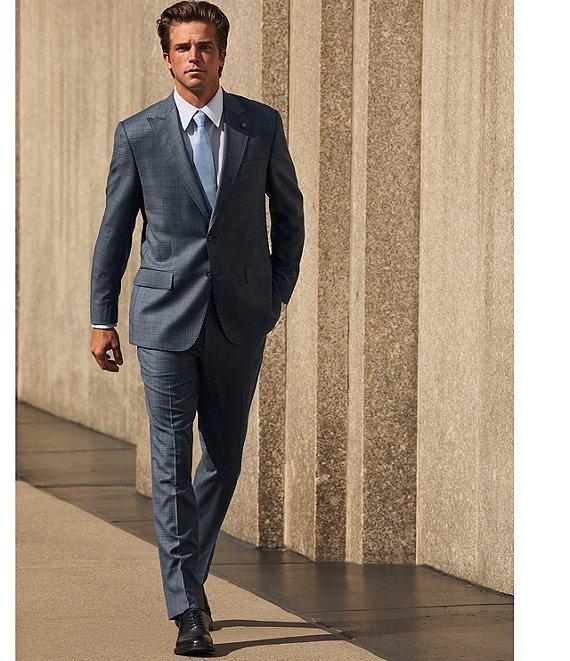 From Hart Schaffner Marx, this 2-piece suit features: Jacket: Modern fit Peak lapel Plaid Side vent Besom flap pocket 2-button closure Wool Dry clean Pants: Flat front Plaid Button closure with zip fly Wool Dry clean Imported.