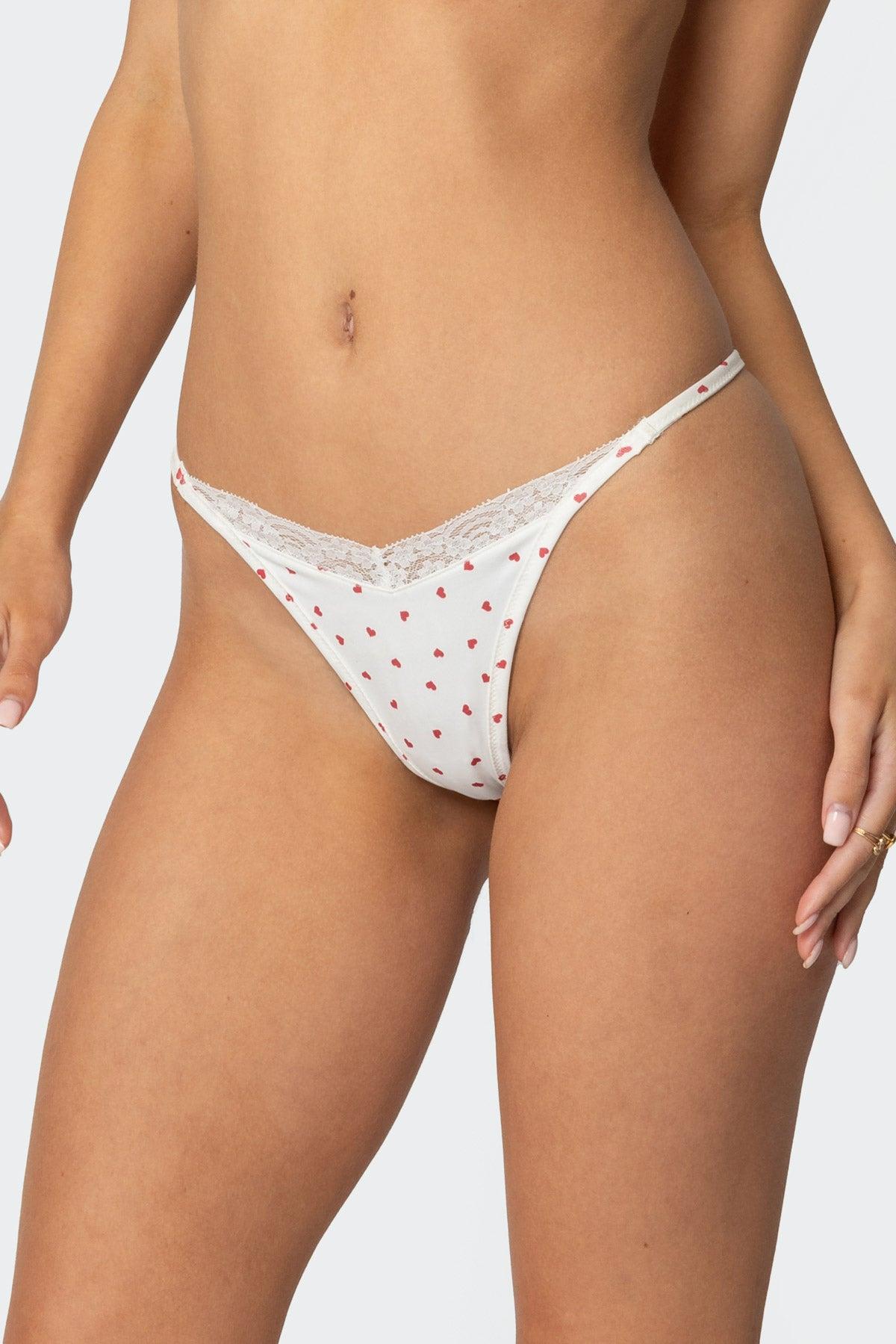 Thong Lace trim Heart graphic print Cotton gusset Polyester, Spandex Model wears size S Model height is 5'9 Item care: Machine wash at maximum 30ºC, do not bleach, do not tumble dry, iron at a maximum of 110ºC, do not dry clean