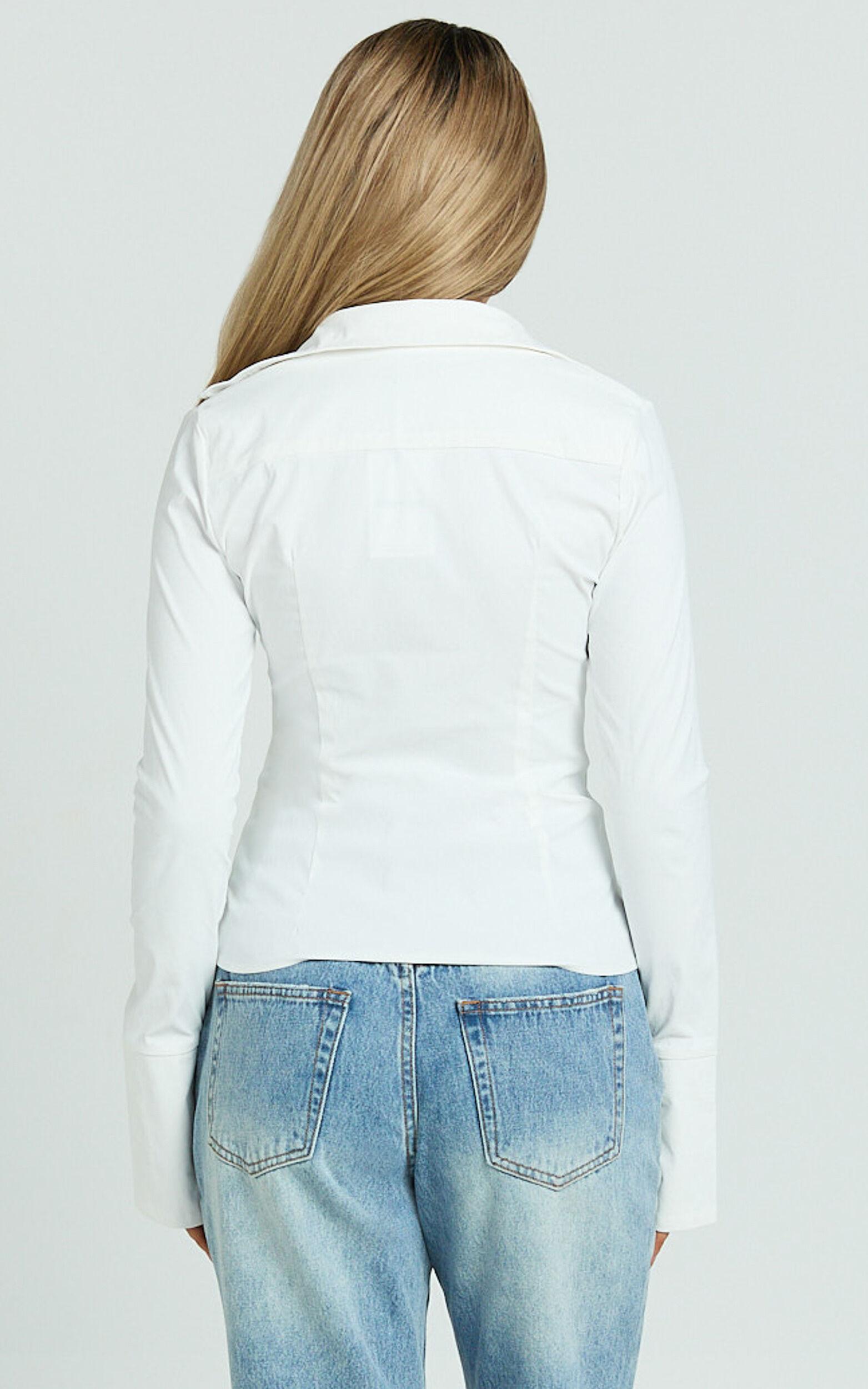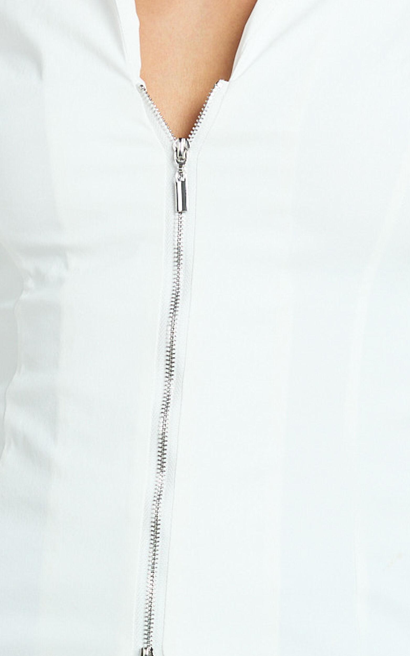 Meet your new go-to: the **Hartley Top – Long Sleeve Zip Through Fitted Shirt in White**. Designed for those who love to blend comfort with polish, this chic piece is crafted from a mid-weight woven nylon that offers a flattering fit without sacrificing breathability. The zip-through front adds a modern twist to the classic white shirt, making it easy to style from casual brunches to after-hours plans.Product Details:Zips closure Inner lining Mid weight woven Collar neckline Standard length Long sleeves Nylon material Casual wearSize and FitSize S / 8 length: 59.5cm / 23.43inMaterial and Care97% Nylon, 3% SpandexMedium Stretch