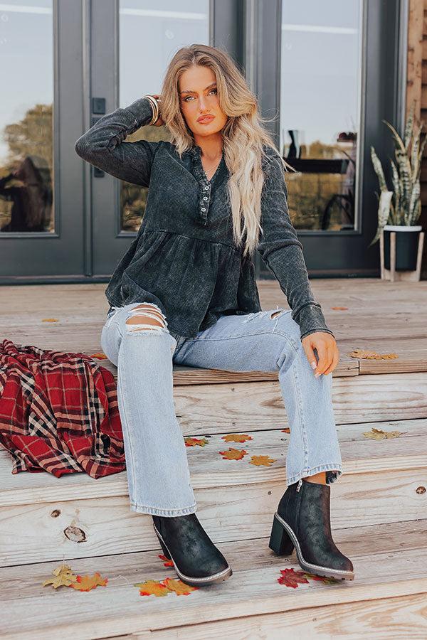 - Add a trendy twist to your fall wardrobe with this adorable waffle knit top! Whether you're heading out on a coffee run or enjoying a fall festival, this super-cute piece brings a playful vibe to any outfit. - Unlined waffle knit material with a mineral wash - A v-cut neckline that buttons down into a three buttoned bodice - Unfinished frayed seam accents - Long sleeves with double layered cuffs - A relaxed silhouette that ends in a peplum cut high-low hemline