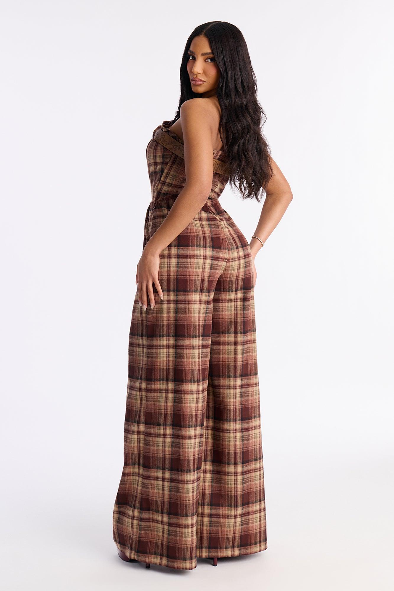 Harvest Chic Plaid Wide Leg Jumpsuit - Brown Female