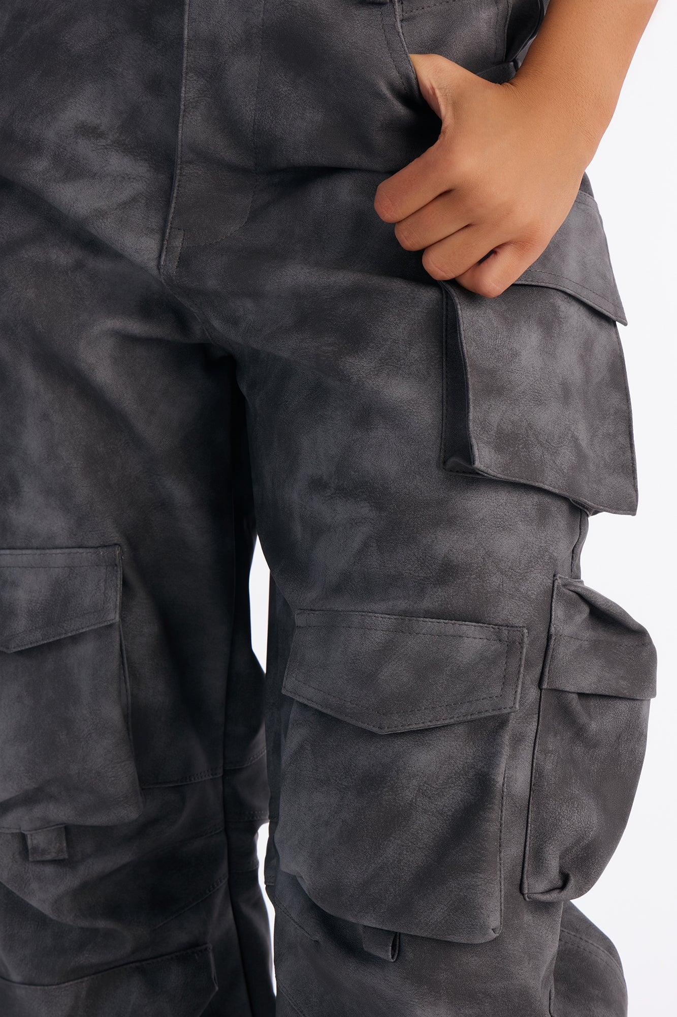 Available In Black Wash And Olive. Cargo Pant Faux Leather High Rise Button Zipper Closure Utility Pockets Mineral Wash Non Stretch Shell: 85% Polyester 15% Cotton with Polyurethane Coating Lining: 90% Polyester 10% Cotton Imported