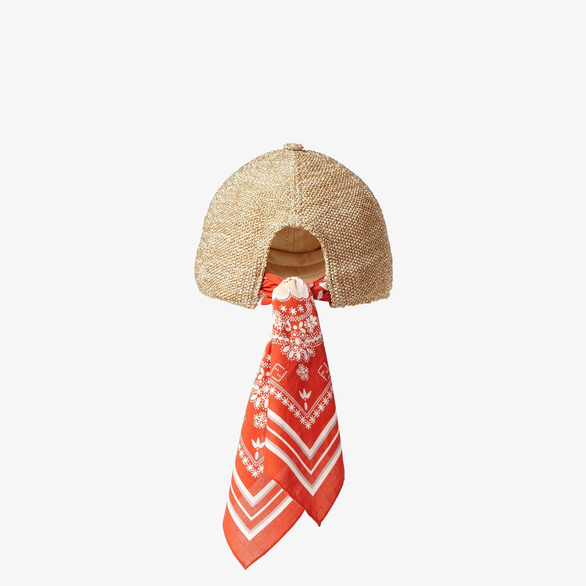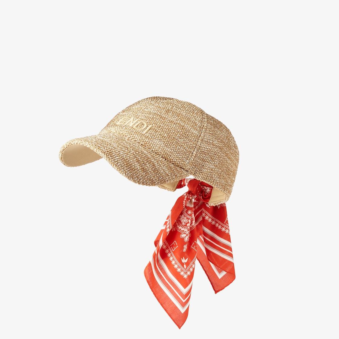 Baseball cap with semi-stiff peak and foulard to tie at the back. Made of viscose raffia with Fendi logo embroidered on the front. The cotton foulard is embellished the Coral Bandana print, embellished by a delicate pattern of floral, coral and micro FF details in red and white. Made in Italy