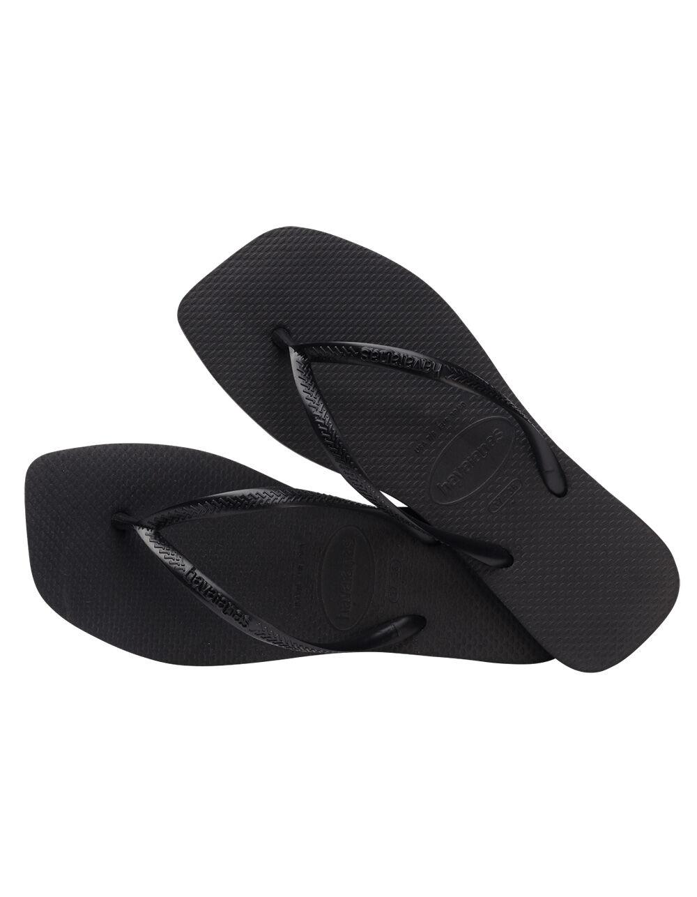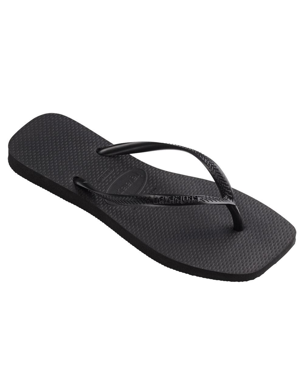 Havaianas Slim Square Flip Flops. Open toe flip flops with a square shape. Slip-on design. Slim Havaianas straps. Havaianas rubber logo. Cushioned footbed with textured rice pattern and rubber flip flop sole. Flexible premium Brazilian rubber. 100% Rubber outsole. Imported.