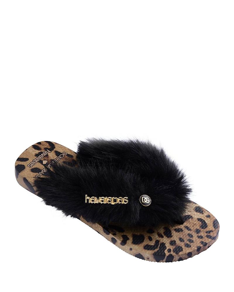 Part of the second drop of havaianas collaboration with the iconic Italian fashion brand, the new Leopard Dolce & Gabbana x havaianas flip-flops feature bold faux fur straps. The iconic all-over print covers the sandal insole and its finished with an embellished pearly domed Dg pin and metallic havaianas logo hardware.
