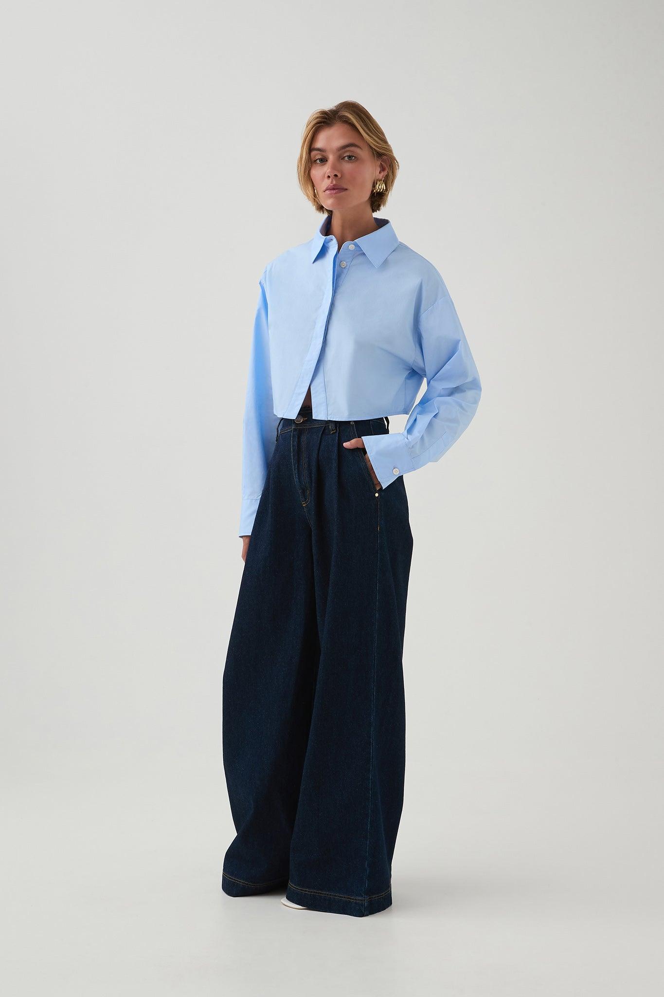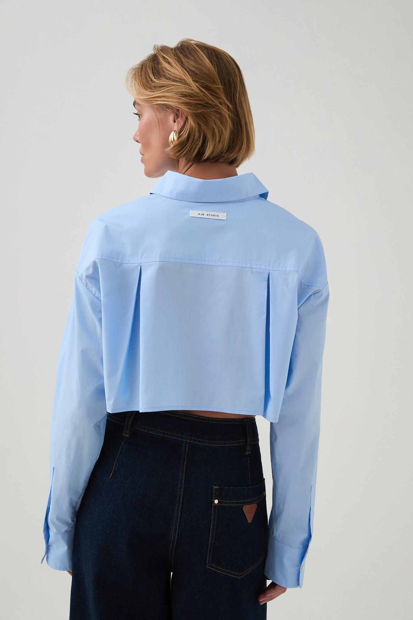 PRODUCT DETAILS Aje Studio Cropped shirt Collar Split placket with concealed buttons Long cuffed sleeves Back pleats Logo label at back 100% Cotton Shop All Tops SIZE AND FIT Joanna wears a size AU 8/S and is 170cm/5'7