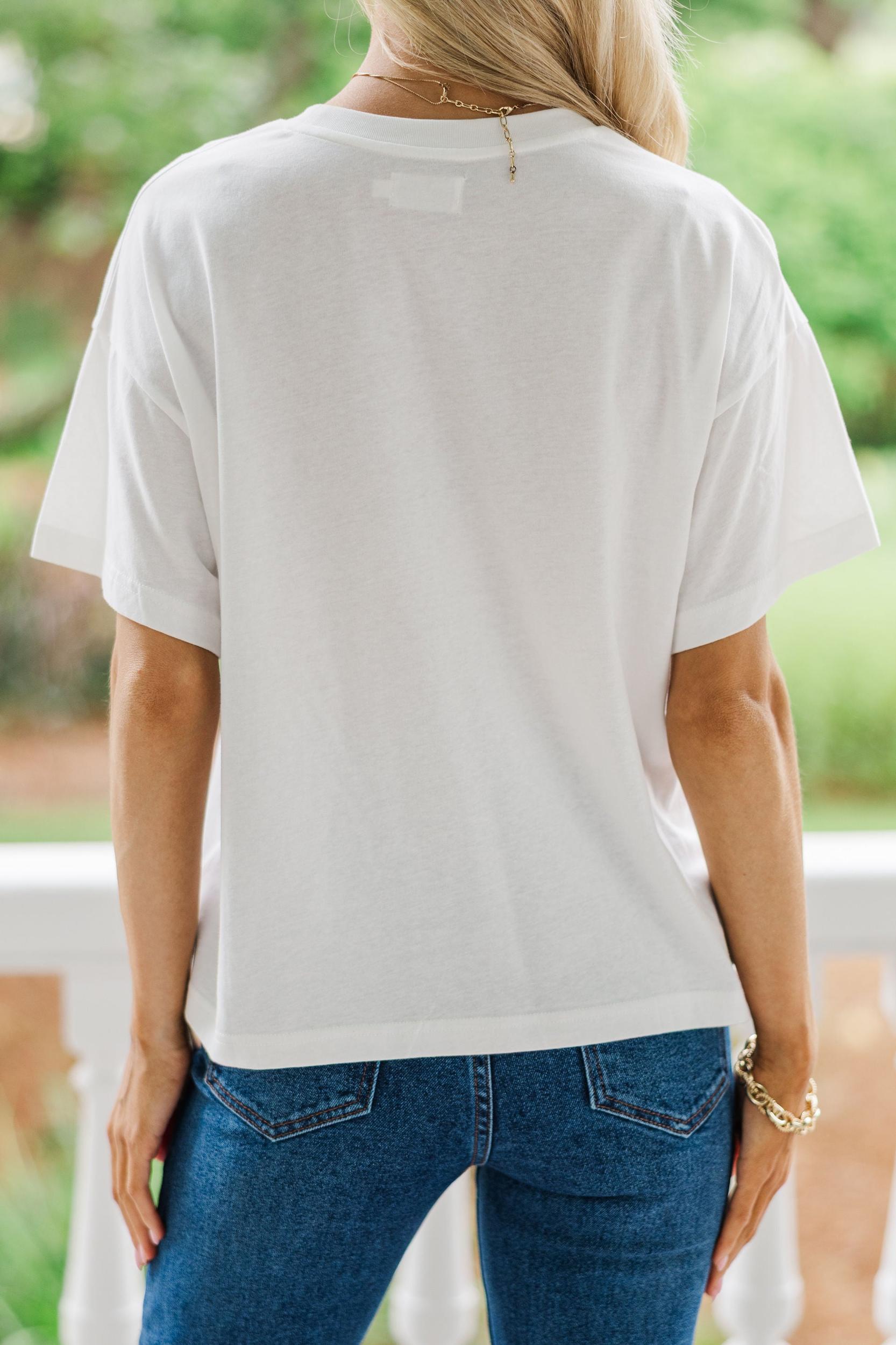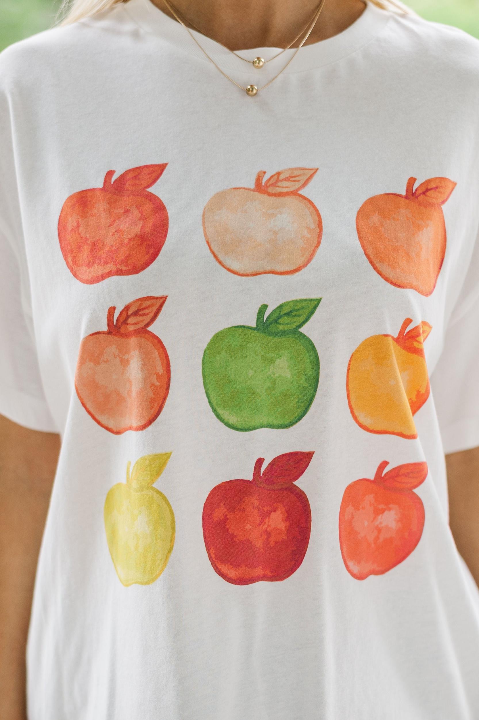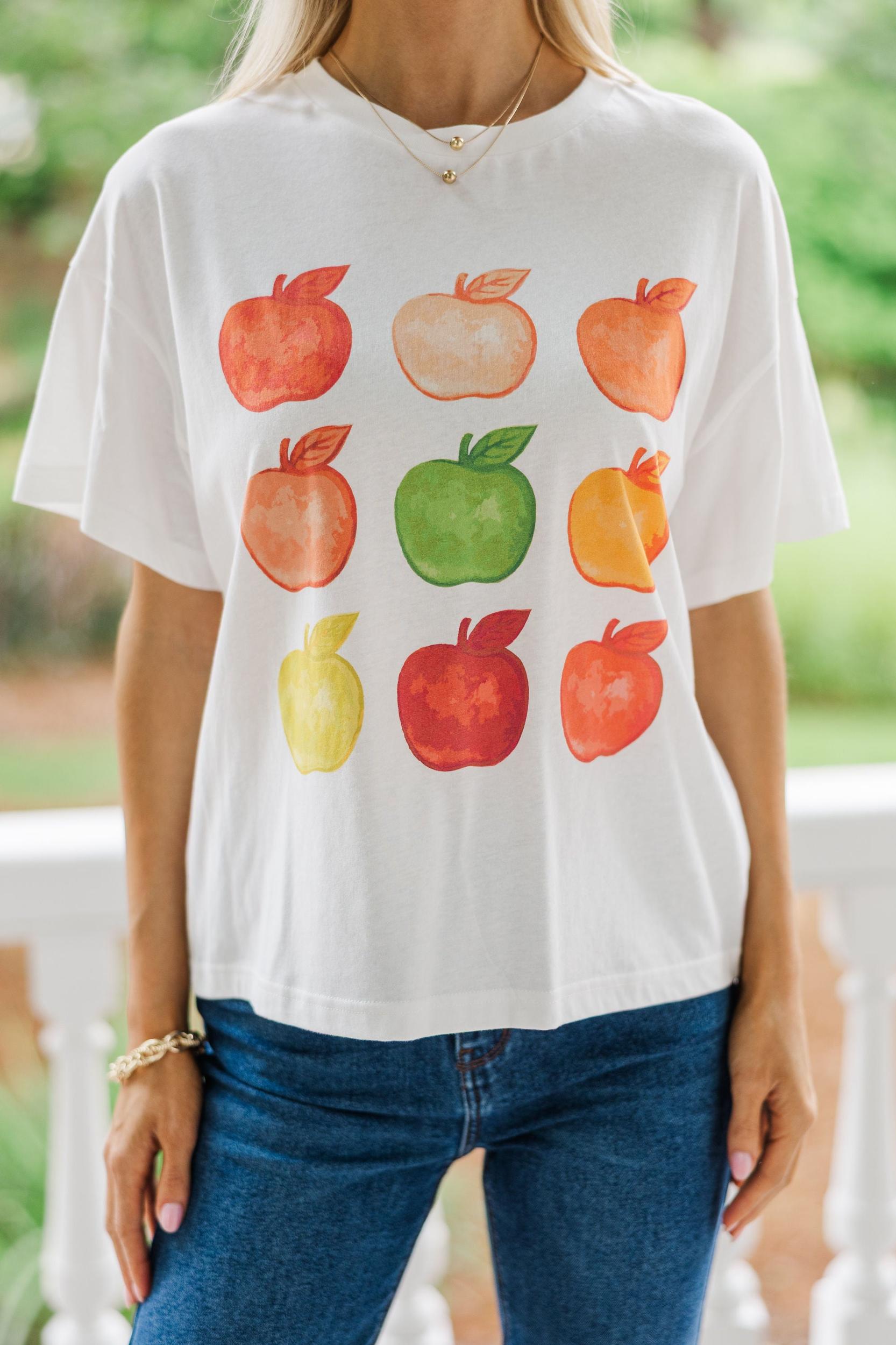 How cute is this apple tee?! With a colorful grid of watercolor apples and a relaxed fit, this tee is perfect for teachers, apple picking, or just keeping things fun and fruity. Pair it with denim or tuck it into a skirt for a playful pop of personality! Round Neckline Short Sleeves Watercolor Apple Graphic Material has generous amount of stretch Baileigh is wearing the small.