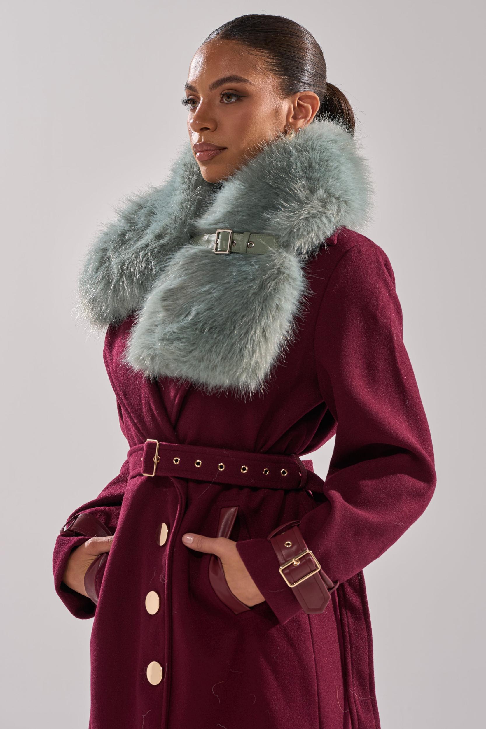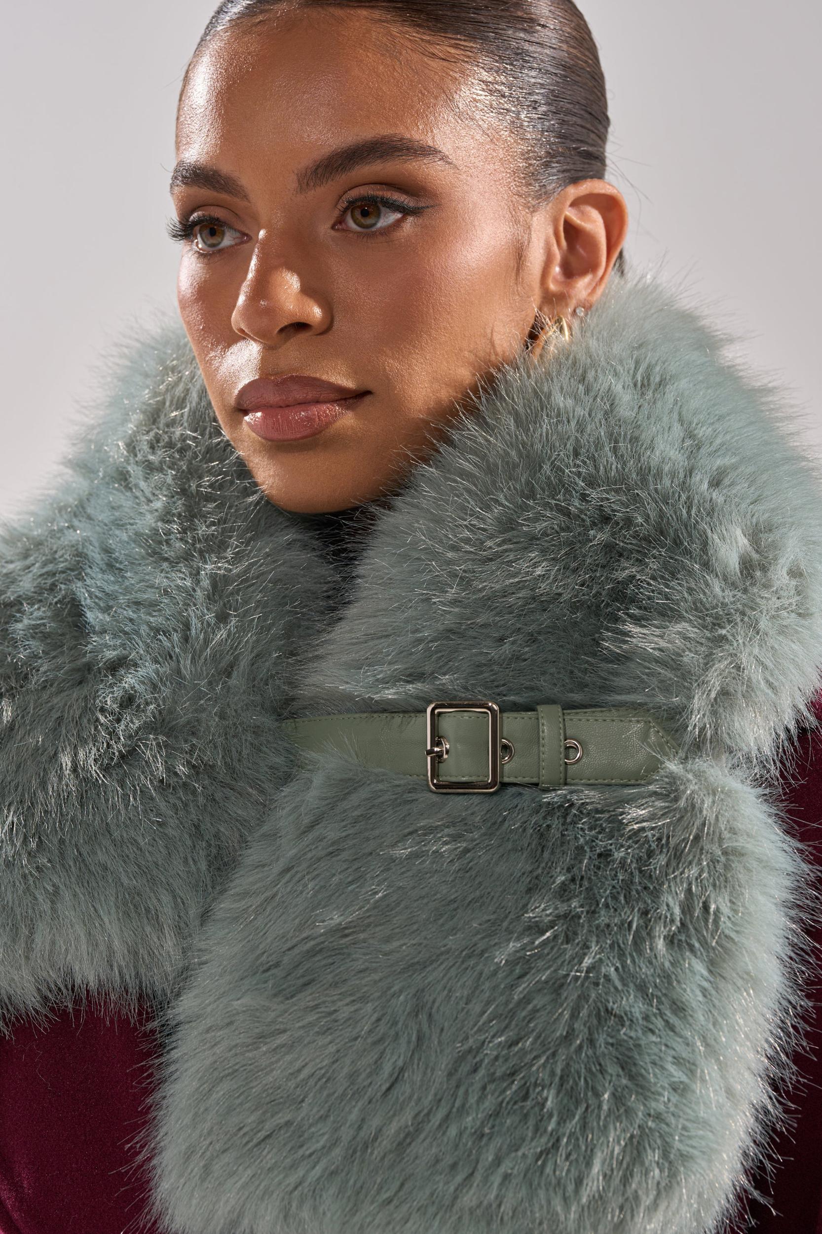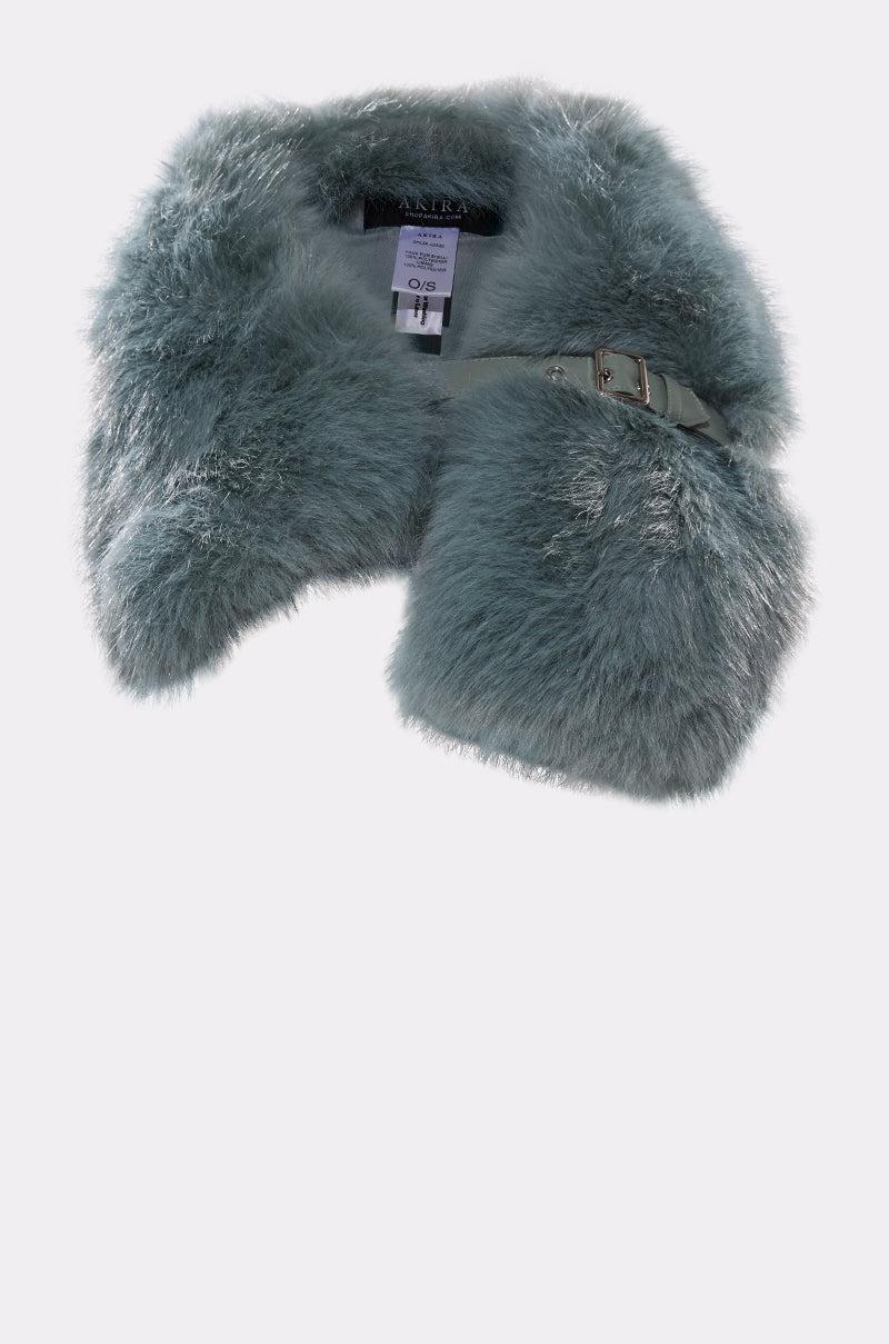 The AKIRA Label Have It All Faux Fur Shawl is a luxe layering piece crafted from ultra-soft faux fur in a pretty turquoise tone. Designed to drape elegantly over the shoulders, it features a sleek faux leather strap with an adjustable buckle closure for a secure and customizable fit. The voluminous texture adds warmth and dimension, making it a standout accessory for eveningwear, formal occasions, or elevating outerwear. - Fur: 100% Polyester, Lining: 100% Polyester- Dry Clean Only- Imported (all measurements approximate from size O/S)- 35” Length X 8” WidthProduct ID: 1068353