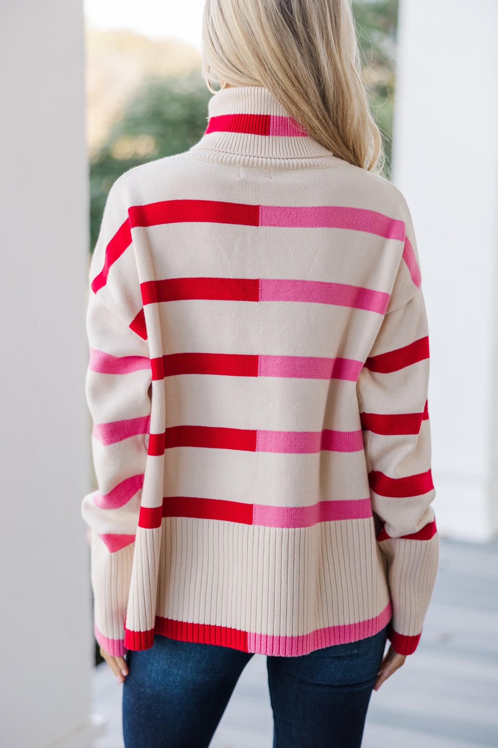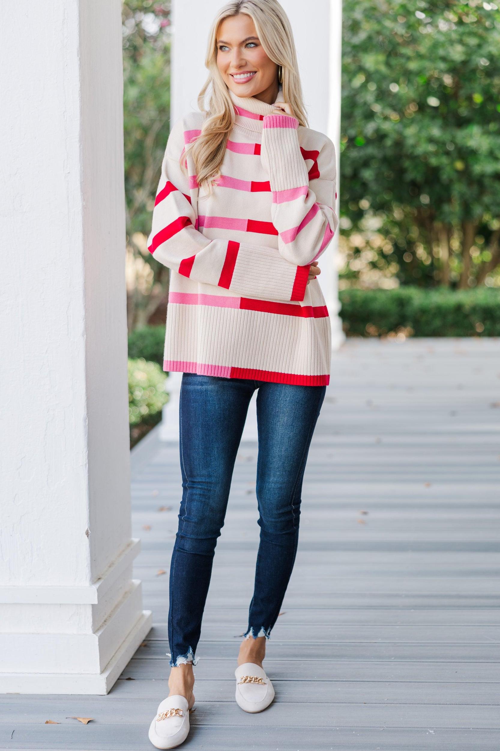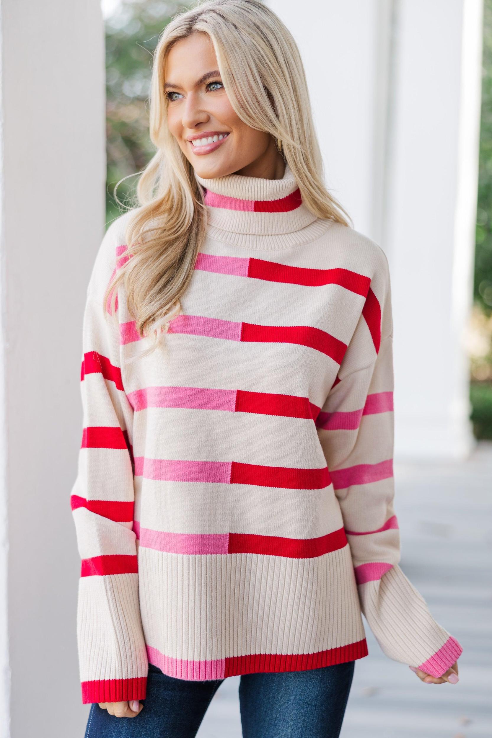 You are going to have so much fun in this striped sweater! That fit and those girly hues are so chic! We love this classic sweater paired with jeans or leggings for a very chic look! Turtle neckline Long bell sleeves Striped print Generous stretch Baileigh is wearing the small.