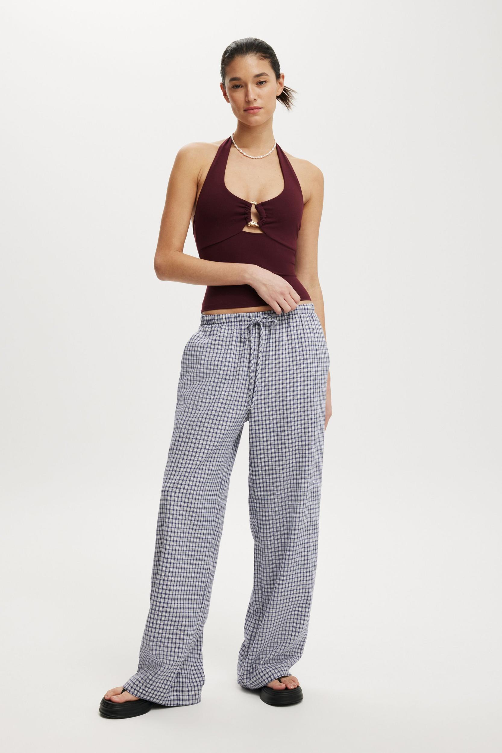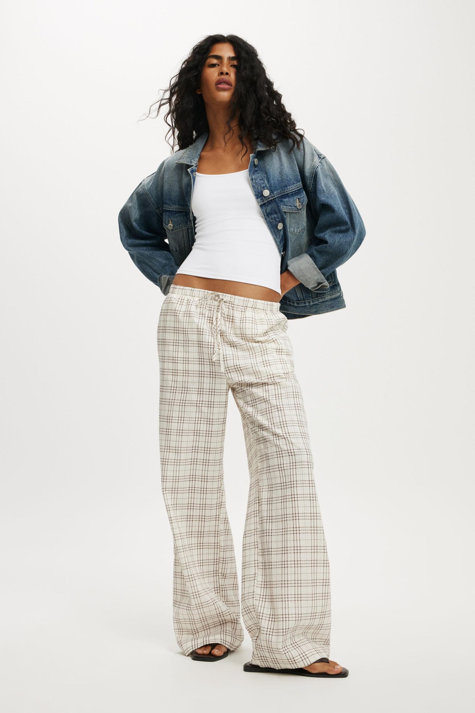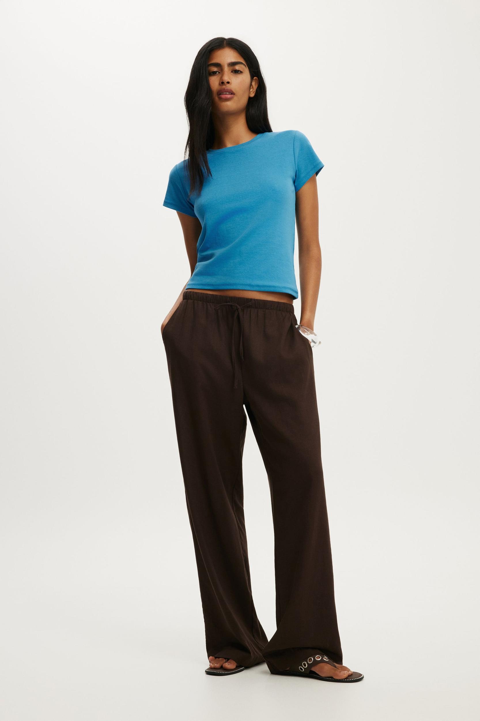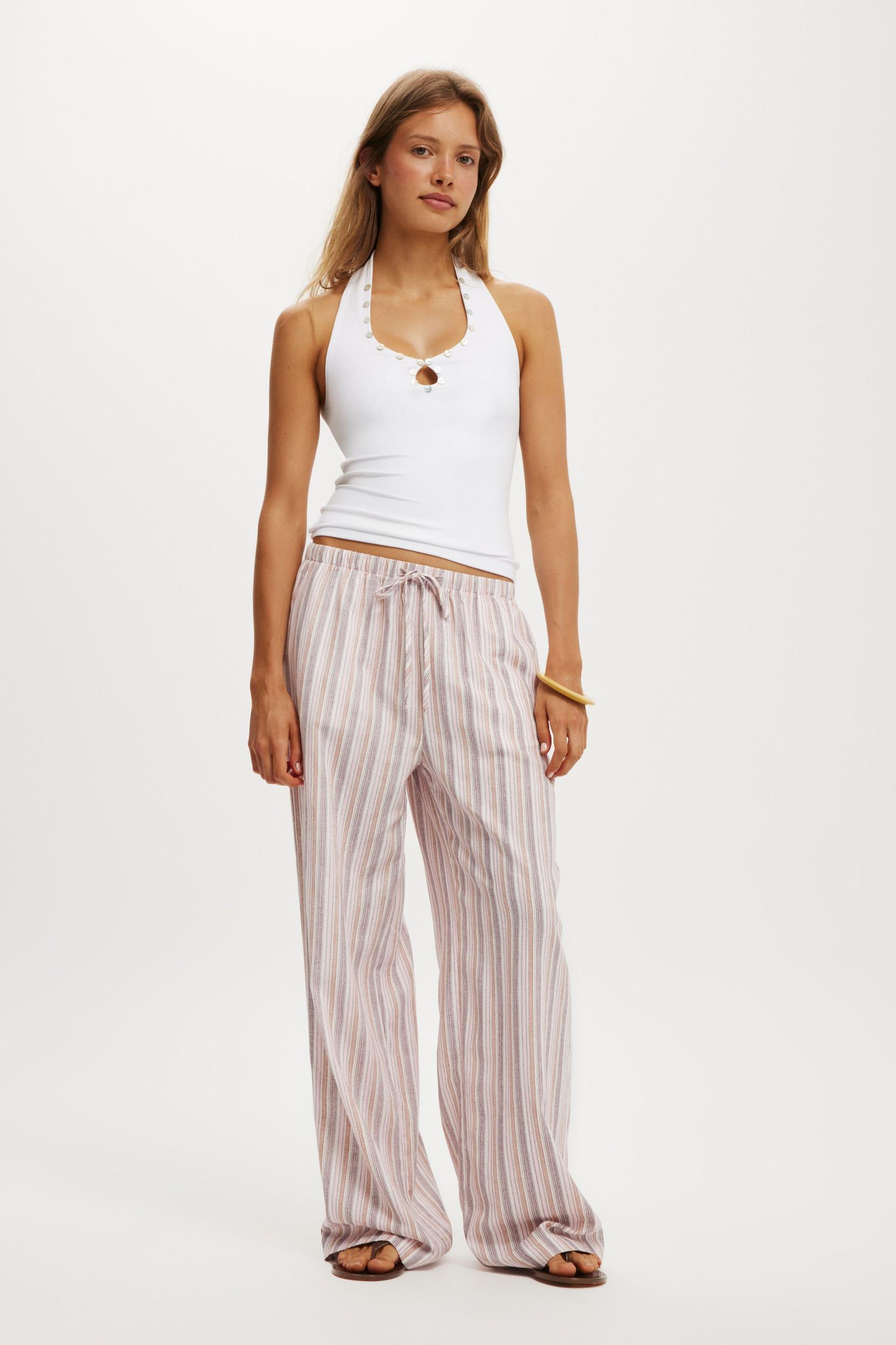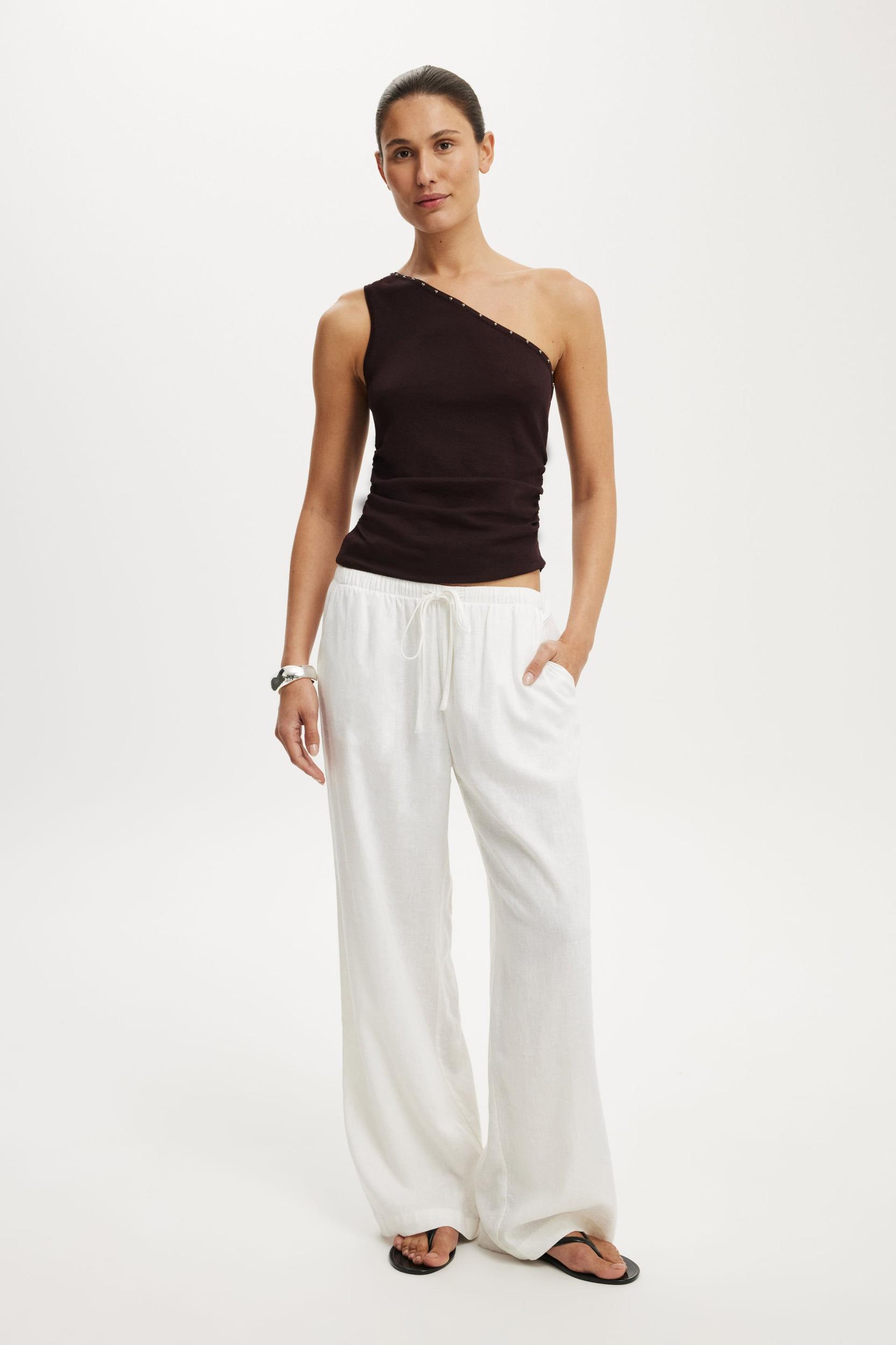 Relaxed, wide leg silhouette Elastic waistband Self drawcord Slant side pockets Unlined Breezy linen blend fabric 78cm inleg length