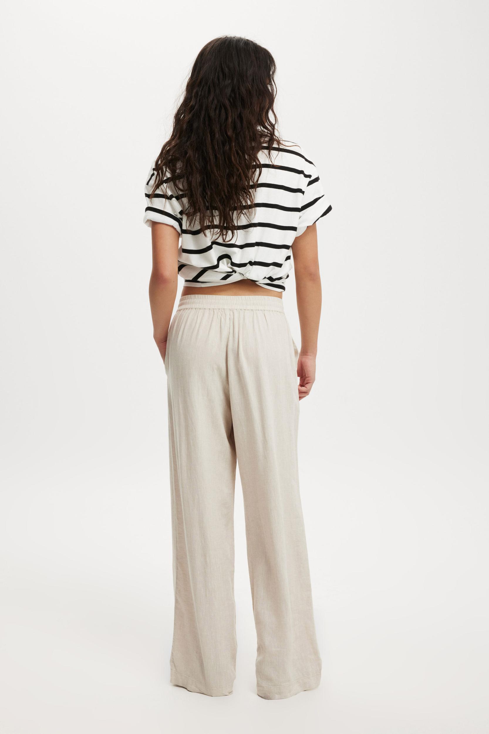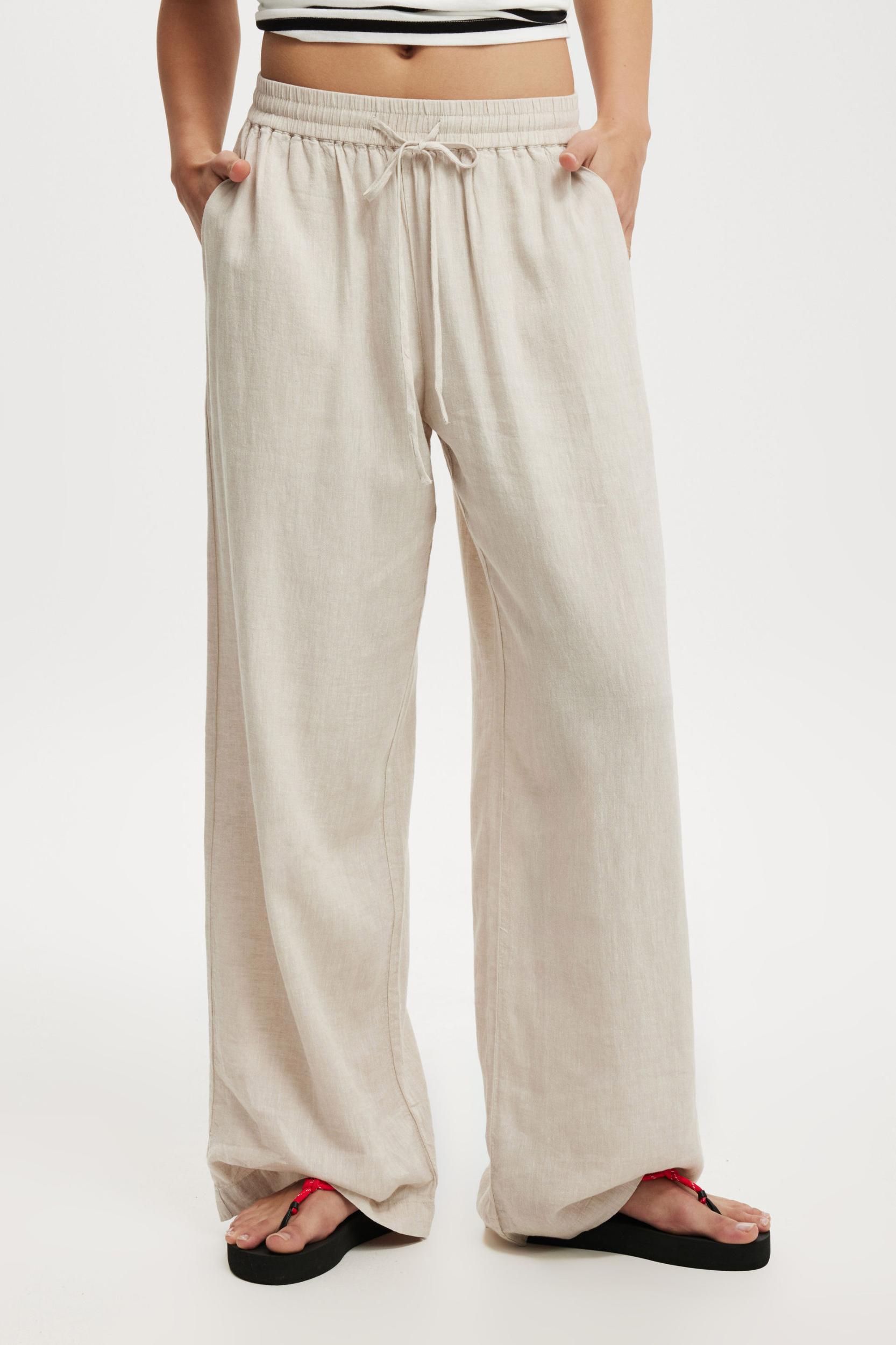 Relaxed, wide leg silhouette Elastic waistband Self drawcord In-seam side pockets Unlined Breezy linen blend fabric 78cm inleg length