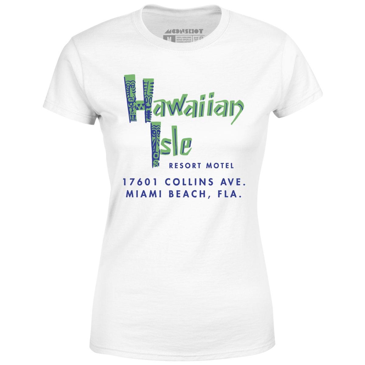 Hawaiian Isle Resort Motel on Collins Avenue in Miami Beach opened in 1952 with a second wing added in 1954 and offered a tropical escape with fresh and saltwater pools kiddie pools a 500 foot private beach nightly dancing and floor shows in the tiki night club the exotic bamboo room an outrigger bar oceanfront dining in the aloha dining room and highly stylized tiki decor. It captured that tiki bar energy of mid century Florida before closing and making way for the Pinnacle condominium. This retro vintage design was inspired by the vintage tiki bars of yesteryear. Printed on our super soft 100% ringspun & combed cotton women's T-Shirt. Or upgrade to our Luxury 52/48 cotton/poly vintage heather edition for an even softer classic look. We print & ship all of our high quality graphic tees in the USA.