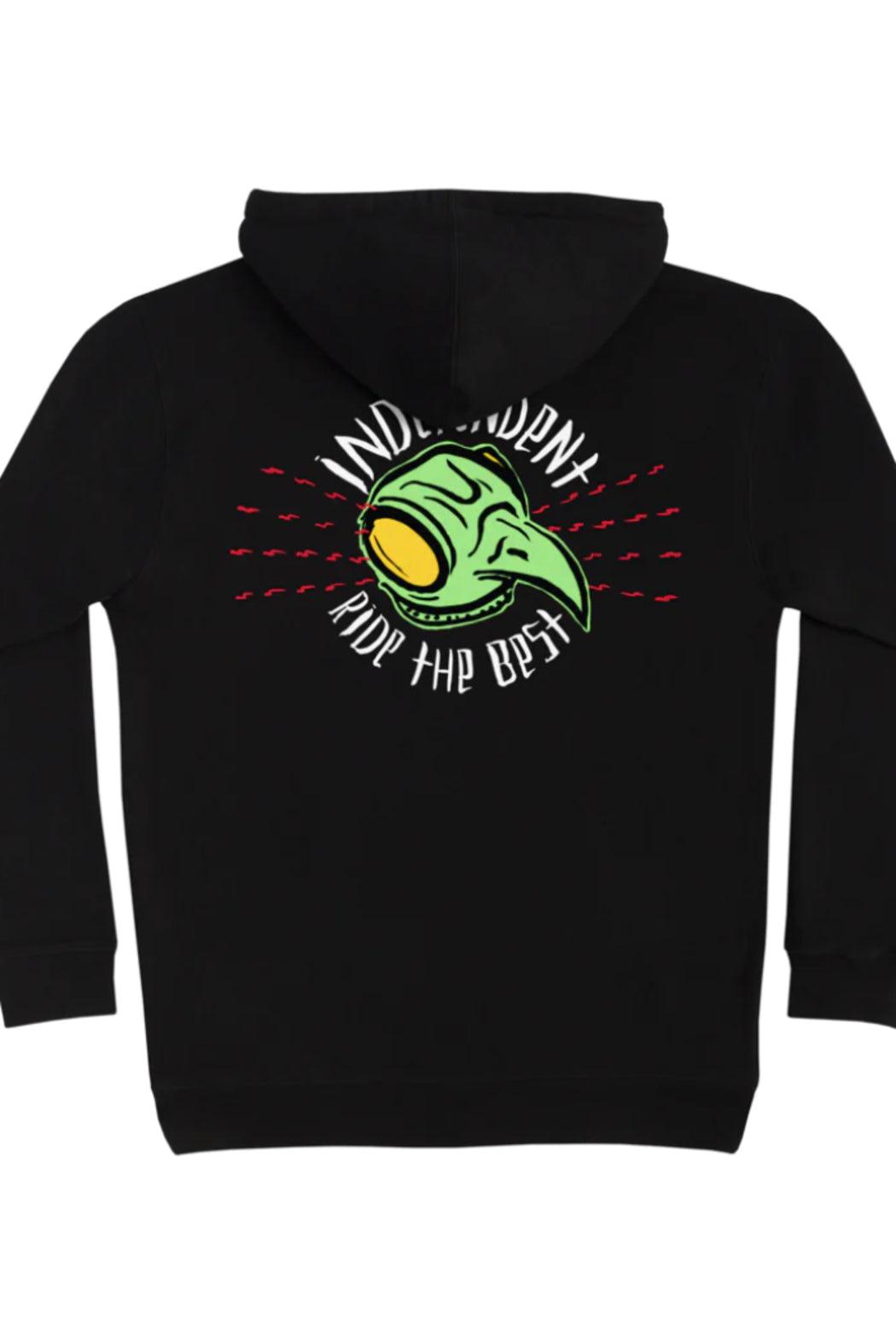Independent Trucks proudly releases the Tony Hawk Transmission collection. This legendary collaboration features glow-in-the-dark artwork created for Tony Hawk by famous Devo frontman, Mark Mothersbaugh. The new Hawk Transmission men's midweight pullover hooded sweatshirt features small chest, large back and interior hood Hawk Transmission prints in glow-in-the-dark soft hand ink. Skateboarding's greatest icon rides the best. Independent Trucks ? Built to Grind.