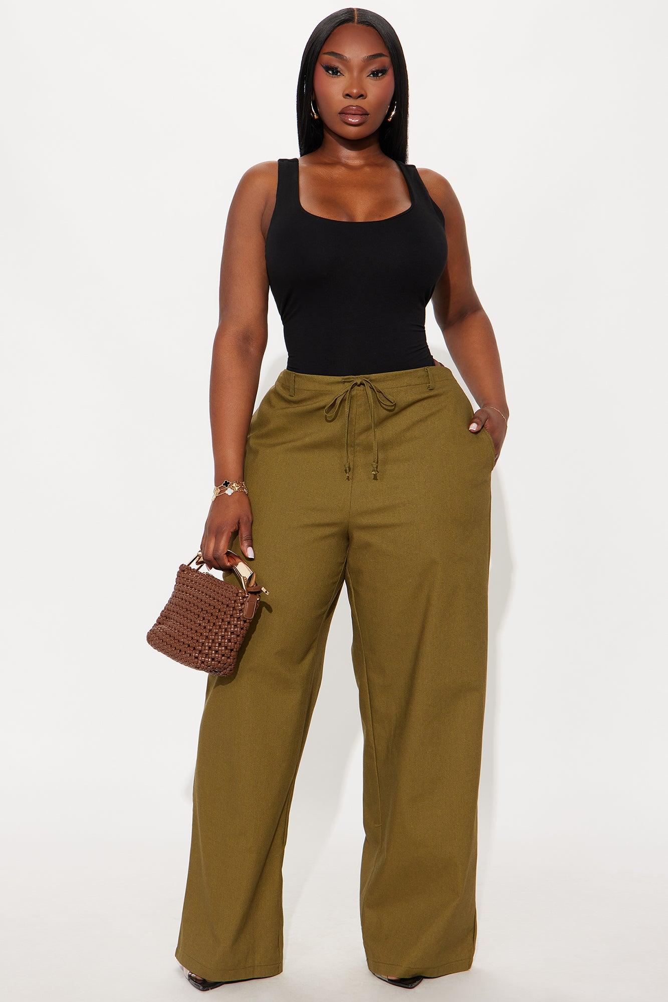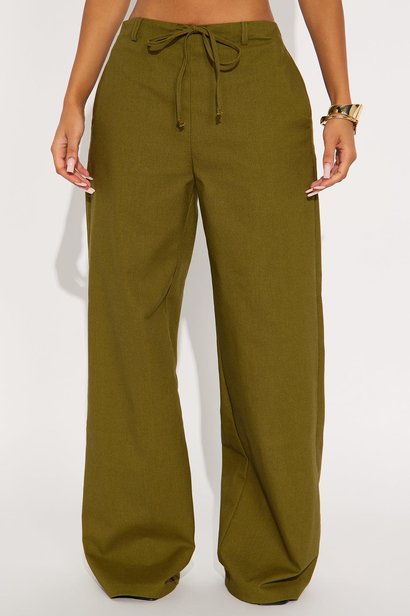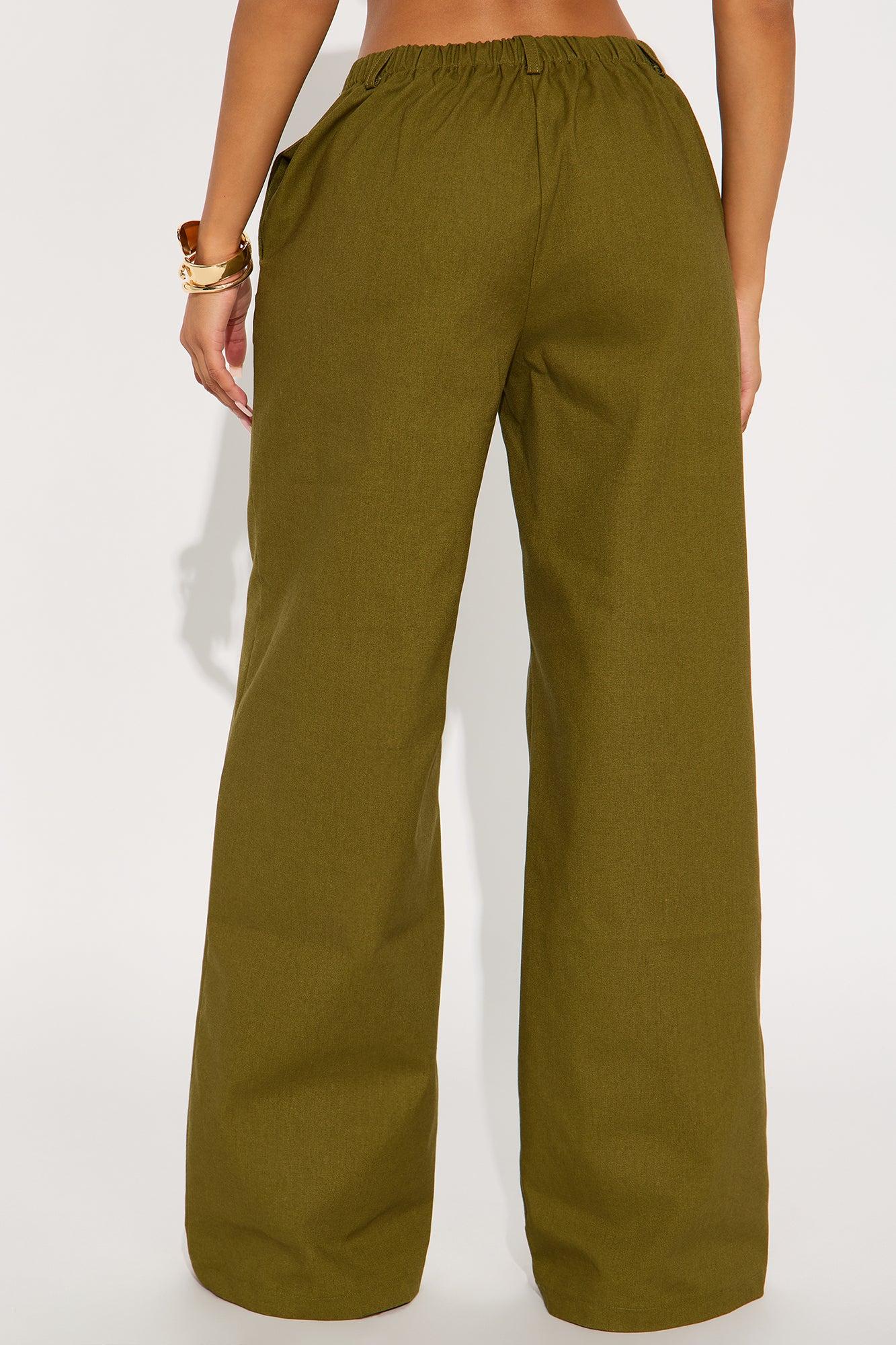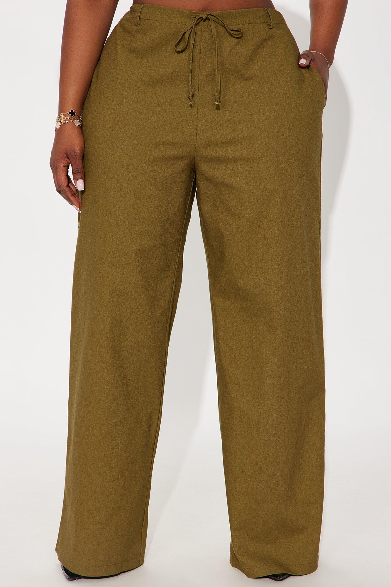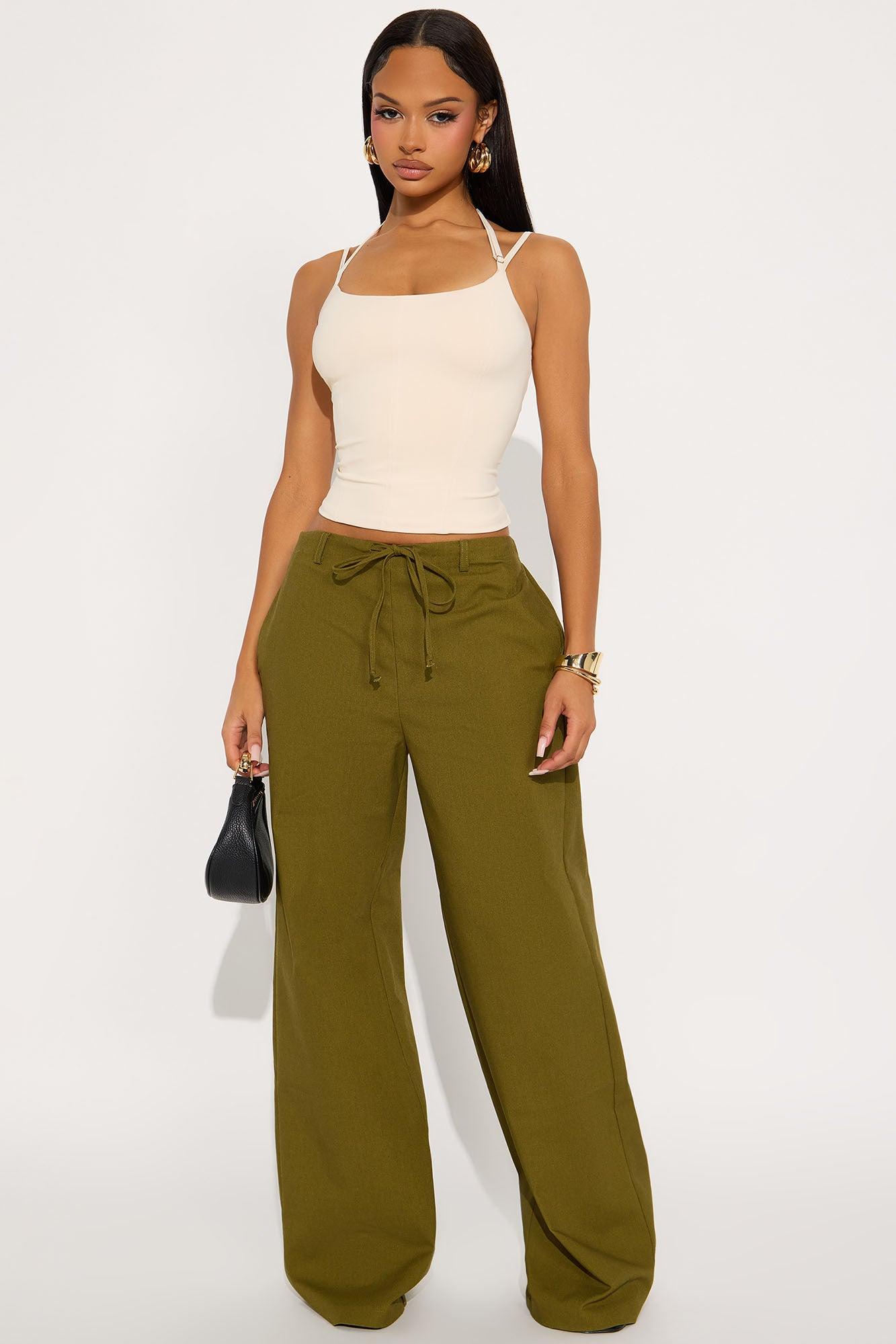 Available In Olive And White. Linen Trouser Pant Mid Rise Elastic Waistband Back Drawstring Hand Pockets Wide Leg Non Stretch 32" Inseam 50% Cotton 50% Linen Imported