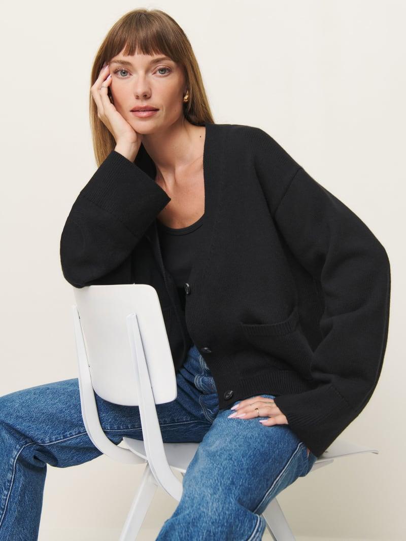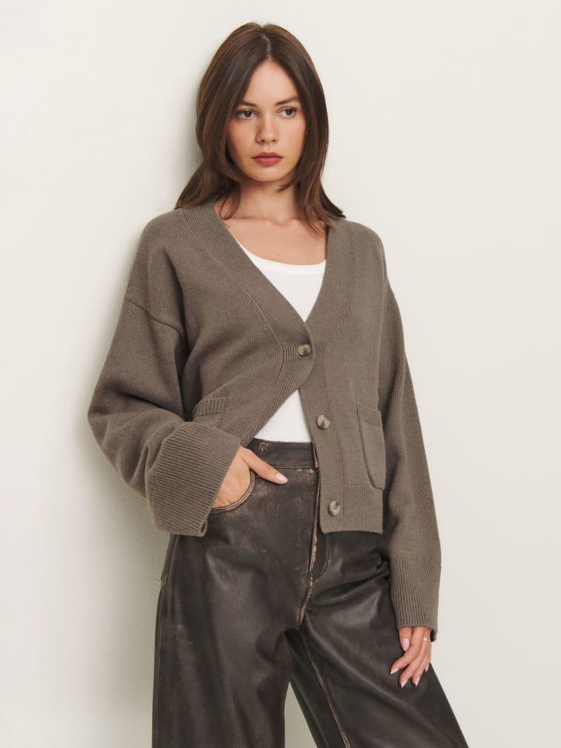 Layer up. Shop the Hayes Cashmere Blend Cardigan from Reformation, a V-neck cardigan with a button front, patch pockets, and flared sleeves.