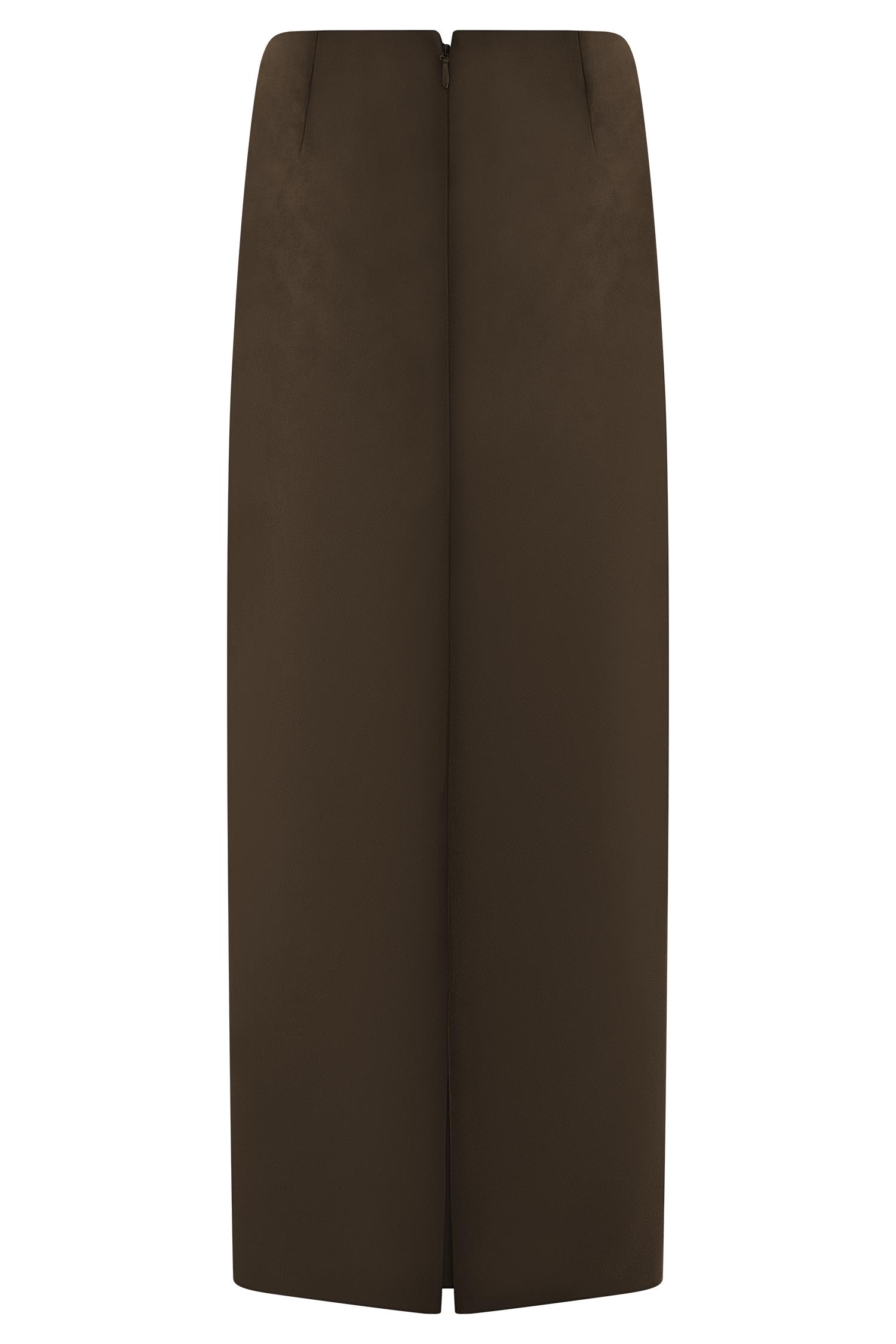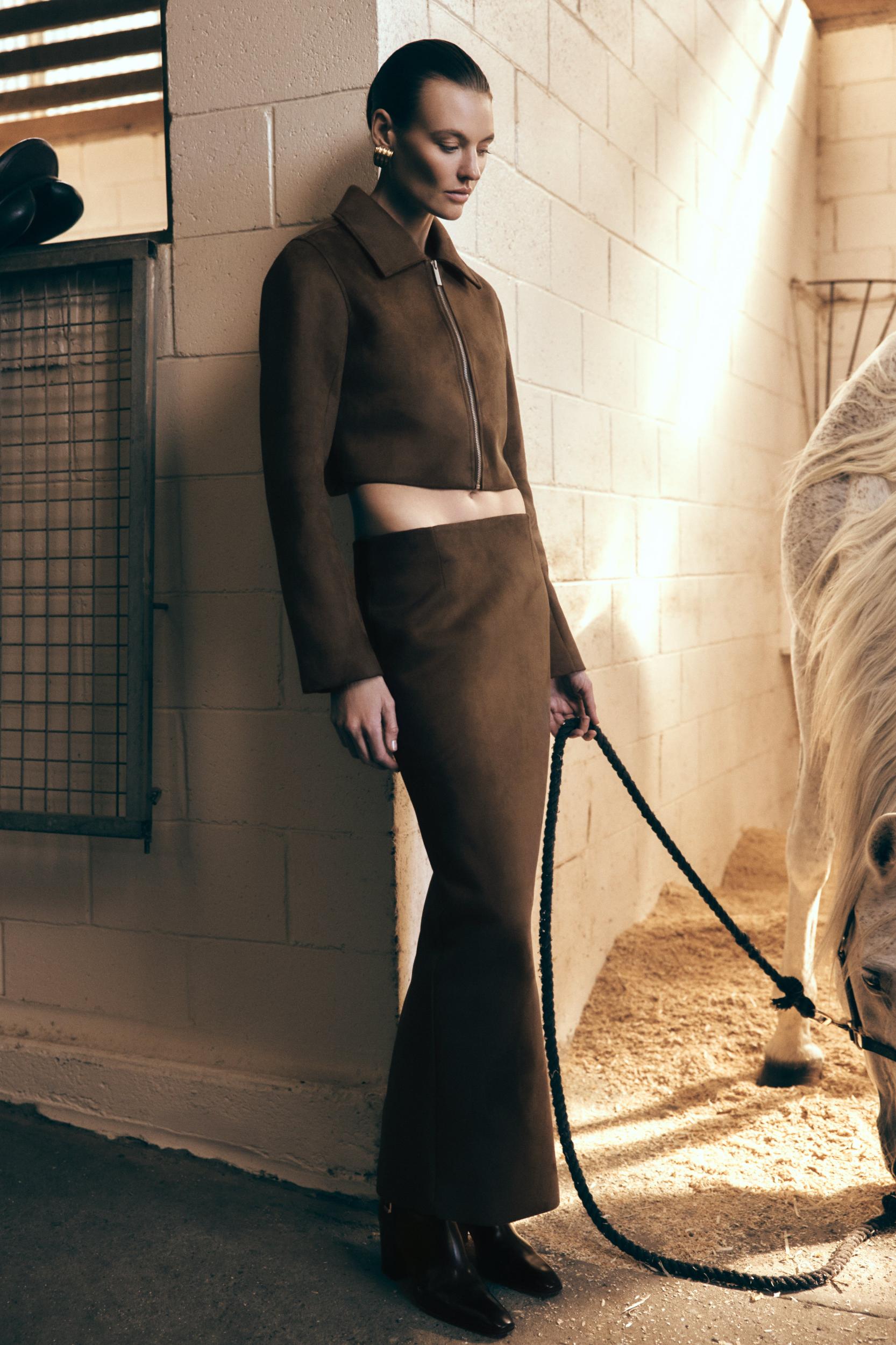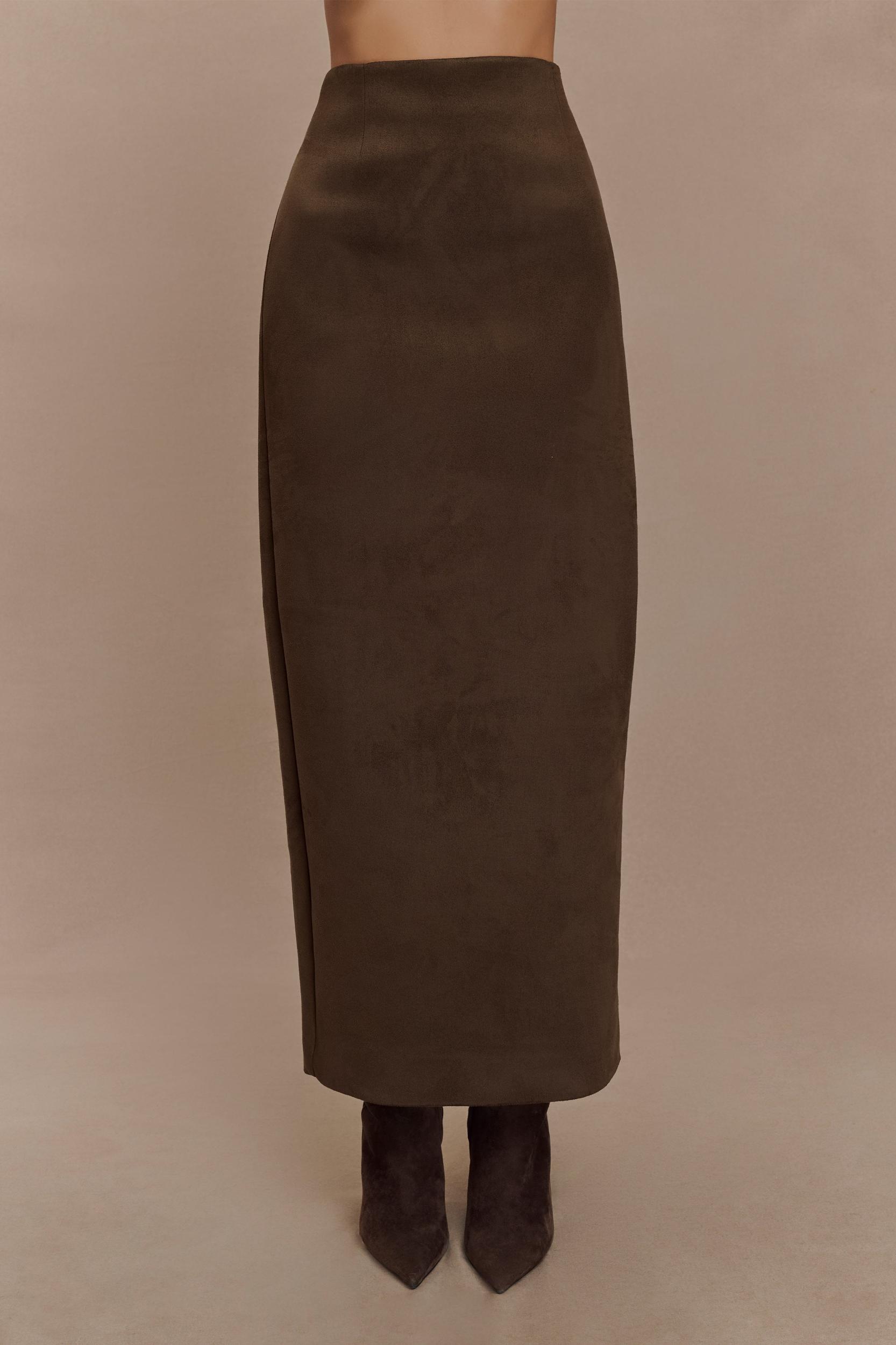 Soft suede, strong shape. Refine your wardrobe with the HAYES Faux Suede Midi Skirt, a high-waisted staple crafted in luxe faux suede for a smooth, structured fit. This maxi-length silhouette features a front fly opening, belt loops, and back patch pockets for a subtle nod to utilitarian style. A centre back split adds ease of movement, while the full lining ensures all-day comfort. Designed to pair seamlessly with the Hayes Faux Suede Collared Jacket, this set delivers effortless coordination with elevated edge.
