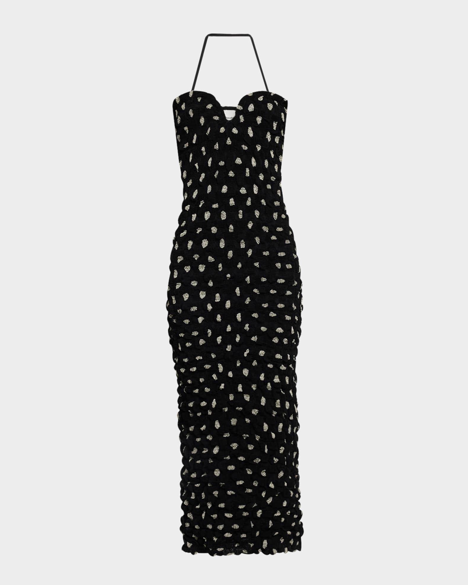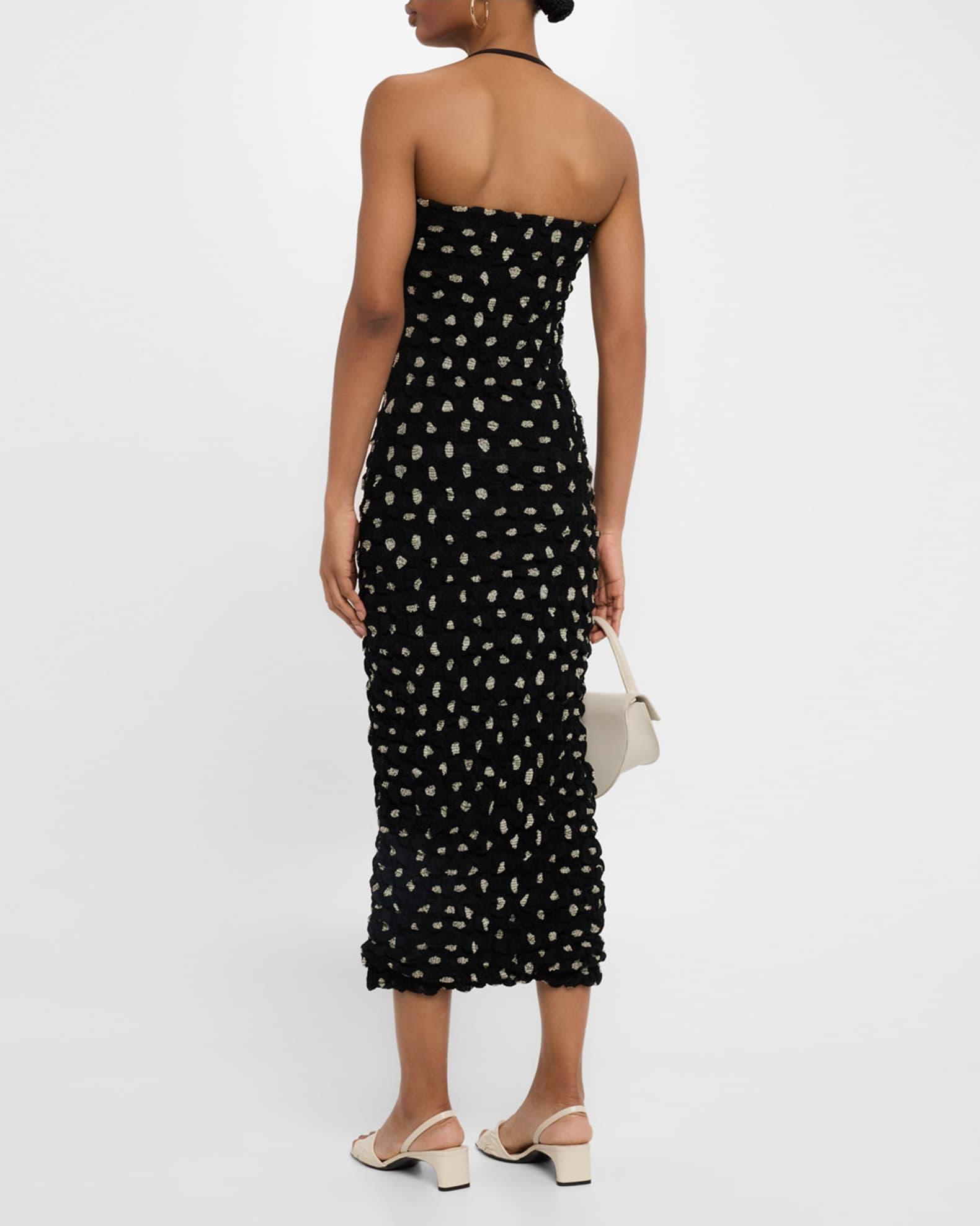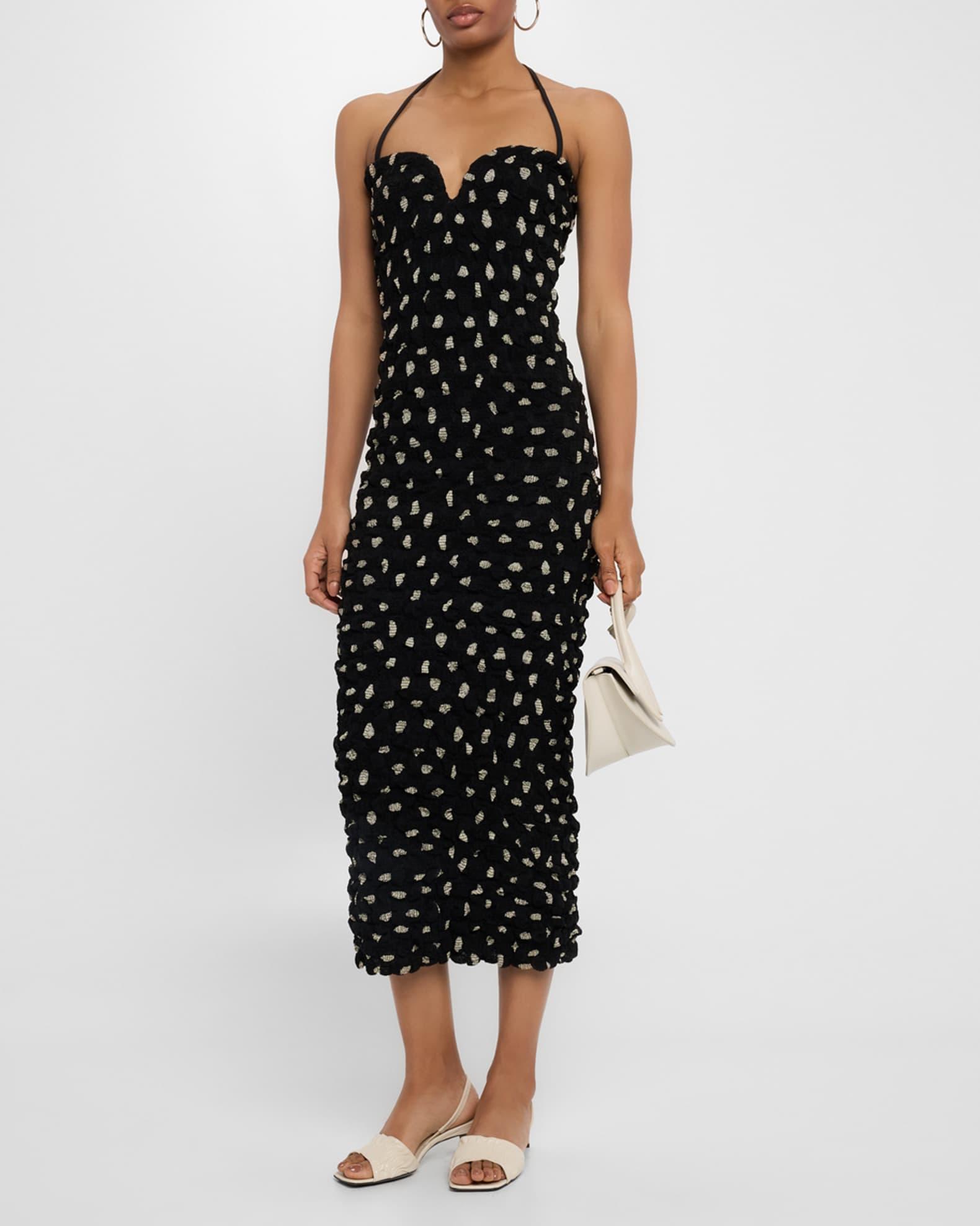 Nanushka "Haylen" polka dot midi dress in a textured seersucker chiffon Halter sweetheart neckline Sleeveless Figure-hugging silhouette Hem falls below the knee Slipover style Rayon/cellulose acetate/polyester/viscose Lining: Polyester Machine wash warm Imported