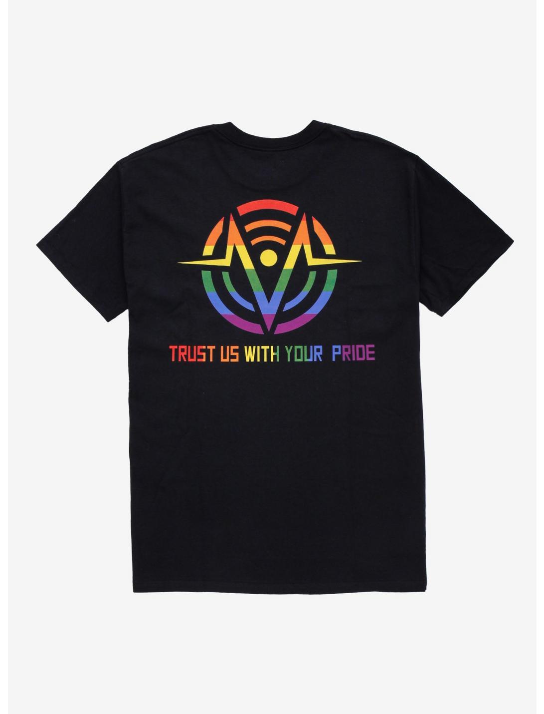 Celebrate your pride with the Vees! This Hazbin Hotel tee features Vox, Valentino and Velvette posing together holding pride flags that represent their identity. The back side has the VoxTech logo in rainbow stripes with "Trust us with your pride" underneath.Only available at Hot Topic!100% cottonWash cold; dry lowImportedListed in unisex sizes