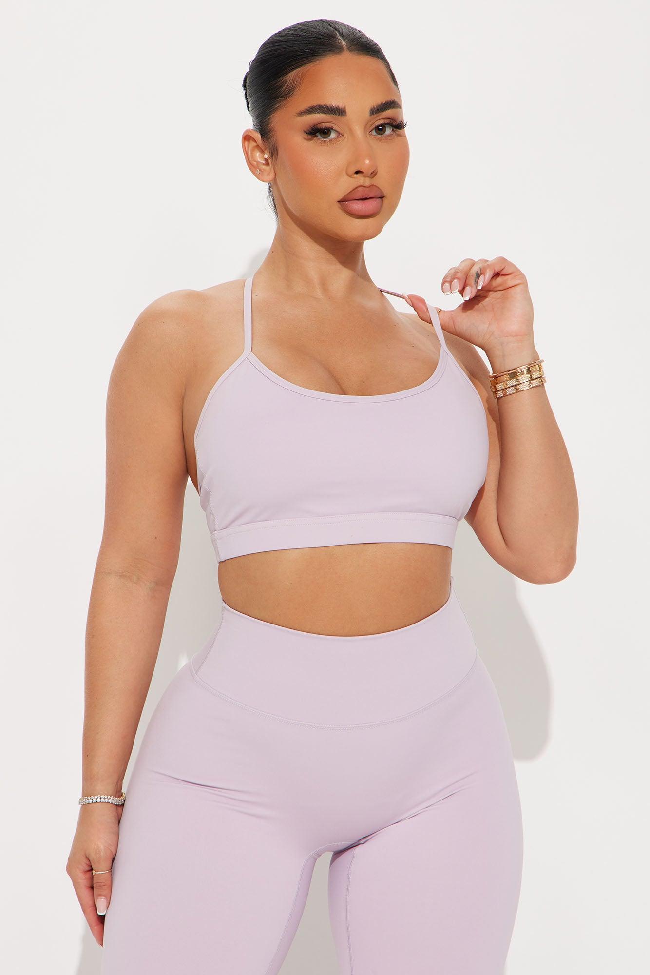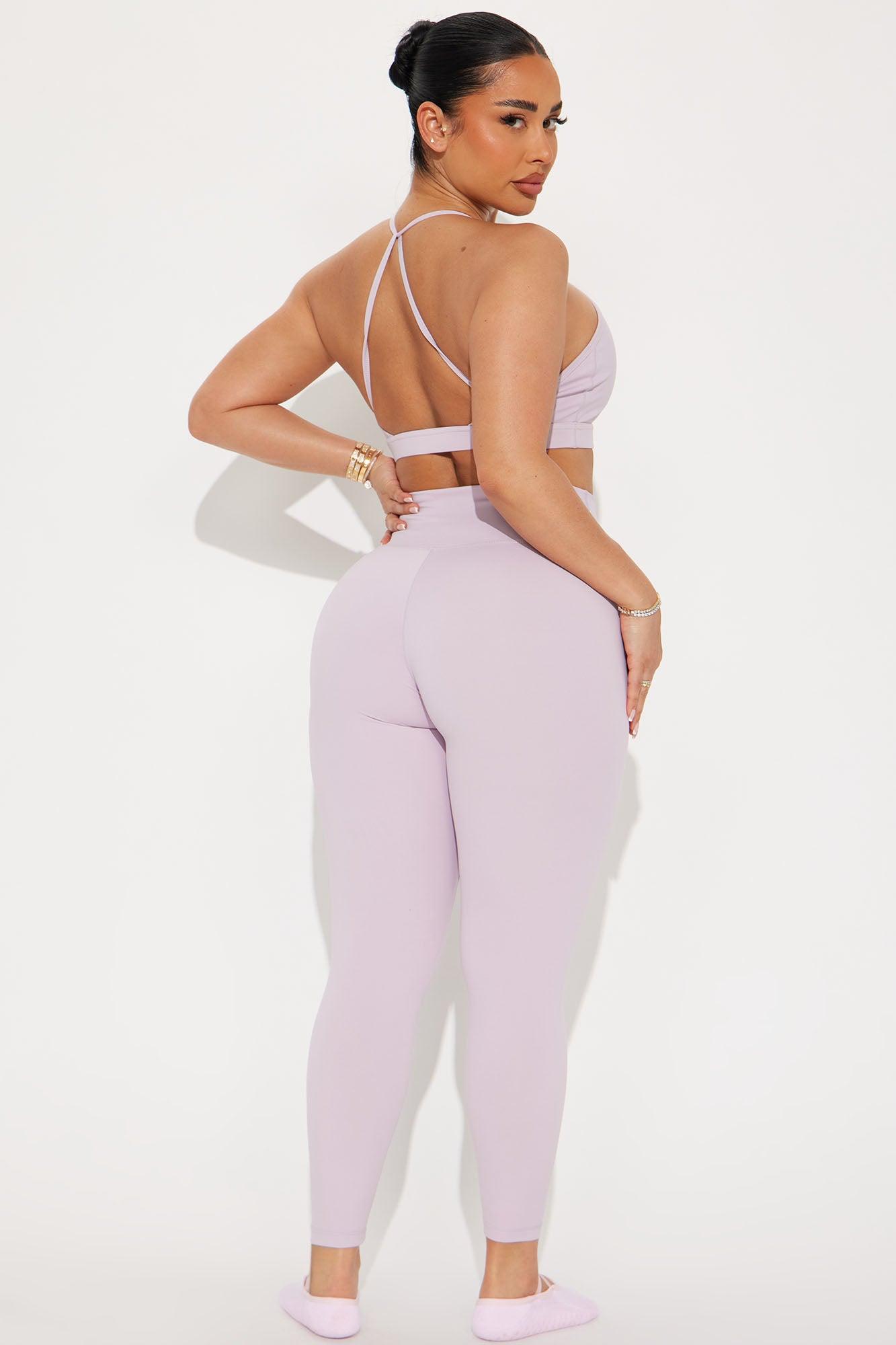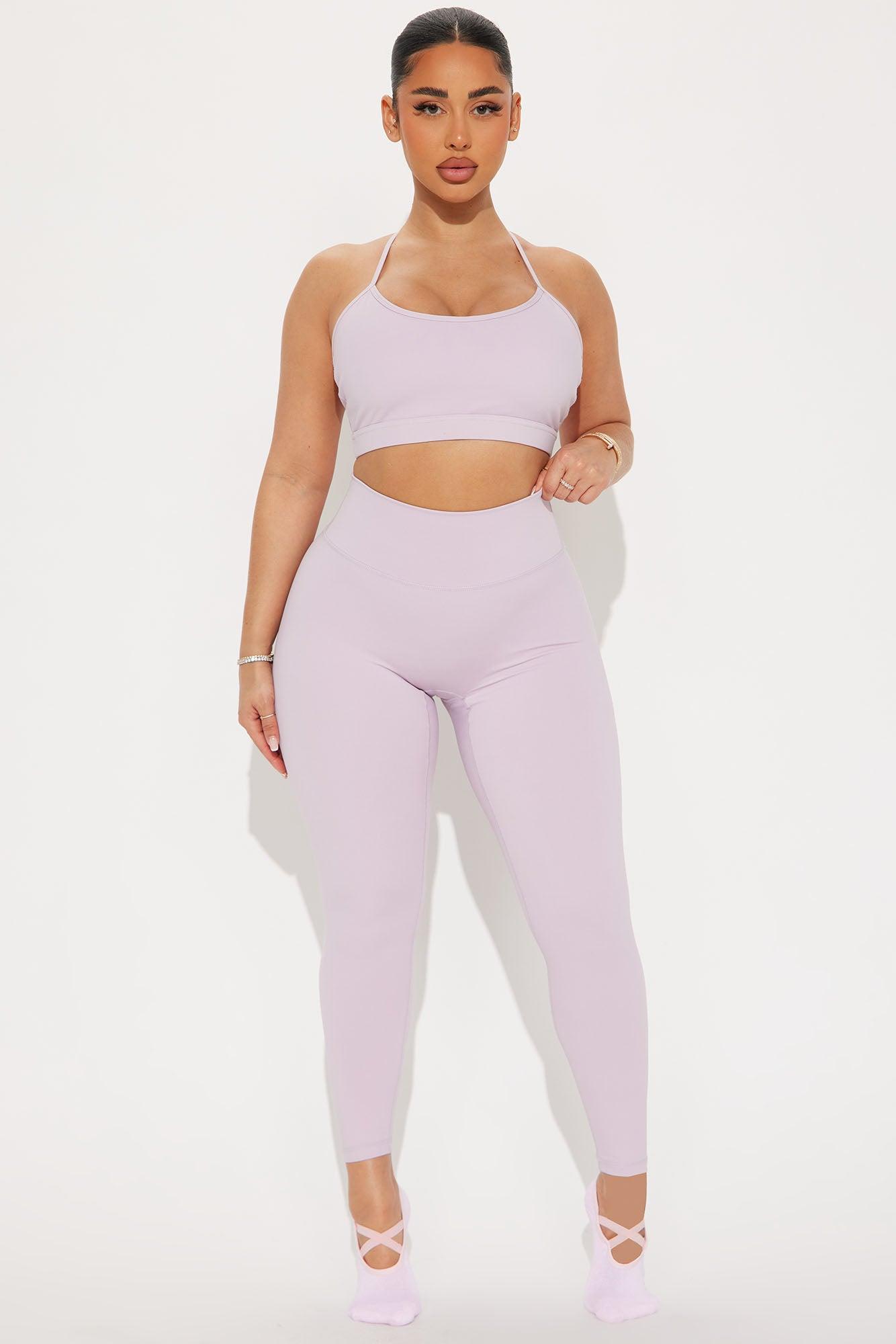 Available In Black And Lavender. Active Set Sports Bra Scoop Neck Sleeveless Active Legging High Waisted Elastic Waistband 25" Inseam Tricot, Low Impact Stretch Shell: 75% Nylon 25% Spandex Lining: 92% Polyester 8% spandex Leggings: 75% Nylon 25% Spandex Imported