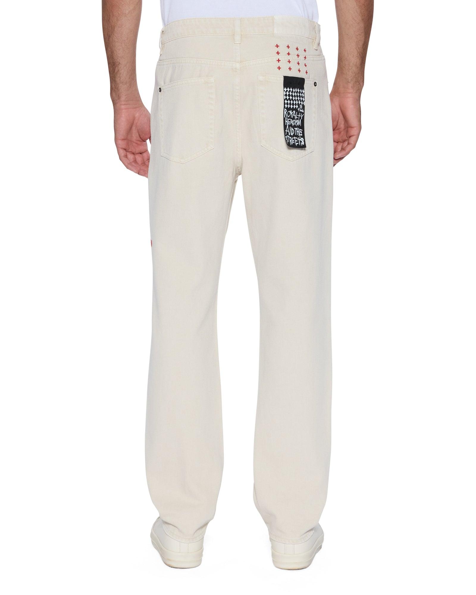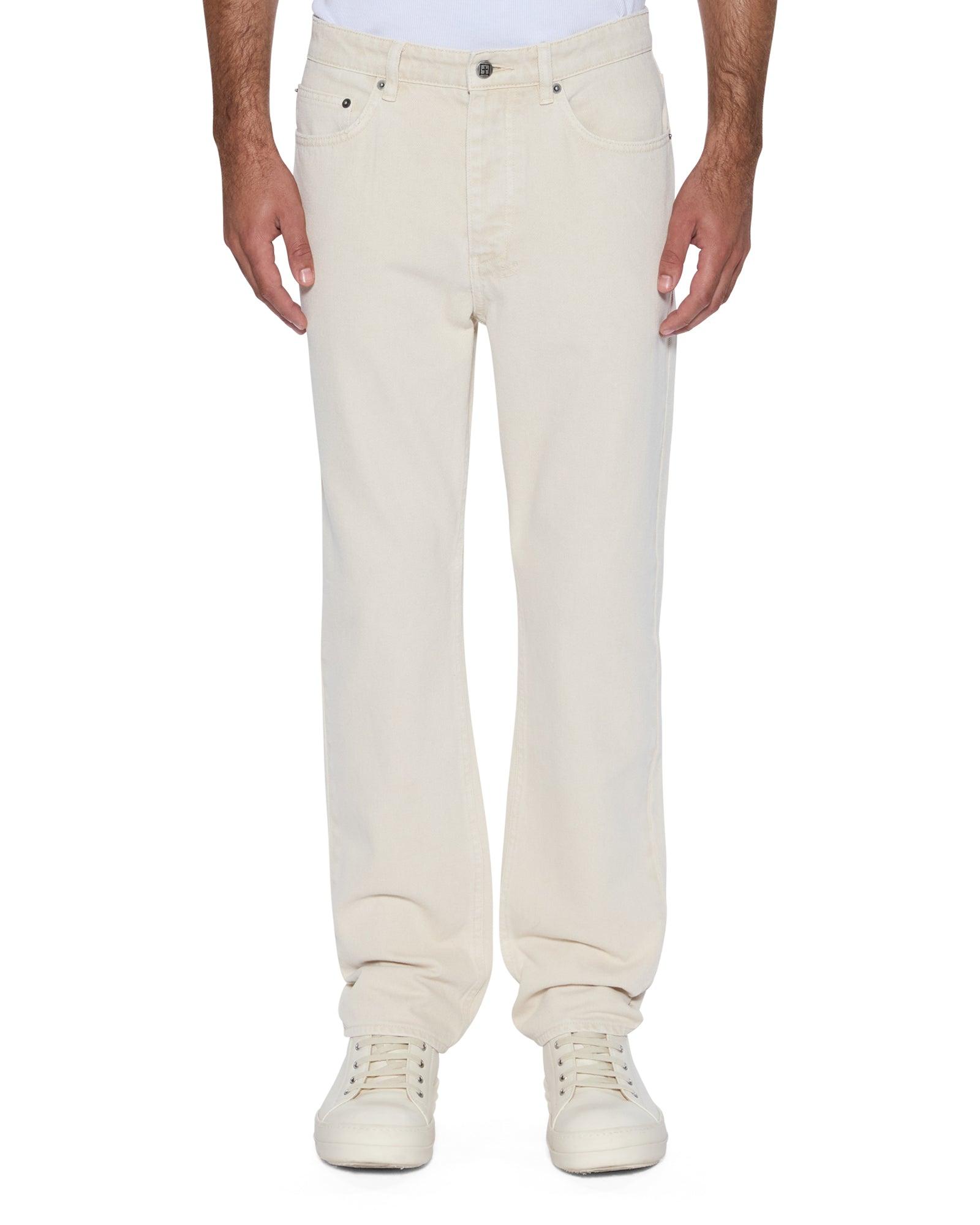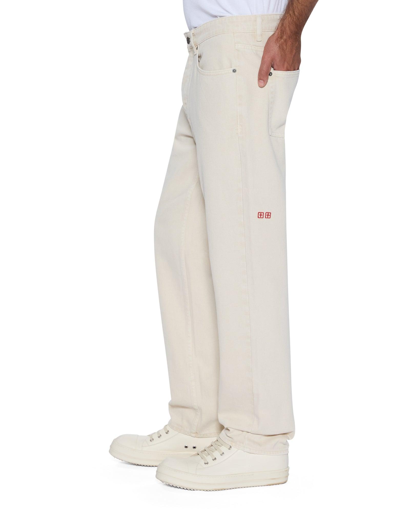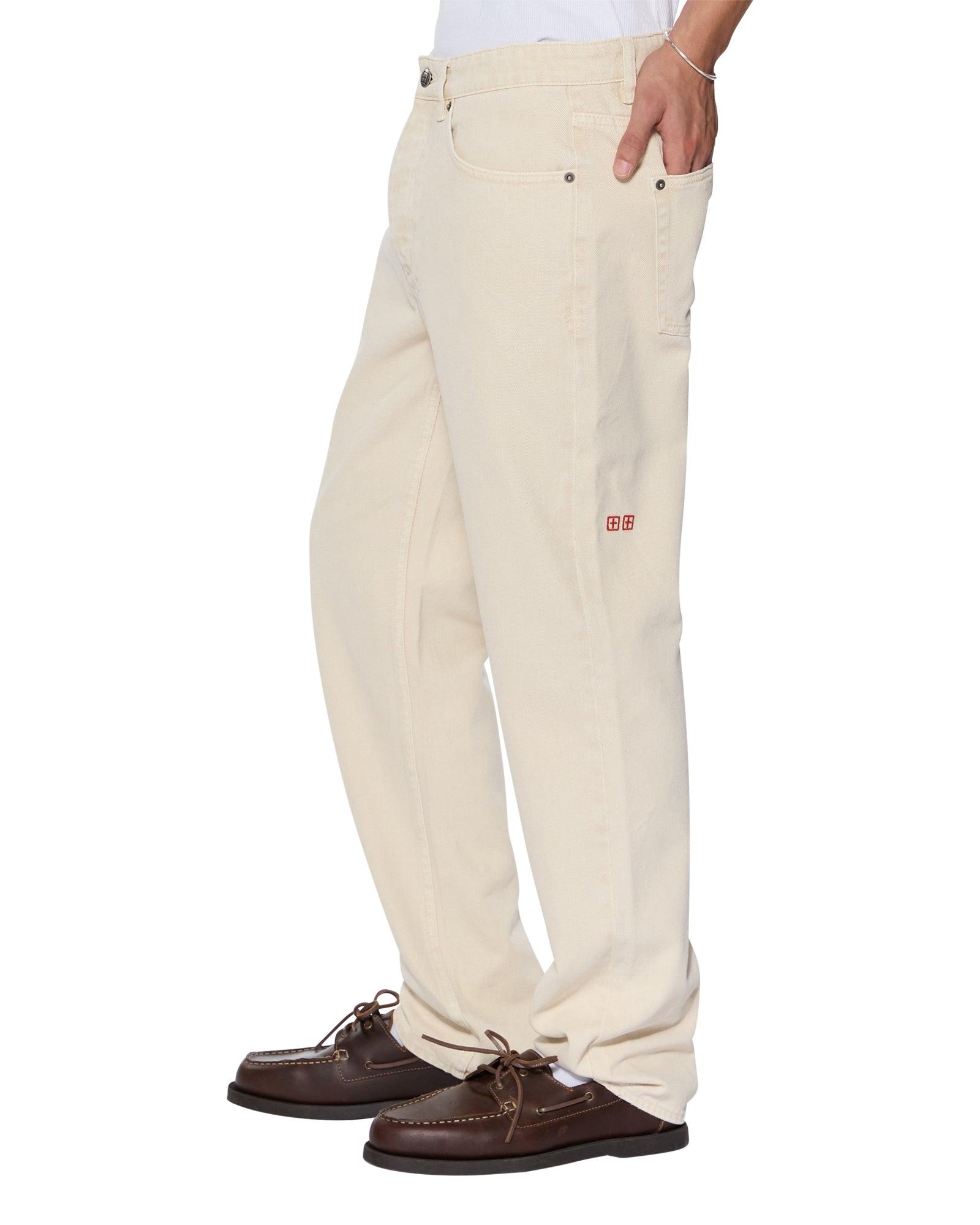 The Hazlow Ecru is a mid-rise relaxed straight leg with a regular leg opening. Made from rigid ecru colour denim with a light stone wash, it is finished with signature T-box and 4x4 embroidery, subtle ghost patching detailing, and Ksubi branded hardware.