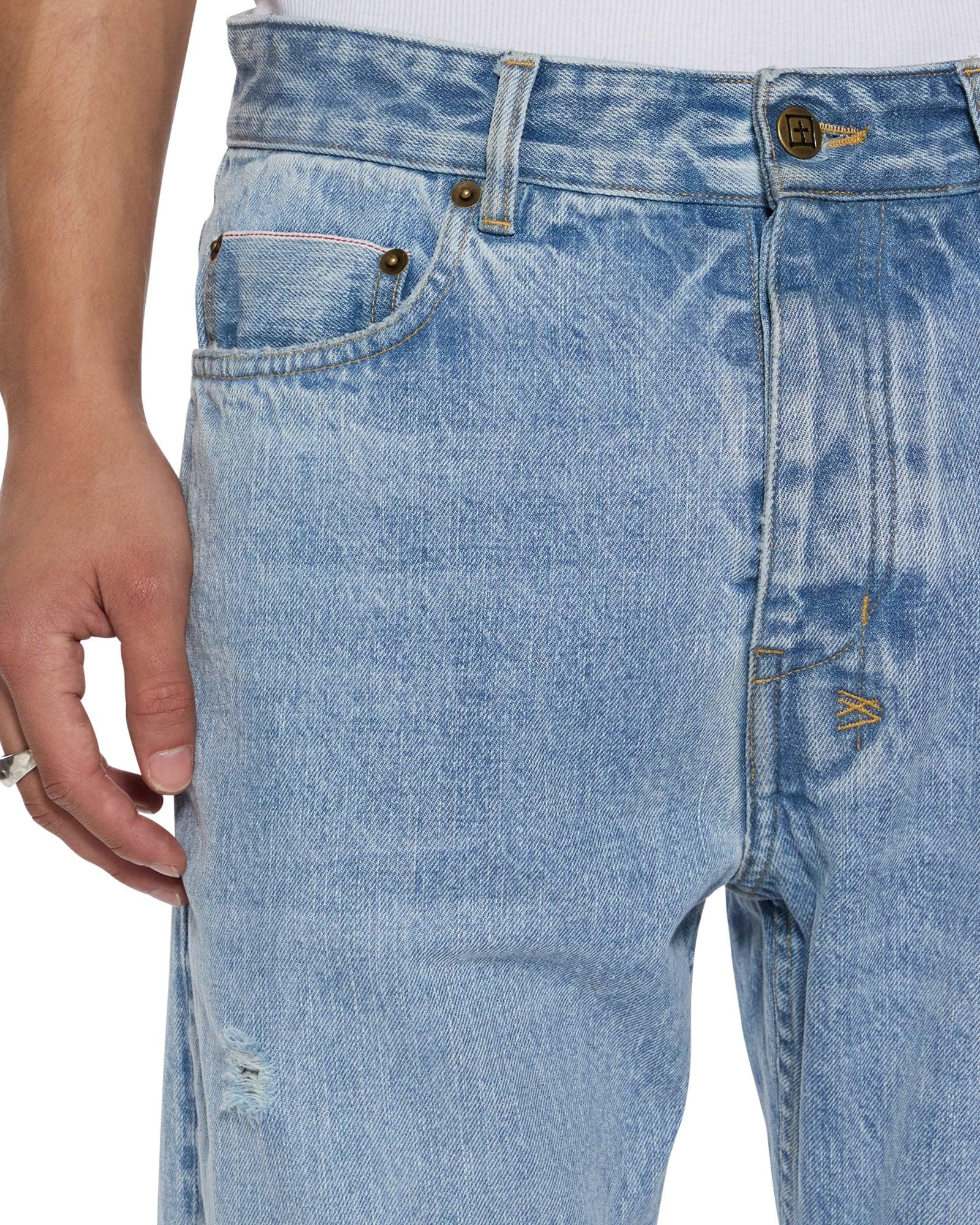 The Hazlow Selvedge Sydney Blue is a mid-rise relaxed straight-leg jean with a regular leg opening. Manufactured in Portugal with a sustainable approach to fabric and laundering processes, it is cut from a 15oz rigid European indigo selvedge denim in a light blue super stone wash. Features light abrasions and is finished with signature T-box and 4x4 embroidery, ghost patching detailing, and Ksubi branded hardware.