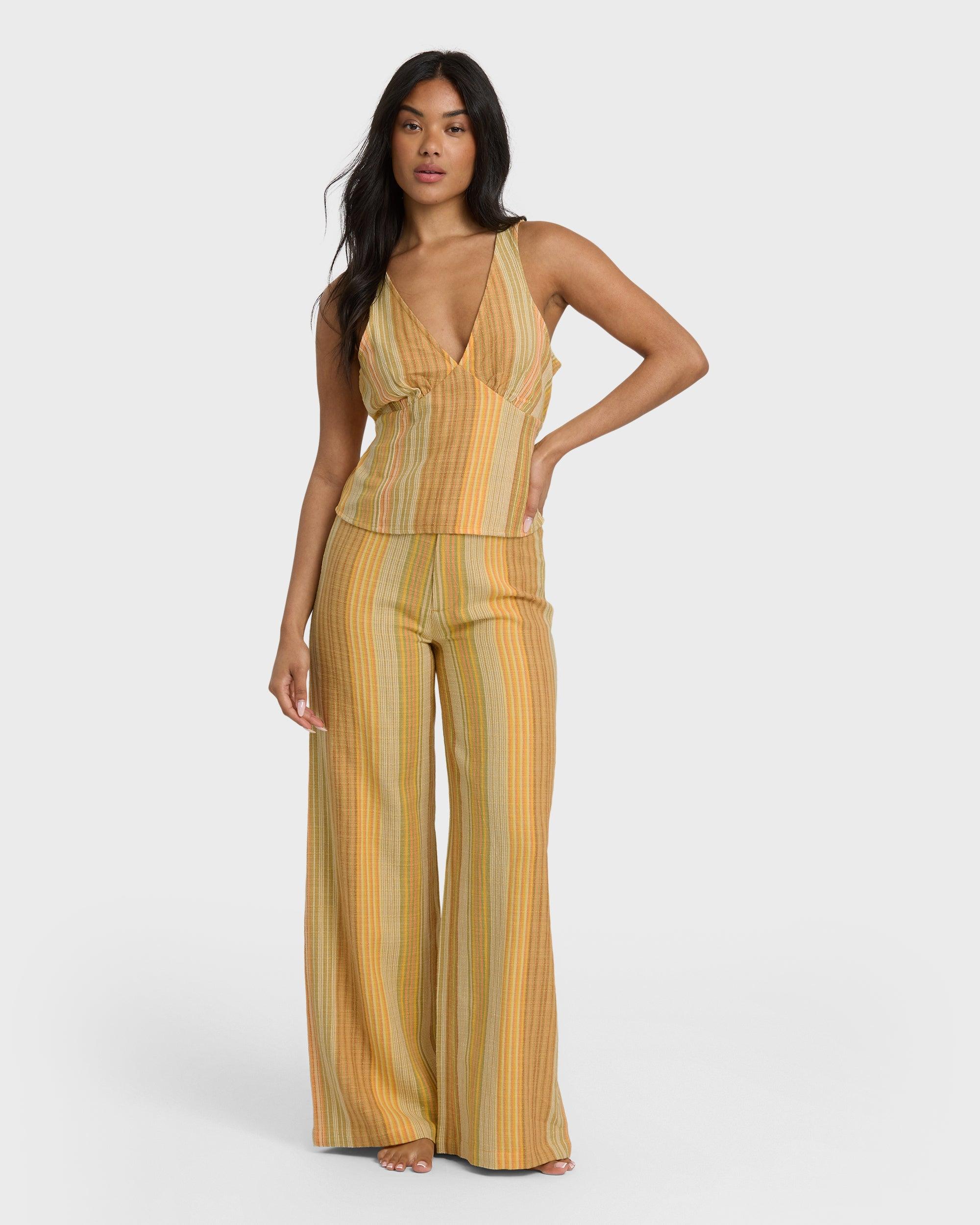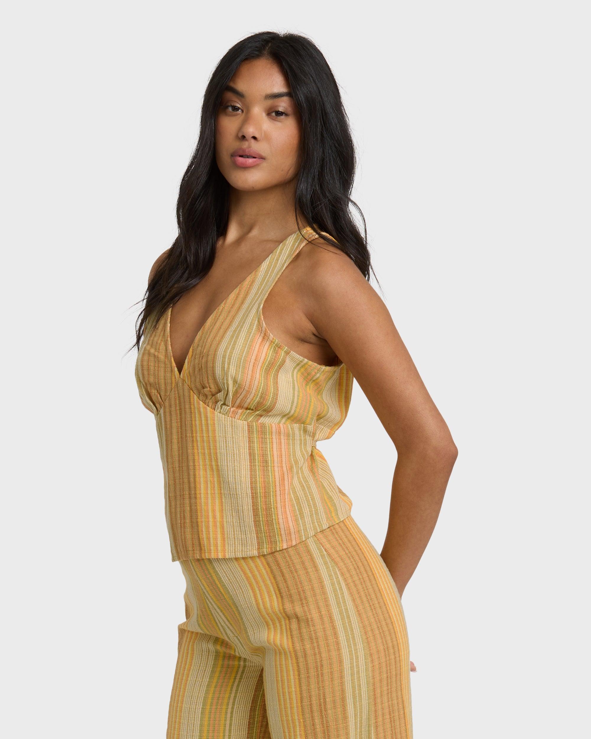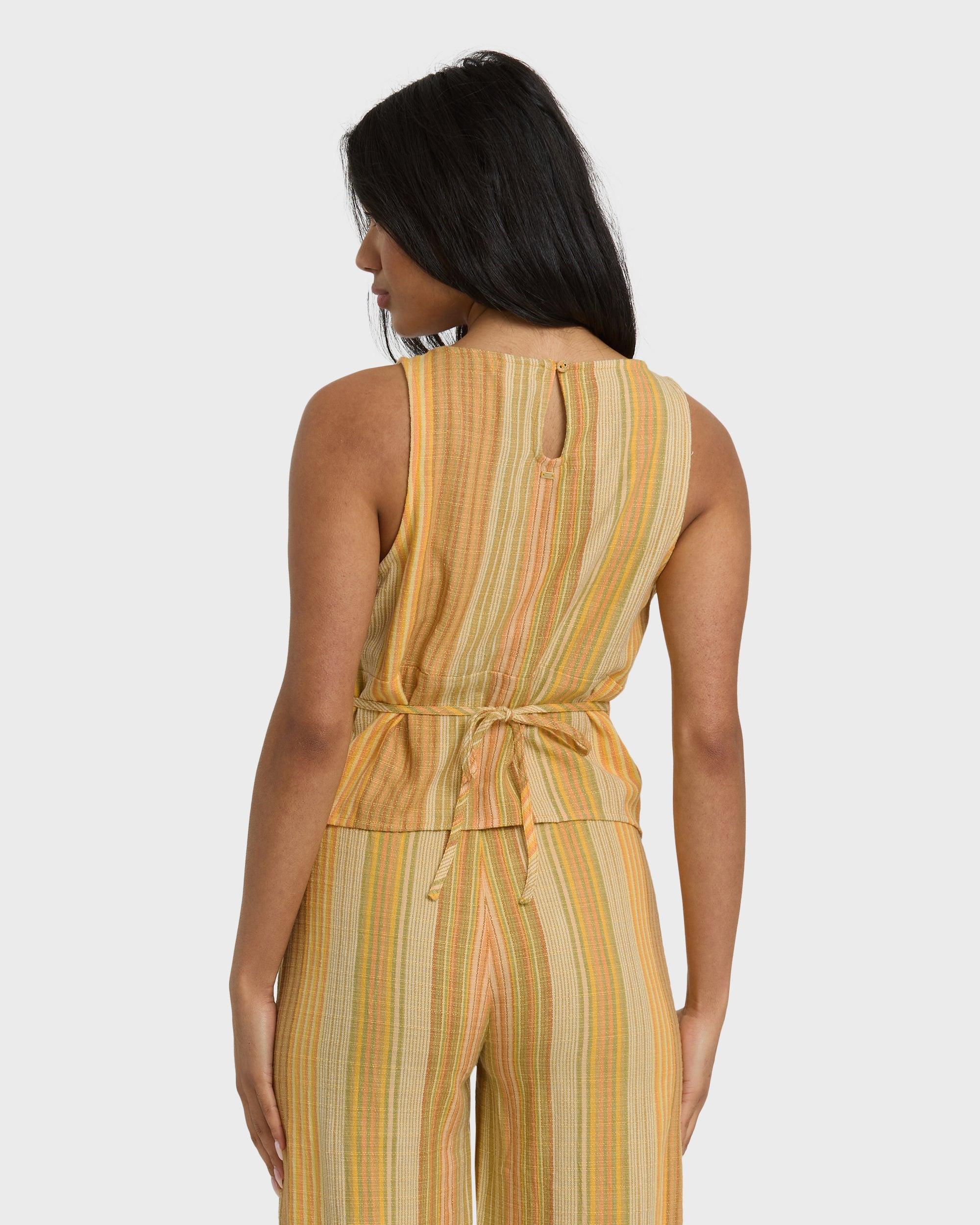 This breezy cropped top brings laid-back vibes with its cotton-blend fabric and subtle woven stripe pattern. Adjustable ties at the back waist let you customize your fit, while the keyhole button closure adds a sweet finishing touch. Our Hazy Daze Top pairs perfectly with high-waisted bottoms for sunny day style. Features Fabric: 50% viscose, 35%cotton, 15% flax, woven slub yd stripe Type: Cropped top Fit: Regular fit Features: Adjustable ties at back waist, keyhole with button at back neck Metal plate