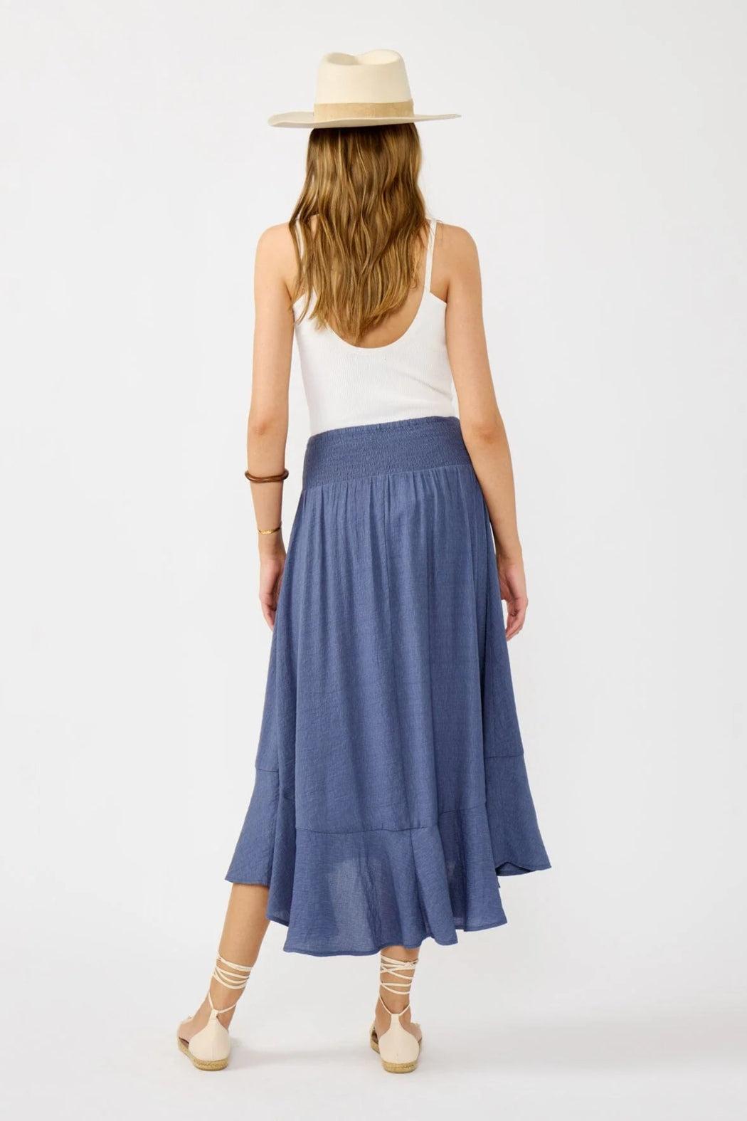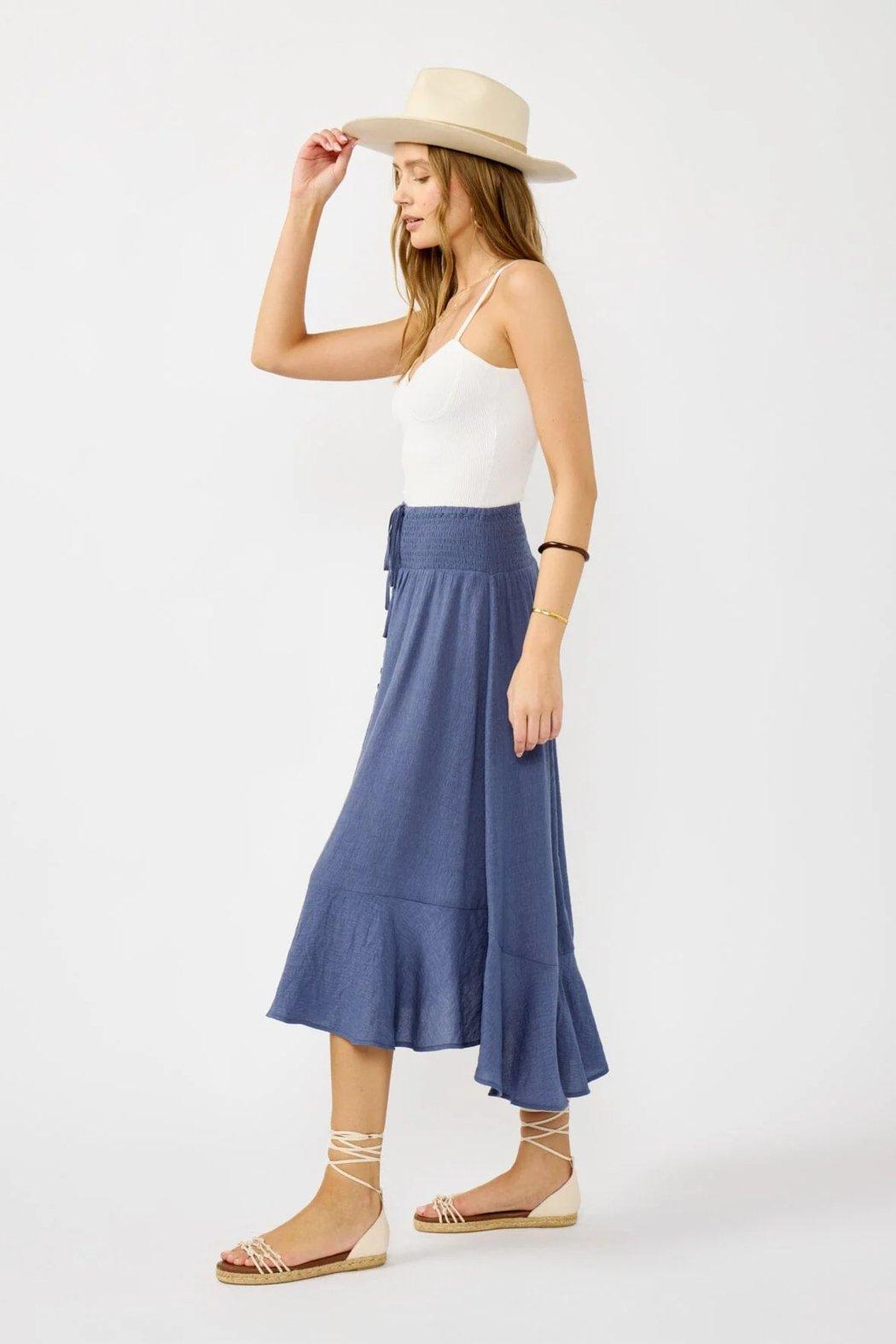 This effortlessly stylish boho skirt features a comfortable smocked waist and a breezy, natural swing that moves with you. Crafted from lightweight crinkled fabric, it’s finished with a charming button front and a self-tie detail for that extra touch of flair. The perfect throw-on-and-go piece for beach days or casual brunch dates.