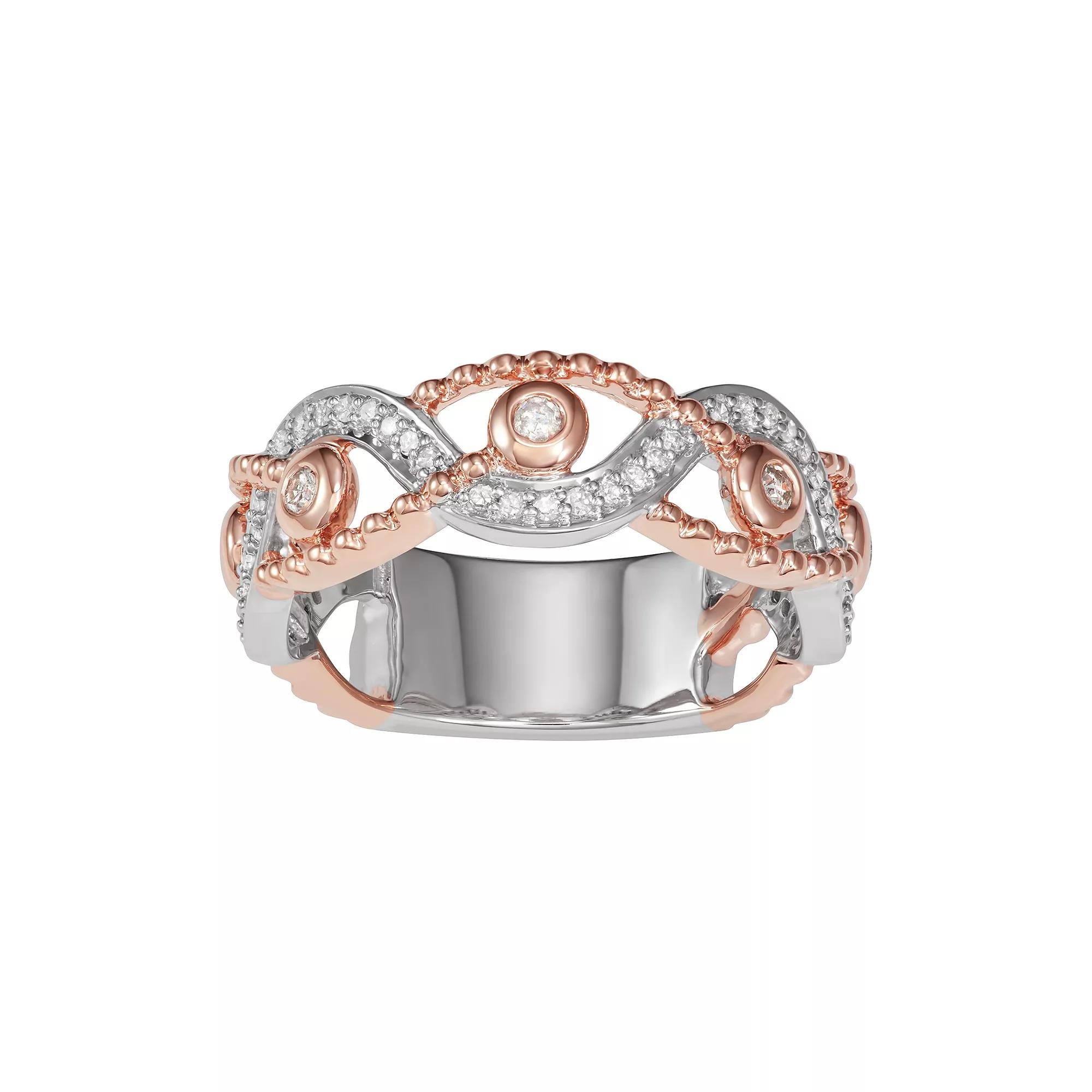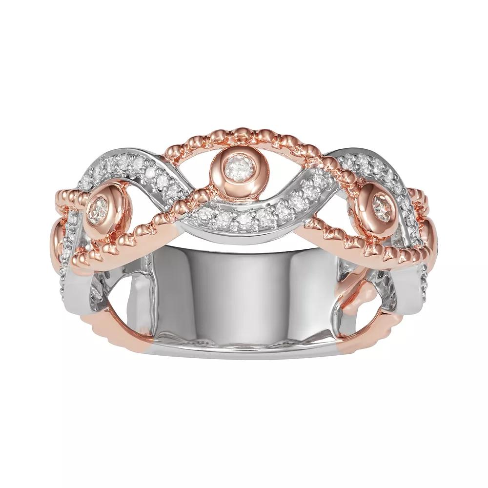 Adorned with a swirl motif lined with round-cut diamonds, this two-tone ring is sure to convey your commitment in a beautiful way. RING DETAILS Width: 0.27 in. Metal: 10k rose gold, 10k white gold Packaging: boxed DIAMOND DETAILS Total weight: 1/4 ct. Clarity: I1-I2 Color grade: H-I Shape: round Setting: bezel, prong Gemstones may have been treated to enhance their appearance. Special care may be required. Please visit our Gemstone Treatment & Special Care Guide for more information.Image(s) may be enlarged to show detail.Diamond weights are approximate. Diamond total weights may vary between .01 and .08 ct. Some diamonds have fewer than 17 facets.Please note, due to the high value of this item, a signature may be required upon delivery. Size: 6. Gender: female. Age Group: adult.