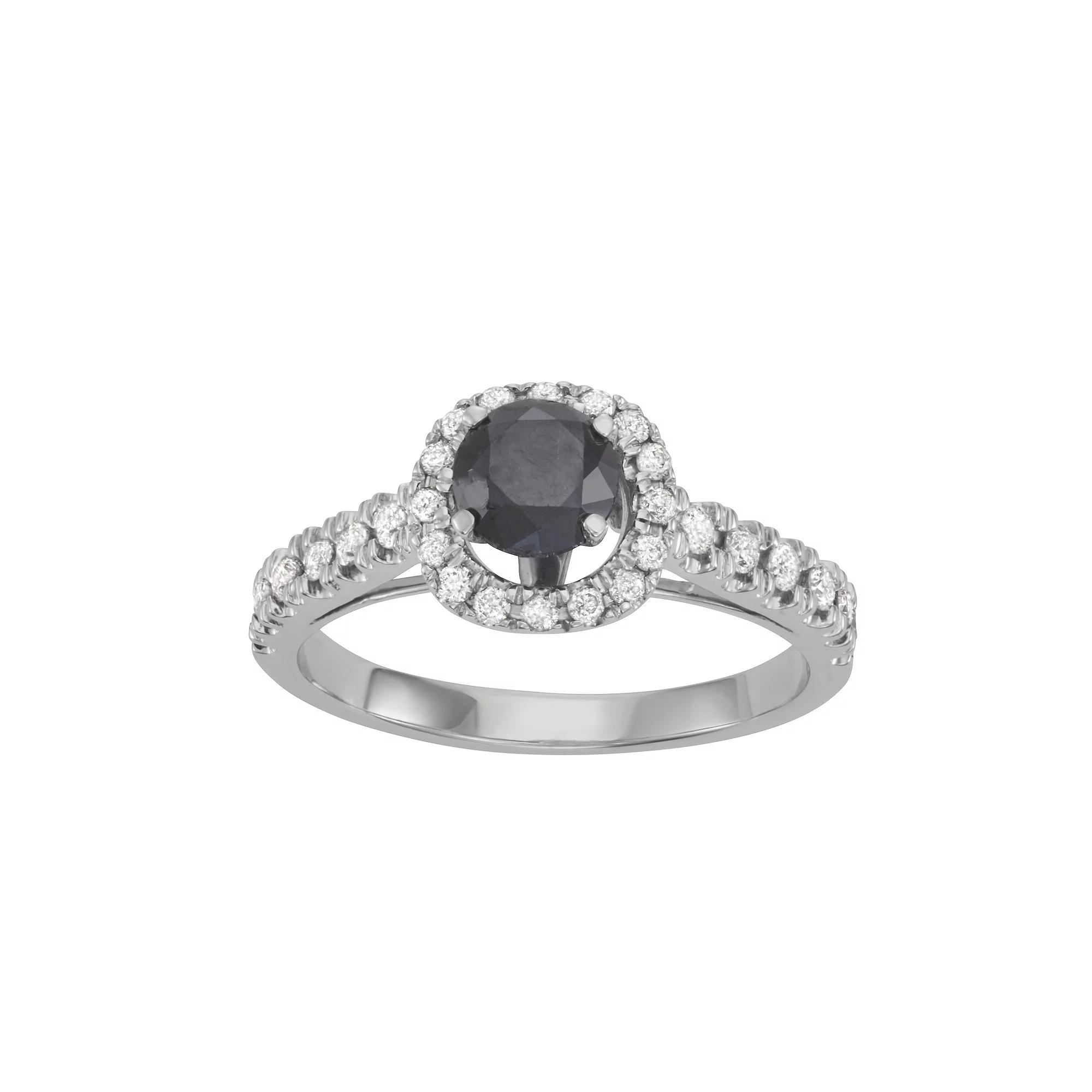 Featuring a round-cut black diamond center stone surrounded by white diamond accents in a halo motif, this sterling silver ring is impressive. Featuring a round-cut black diamond center stone surrounded by white diamond accents in a halo motif, this sterling silver ring is impressive. Width: 2.25 mm Nickel free Metal: 10k white gold Finish: polished Packaging: boxedDIAMOND DETAILS Total weight: 1 1/2 ct. Center stone weight: 1 ct. Color: black, white Shape: round Setting: prong Gemstones may have been treated to enhance their appearance. Special care may be required. Please visit our Gemstone Treatment & Special Care Guide for more information. Image(s) may be enlarged to show detail. Please note, due to the high value of this item, a signature may be required upon delivery. Size: 7. Gender: female. Age Group: adult.