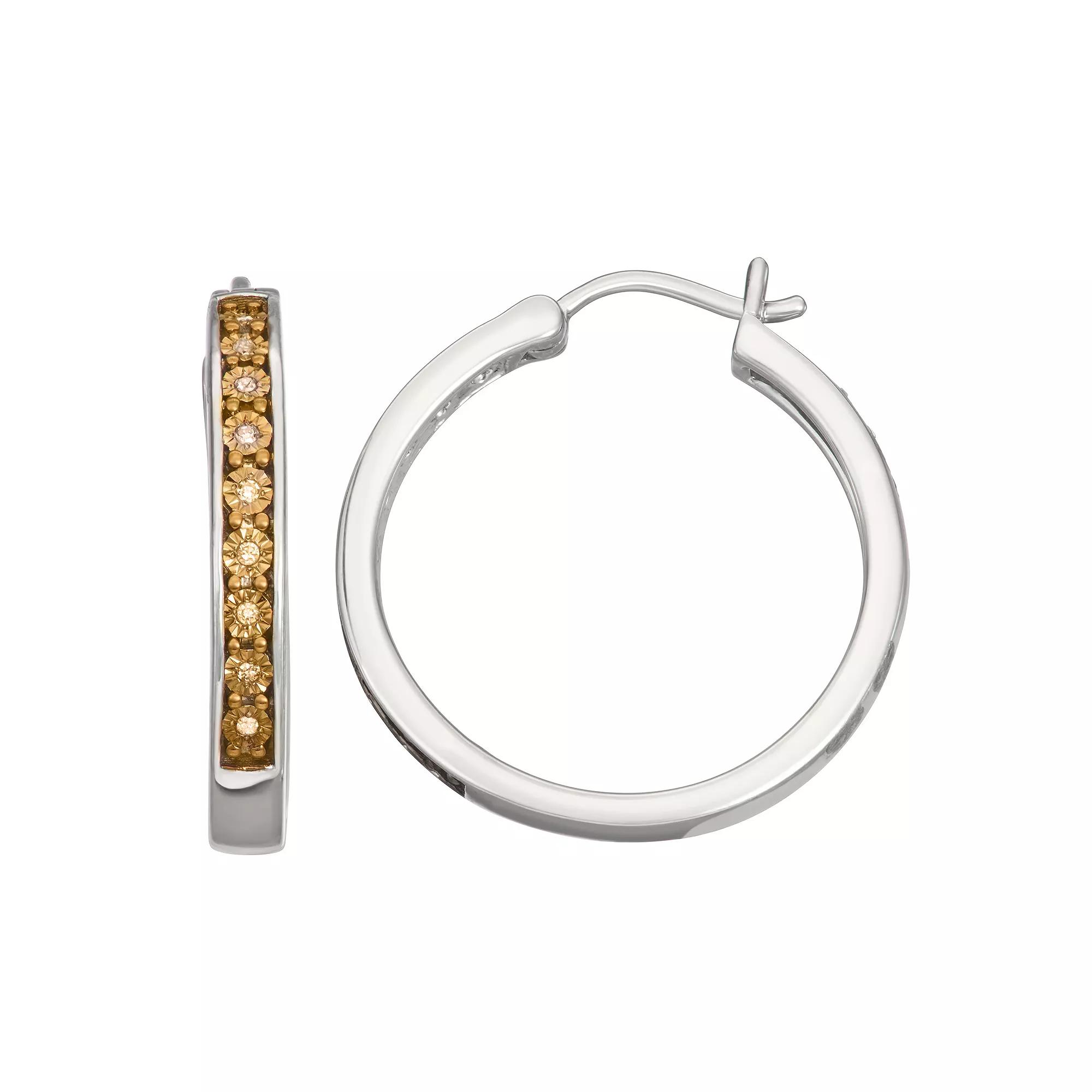 Adorned with brown diamonds, these hoop earrings by HDI are a unique accessory that complements any outfit. Adorned with brown diamonds, these hoop earrings by HDI are a unique accessory that complements any outfit. Nickel free Metal: sterling silver Backings: clip-on Packaging: boxed Plating: rhodium Finish: polished Diameter: 23.11 mmDIAMOND DETAILS Total weight: 1/10 ct. Color: brown Shape: round Setting: illusion/miracle, prong Diamond weights are approximate. Diamond Total Weights may vary between .01 and .13 ct. Some diamonds consist of fewer than 17 facets. Gemstones may have been treated to enhance their appearance. Special care may be required. Please visit our Gemstone Treatment & Special Care Guide for more information. Image(s) may be enlarged to show detail. Please note, due to the high value of this item, a signature may be required upon delivery. Size: One Size. Color: White. Gender: female. Age Group: adult.