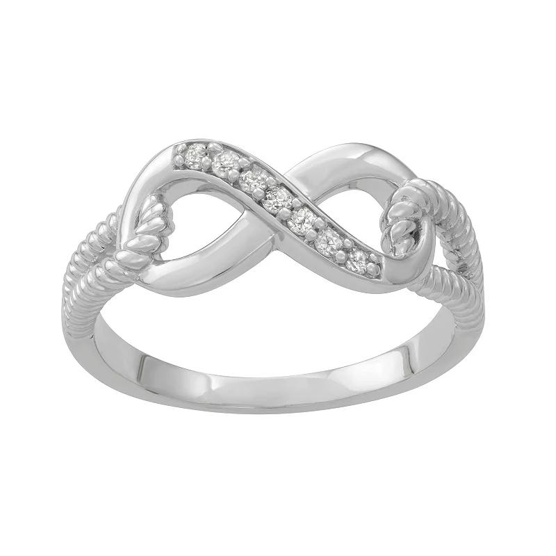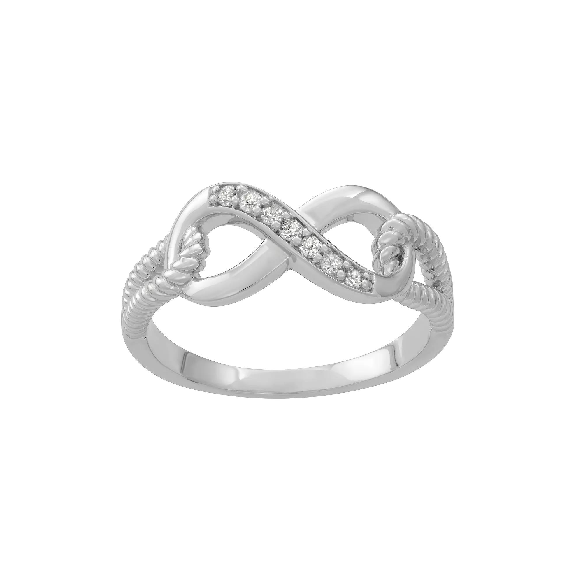 Featuring a cluster of diamonds in an infinity shape, this sterling silver promise ring is a beautiful symbol of your commitment. Click on this JEWELRY & WATCHES GUIDE to learn about fit, styles, materials and more! Featuring a cluster of diamonds in an infinity shape, this sterling silver promise ring is a beautiful symbol of your commitment. Click on this JEWELRY & WATCHES GUIDE to learn about fit, styles, materials and more! FEATURES Diameter: 7.90mm Sizes: 5-9 Band fit: comfort fit Metal: sterling silver Plating: rhodium Finish: polished Packaging: boxed Nickel freeDIAMOND DETAILS Total weight: 1/10 ct. Shape: round Setting: prong Grade: H-I Clarity: 11, 12 Diamond equivalent carat (ct.) Total Weight (T.W.) represents the approximate total weight of diamonds of equivalent appearance. Gemstones may have been treated to enhance their appearance. Special care may be required. Please visit our Gemstone Treatment & Special Care Guide for more information. Image(s) may be enlarged to show detail. Please note, due to the high value of this item, a signature may be required upon delivery. Color: White. Gender: female. Age Group: adult.